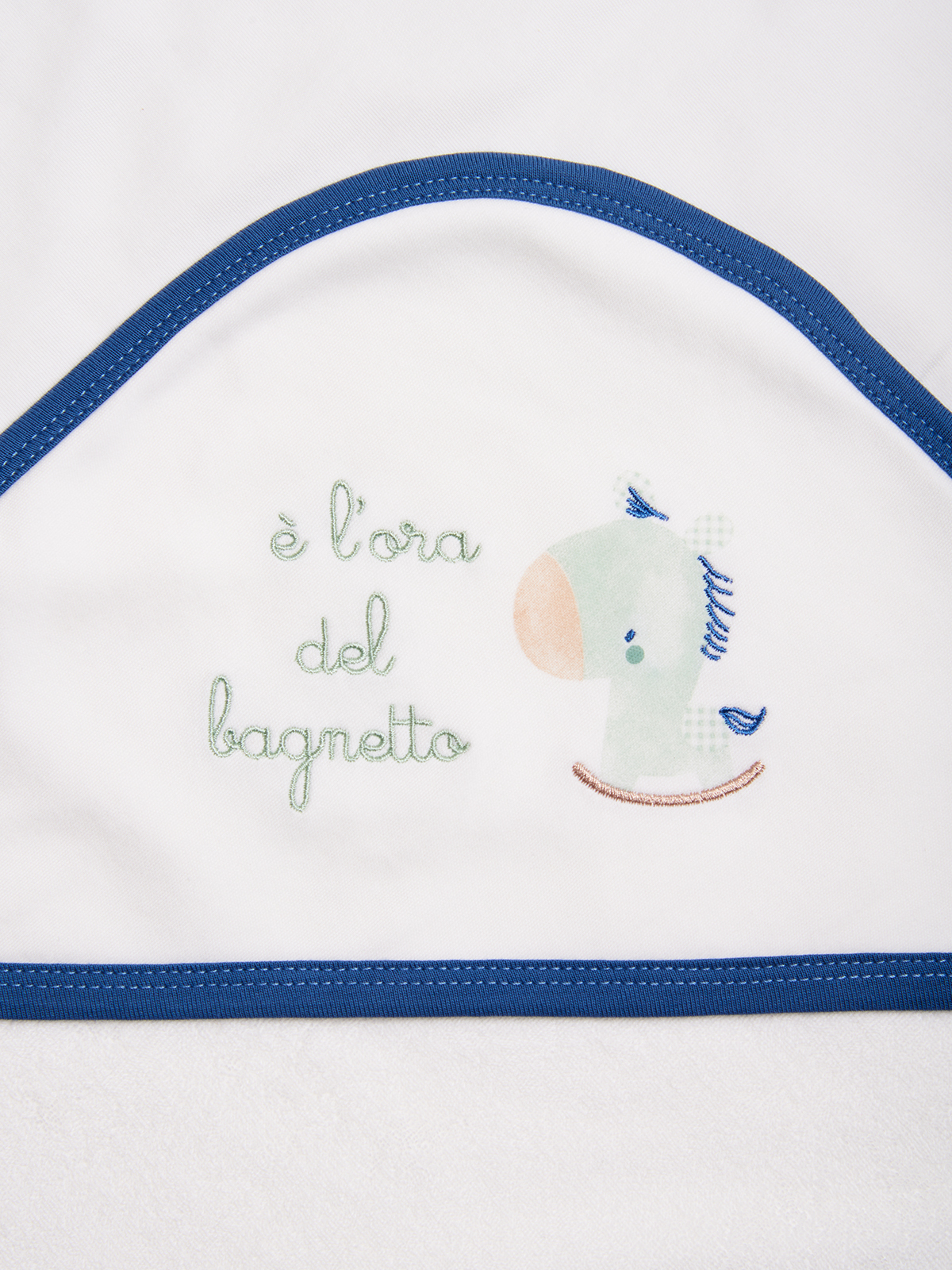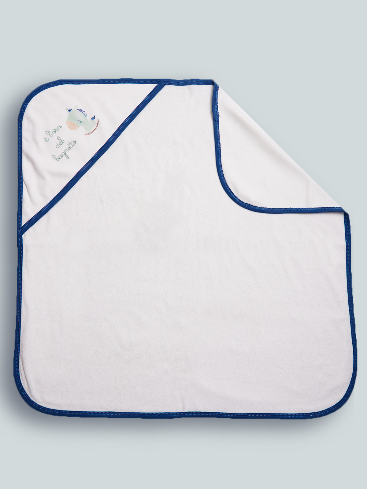 Avvolgente asciugamano con la quale potrai asciugare il tuo neonato dopo il bagnetto. Tessuto spugna 100% cotone. Elemento decorativo: grafica ricamata e stampata. Questo accessorio fa parte del corredino composto da tutti gli articoli indispensabili per il tuo neonato.