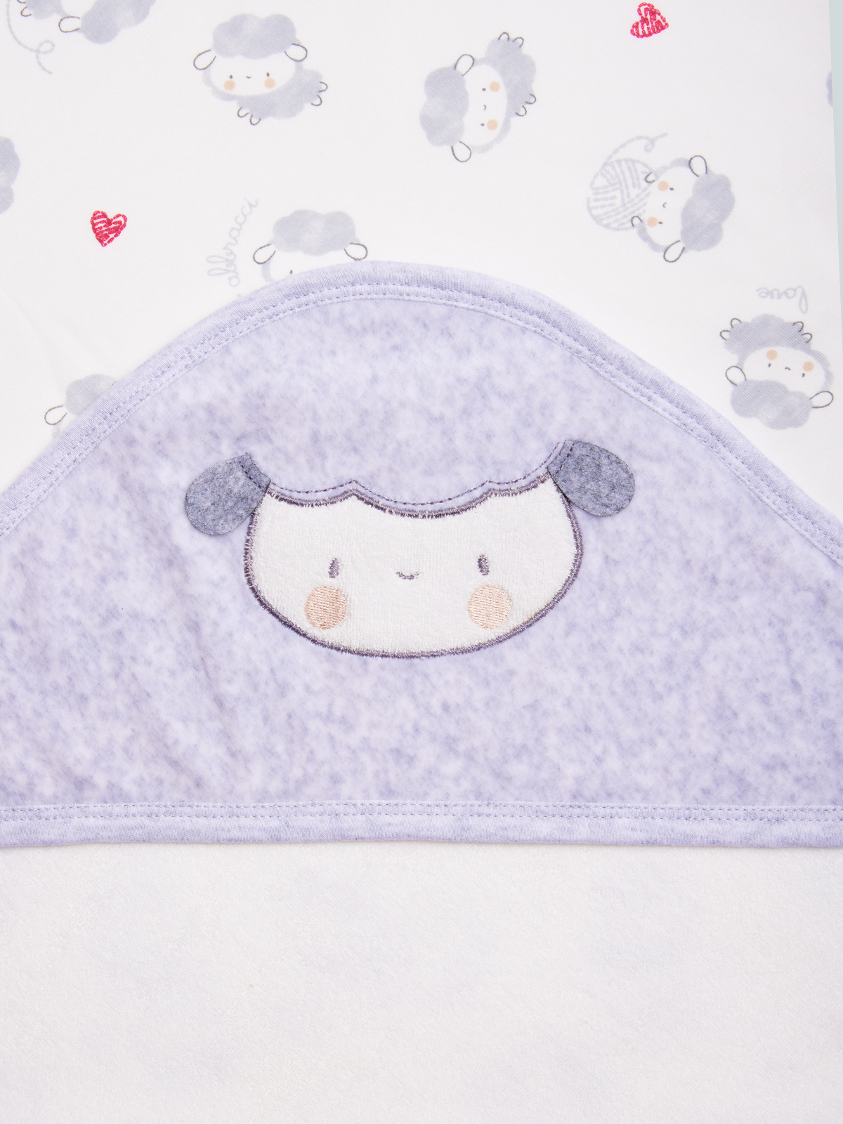 Avvolgente asciugamano con la quale potrai asciugare il tuo neonato dopo il bagnetto. Tessuto spugna 100% cotone. Elemento decorativo: ricamo pecora e orecchie 3D. Questo accessorio fa parte del corredino composto da tutti gli articoli indispensabili per il tuo neonato.