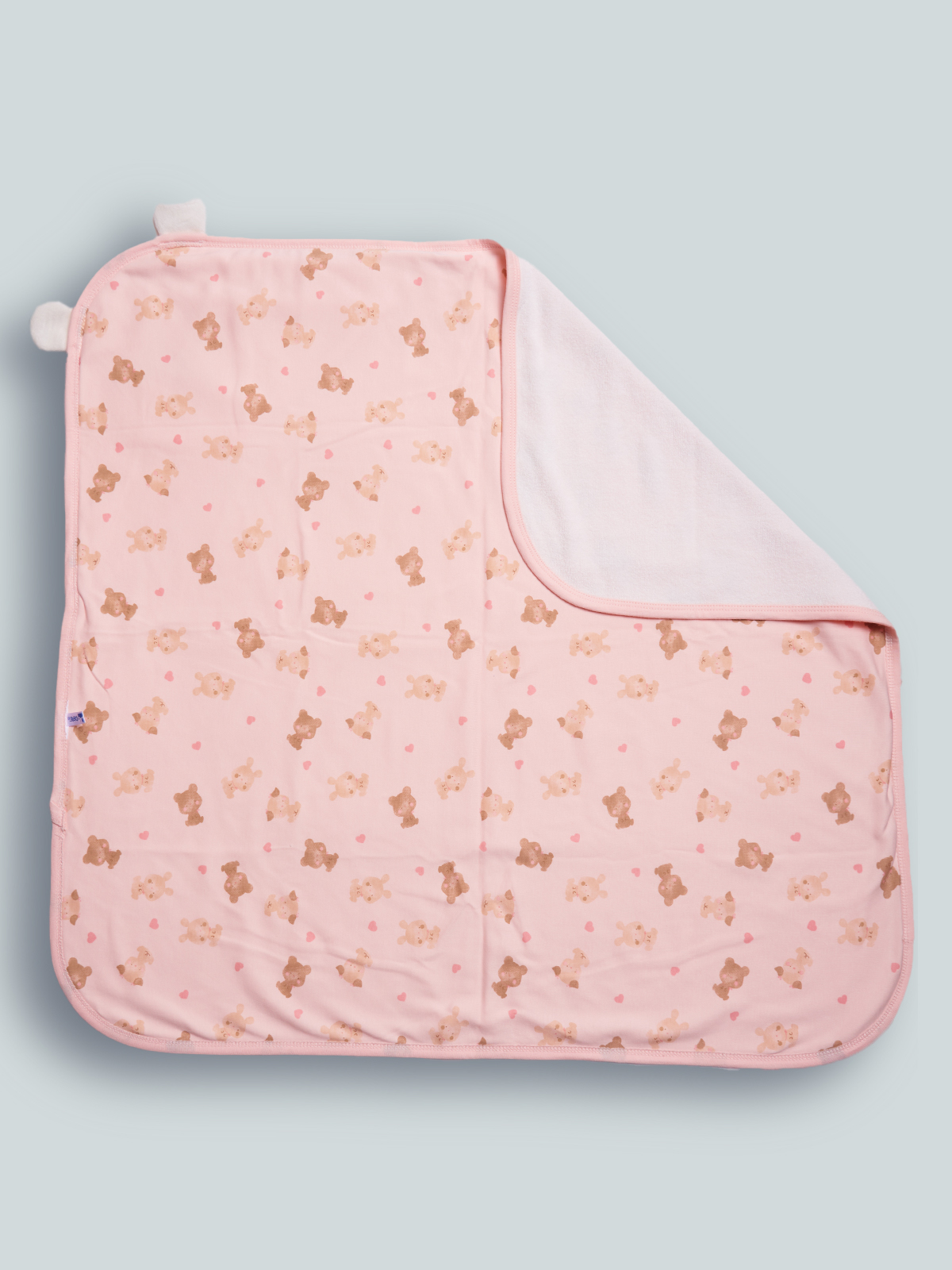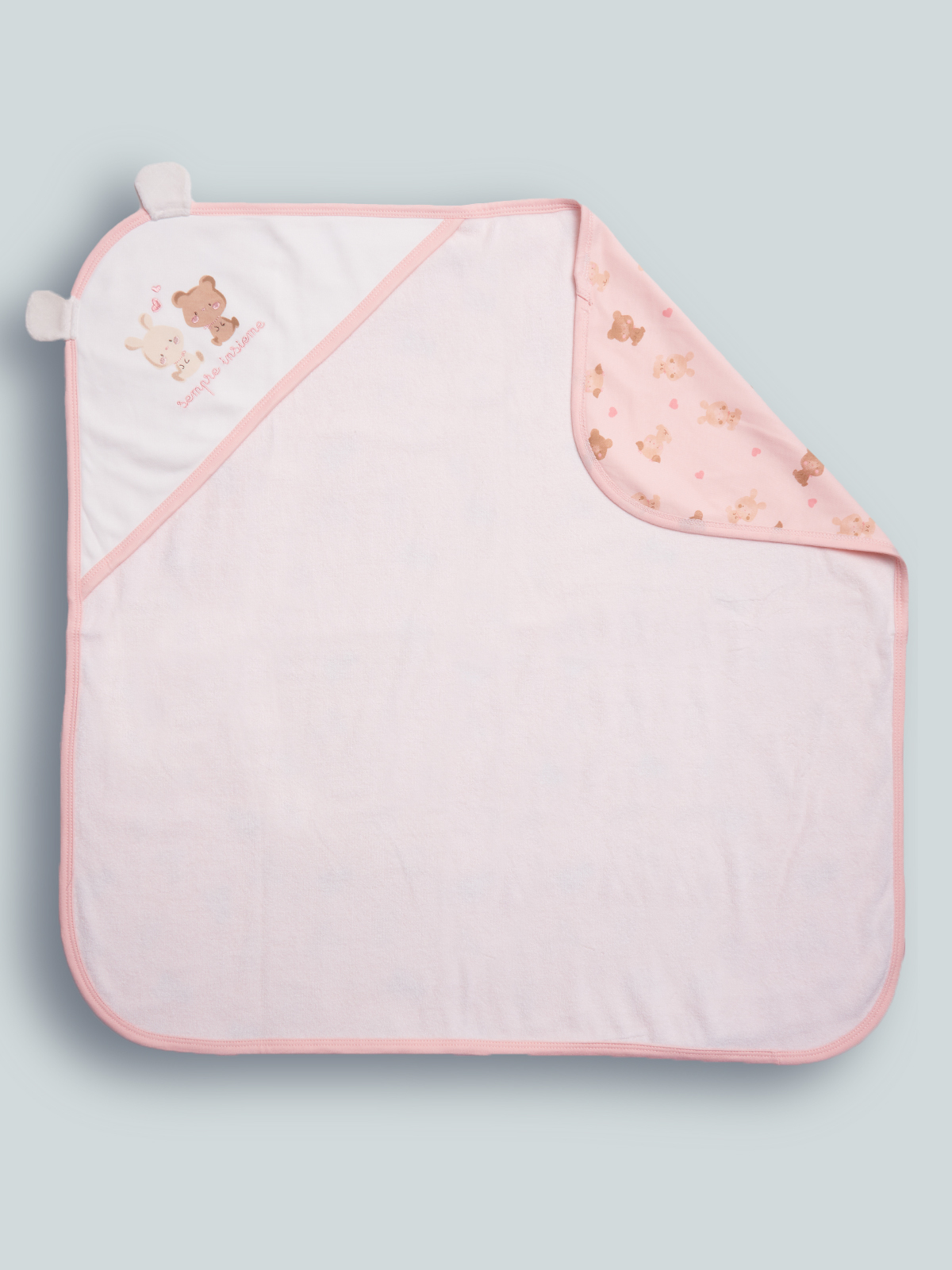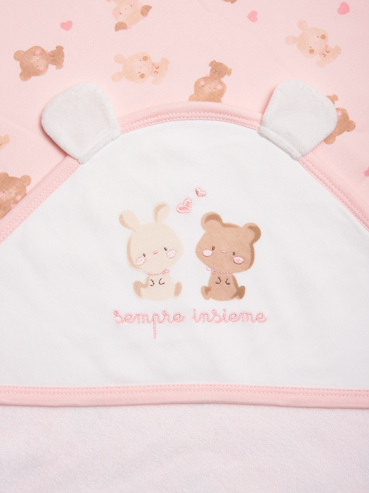 Avvolgente asciugamano con la quale potrai asciugare il tuo neonato dopo il bagnetto. Tessuto spugna 100% cotone. Elemento decorativo: grafica ricamata e stampata, orecchie 3D. Questo accessorio fa parte del corredino composto da tutti gli articoli indispensabili per il tuo neonato.