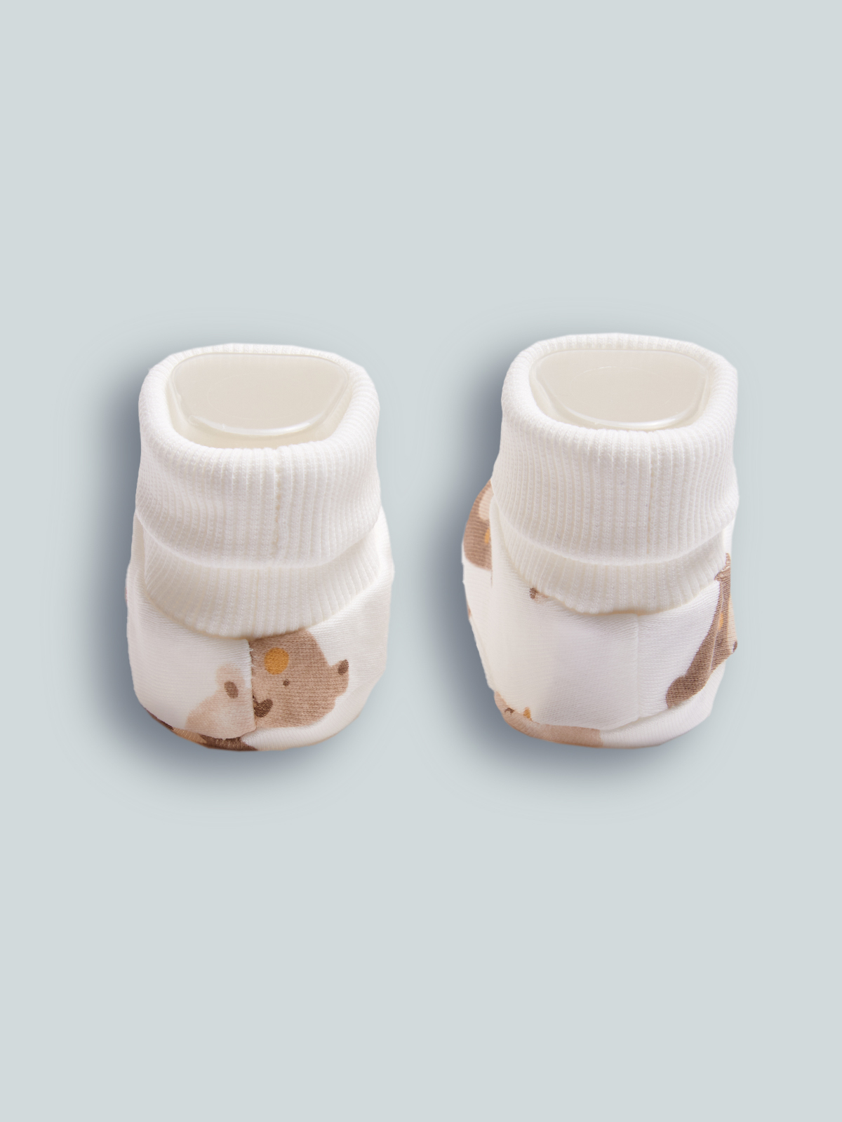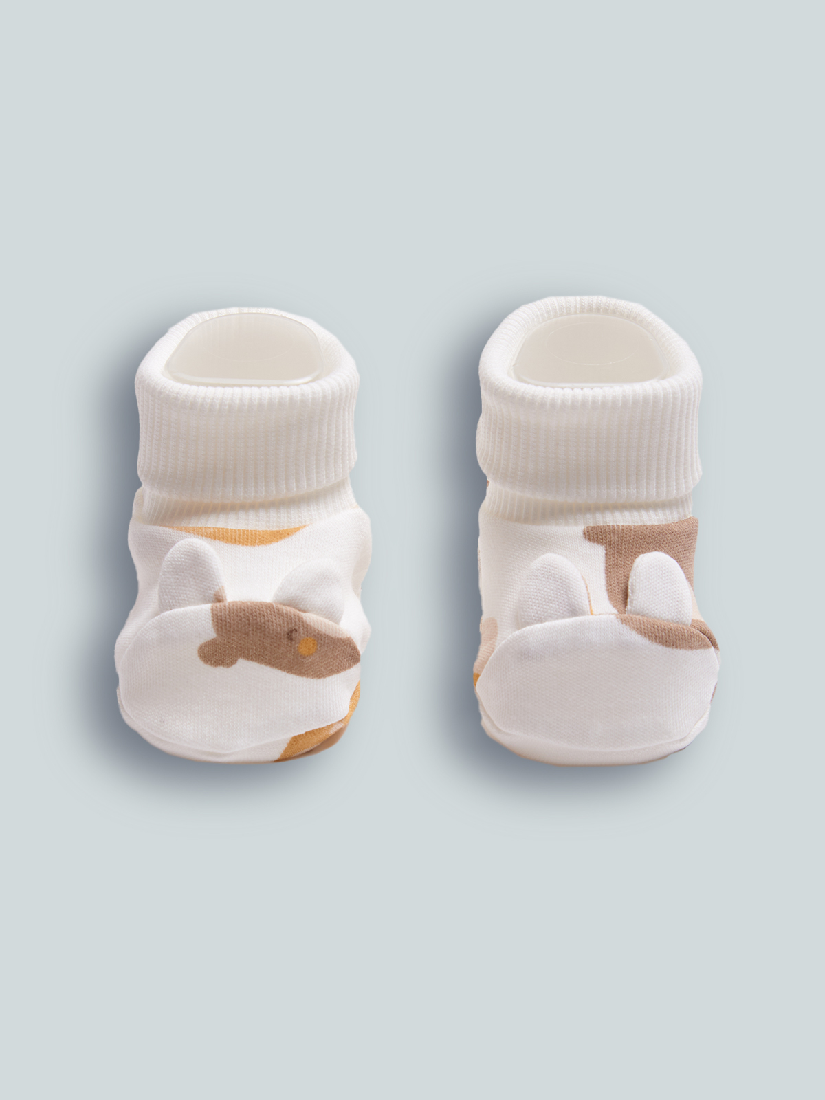 Babbuccia in caldo cotone stampato fantasia con orecchie 3D. Questo accessorio fa parte del corredino composto da tutti gli articoli indispensabili per il tuo neonato.