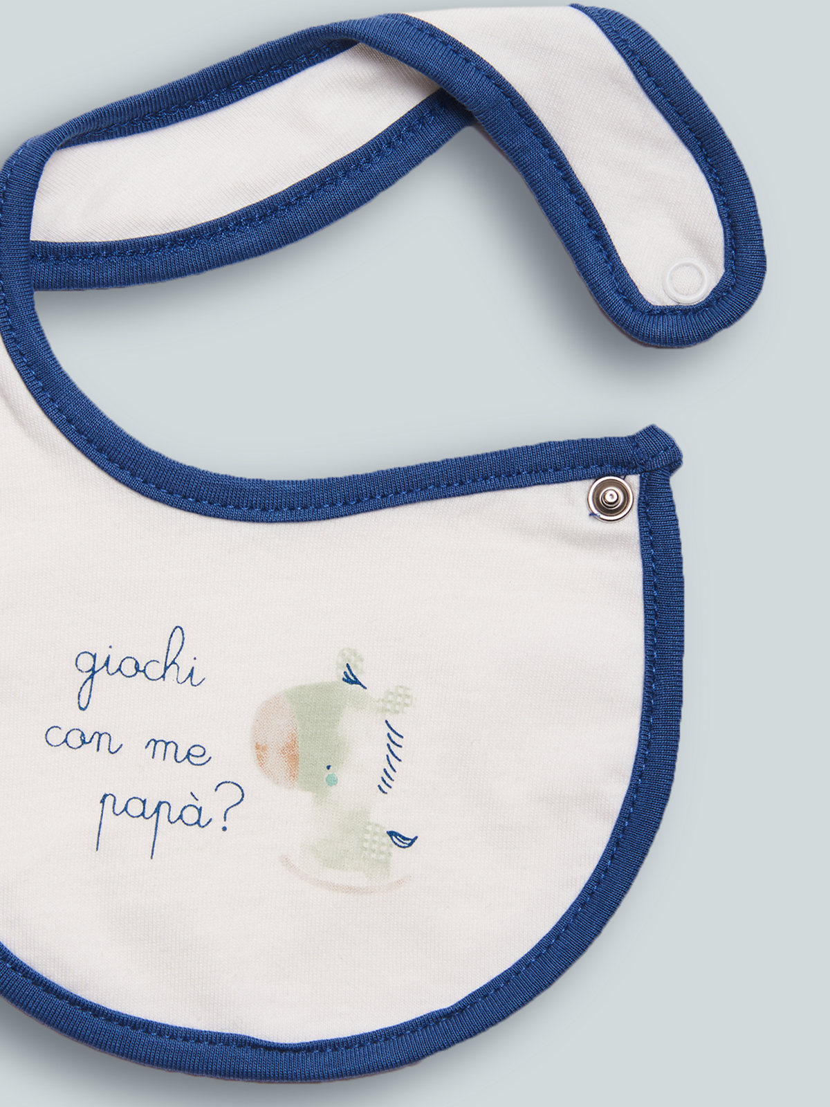 Bavetta in cotone decorato con stampa riproposta su altri articoli per completare il tuo corredino. Dotato di un pratico bottone a pressione sulla parte laterale per agevolarne l’indosso. Questo accessorio fa parte del corredino composto da tutti gli articoli indispensabili per il tuo neonato.