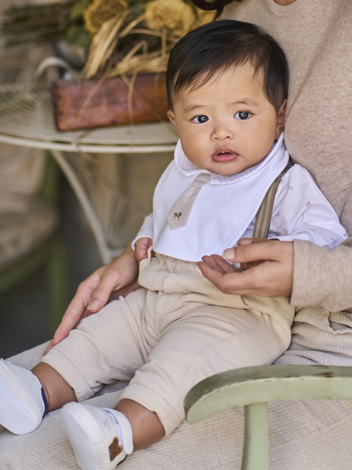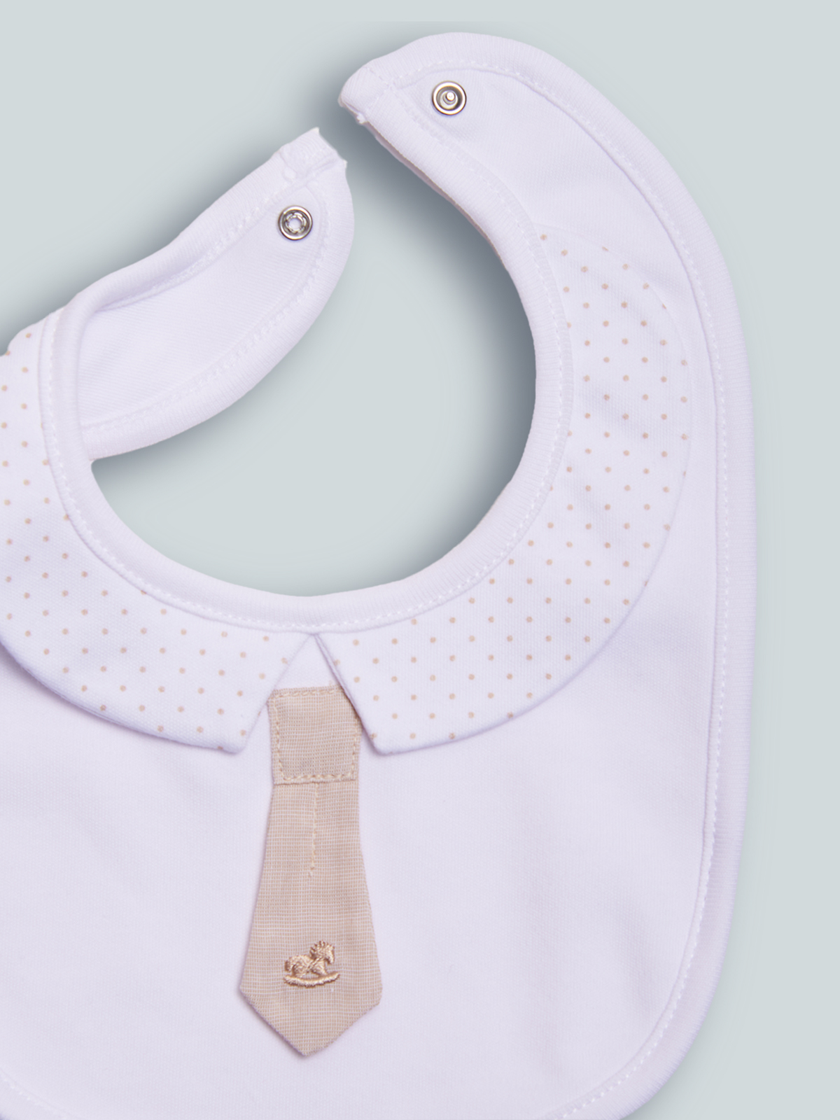 Bavetta per il giorno più importante, il Battesimo. Accessorio in cotone con cravatta e finto colletto stampato. Ideale per completare il look.