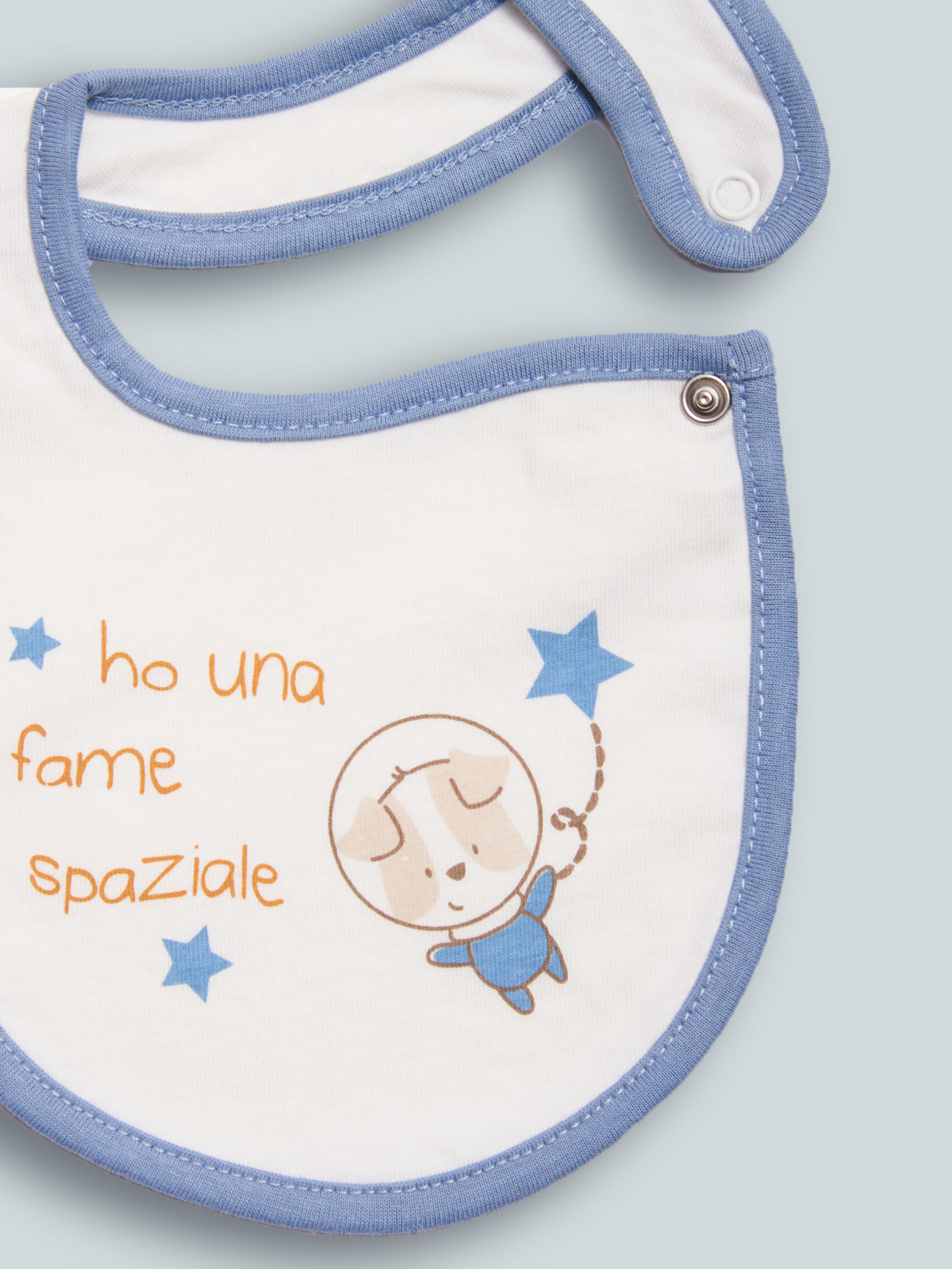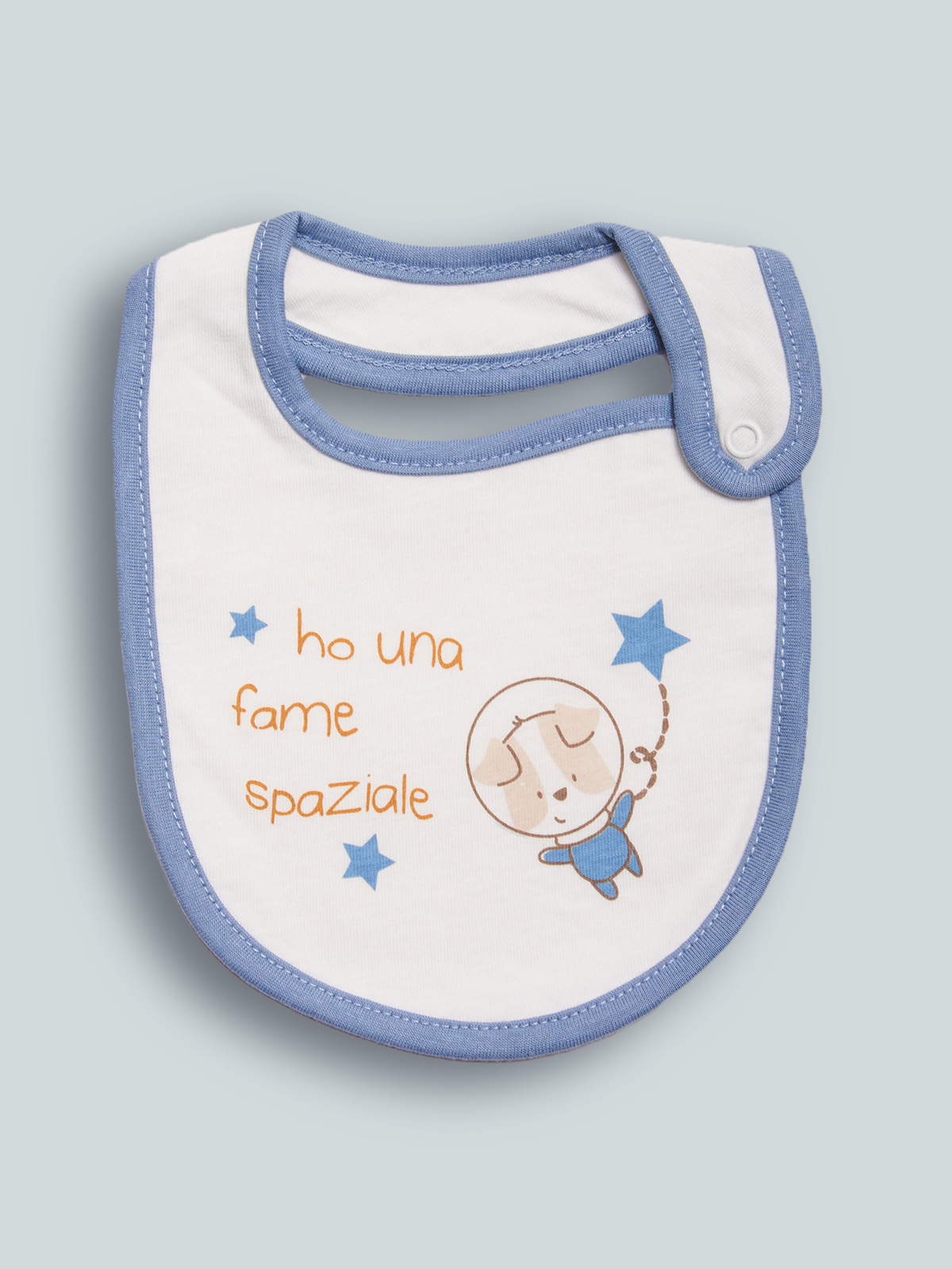 Morbido bavaglino doppiato in cotone e bordo contrasto. Apertura con bottone a pressione. Tenera stampa. Questo accessorio fa parte del corredino composto da tutti gli articoli indispensabili per il tuo neonato.