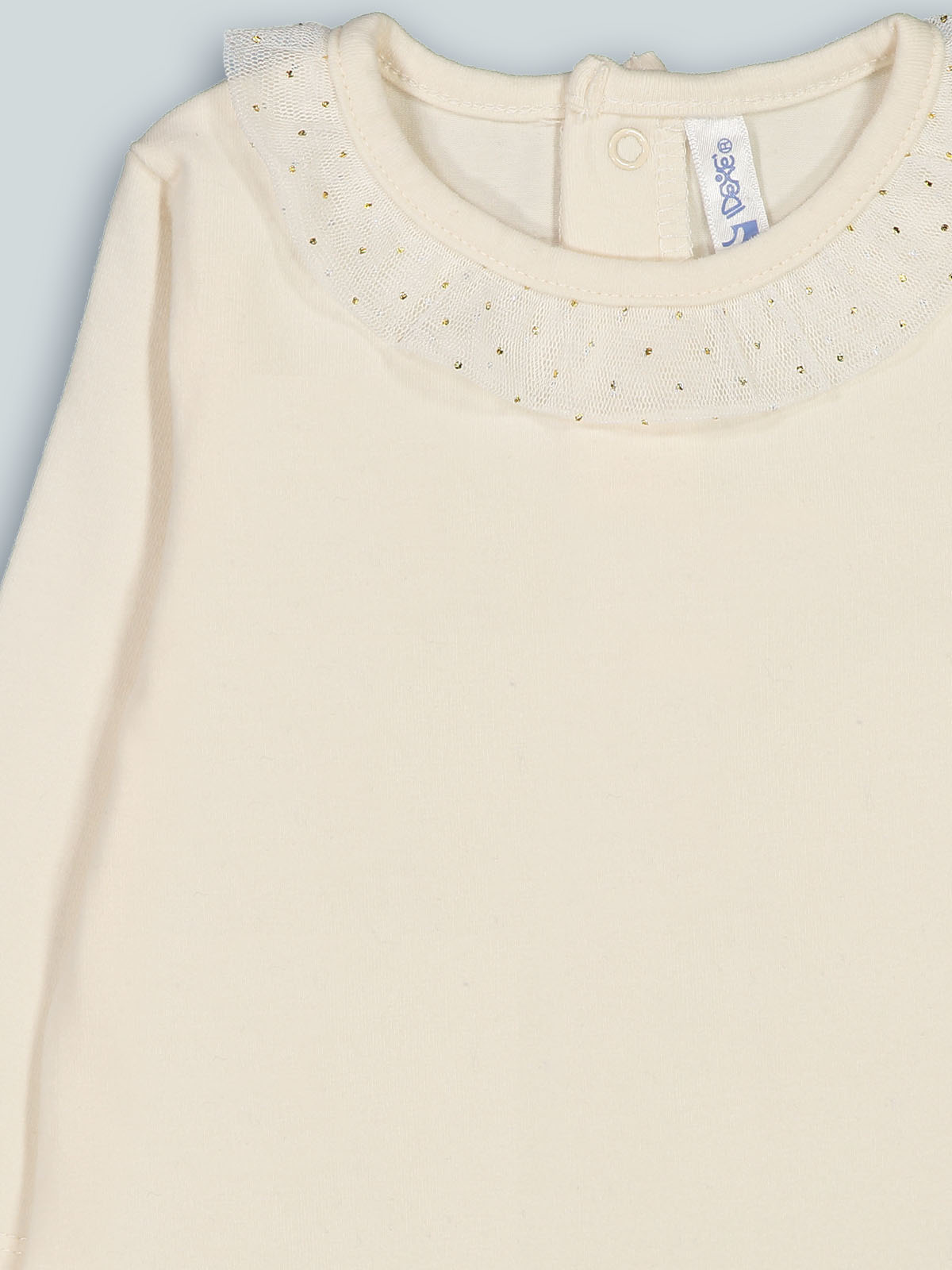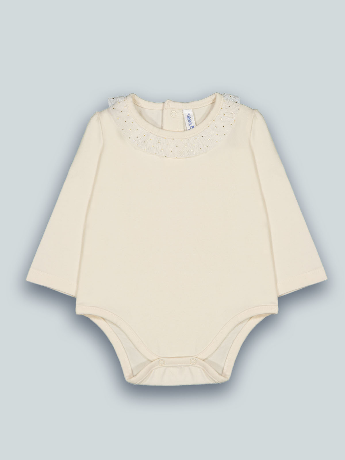 Body girocollo in caldo cotone elasticizzato, apertura sul dietro ed entrogamba con bottoncini a pressione per facilitarne l’indosso. Girocollo rifinito da rouches in tulle stampato glitter rendono il capo essenziale per ogni tipo di look.
