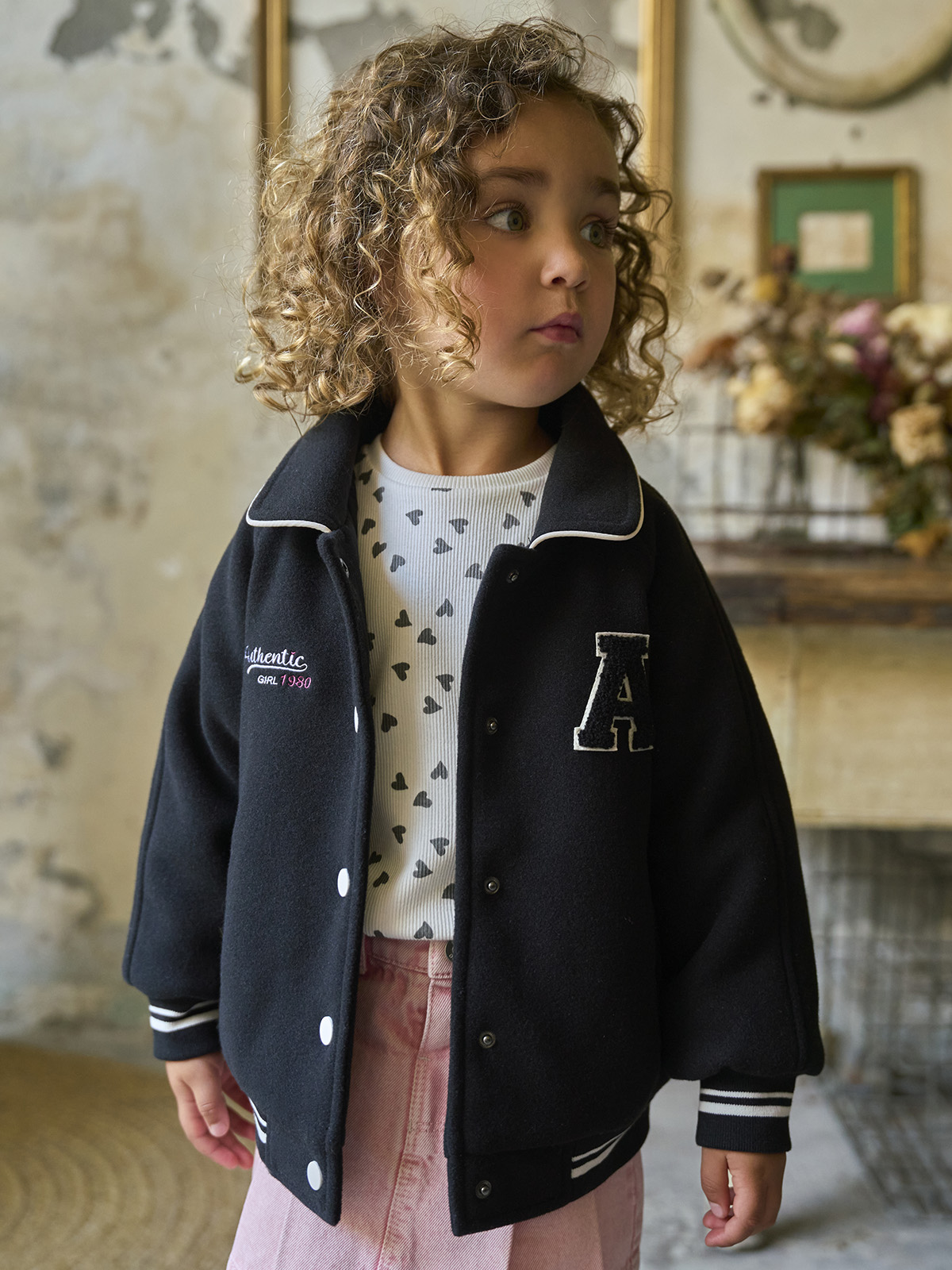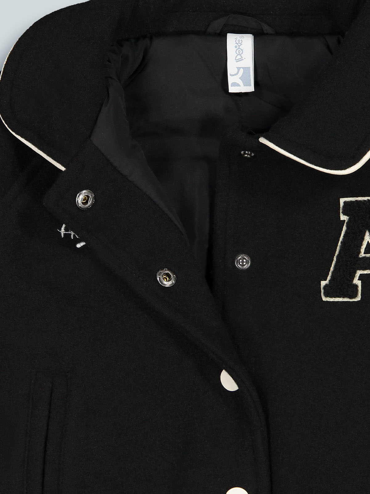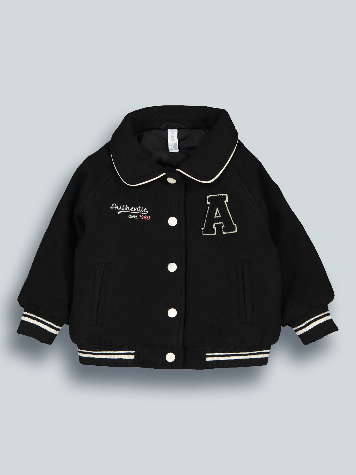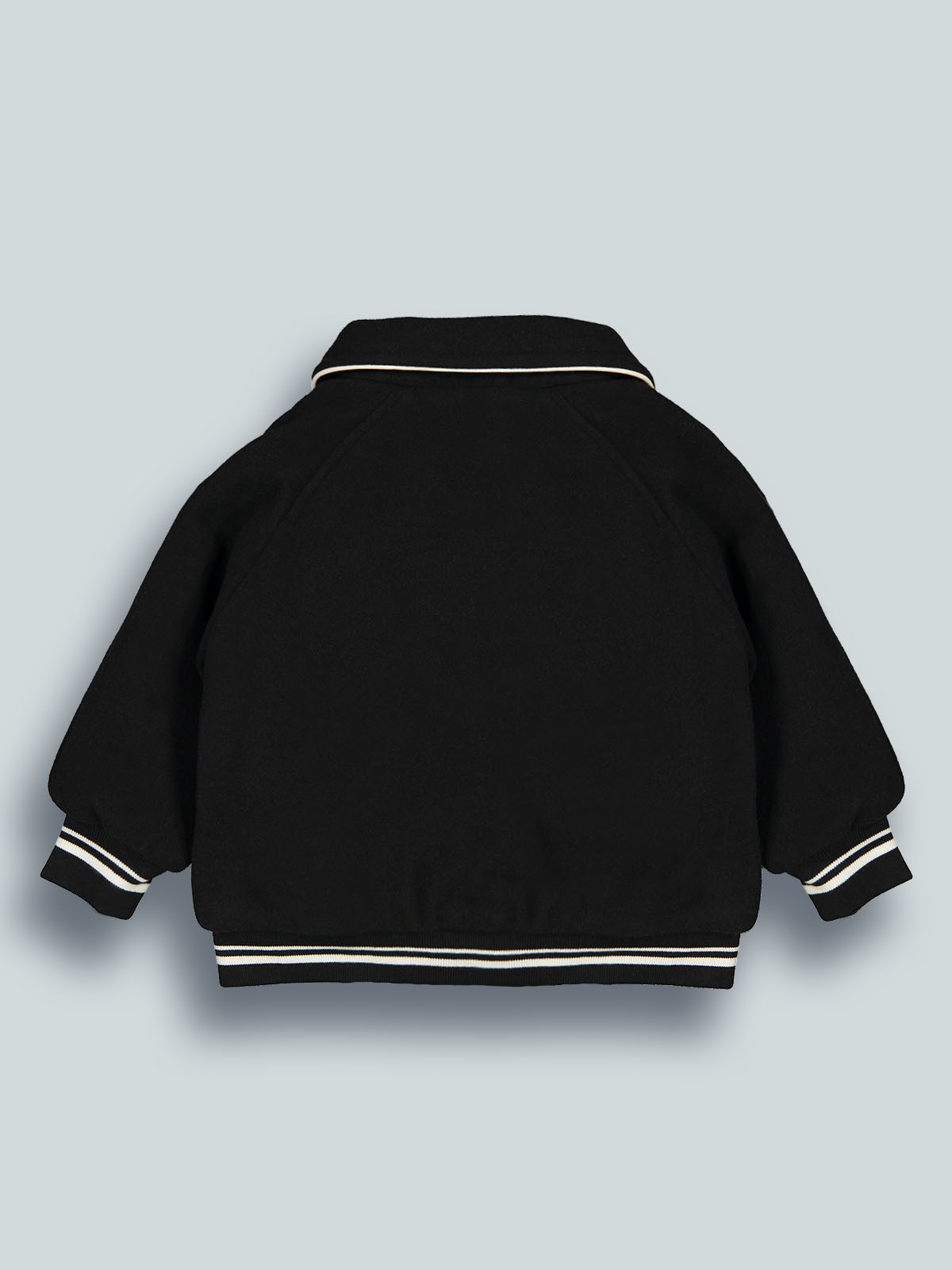 Bomber manica lunga in panno con colletto rotondo e leggera imbottitura. Apertura anteriore con bottoni in contrasto di colore. Costine rigate per polsi e fondo. Ricamo e lettera con effetto punto spugna sul davanti. Un capo molto confortevole e pratico dallo stile college. Ideale per il back to school e per i primi freddi di stagione.