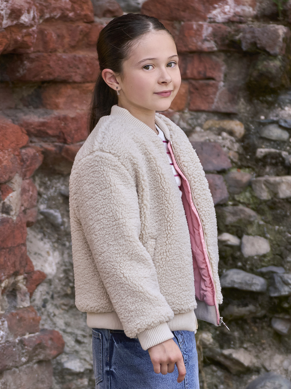 Bomberino in morbido pelouches con collo e polsi e fondo in costina. Fodera in nylon con imbottitura leggera. Un capo molto fashion e di tendenza.