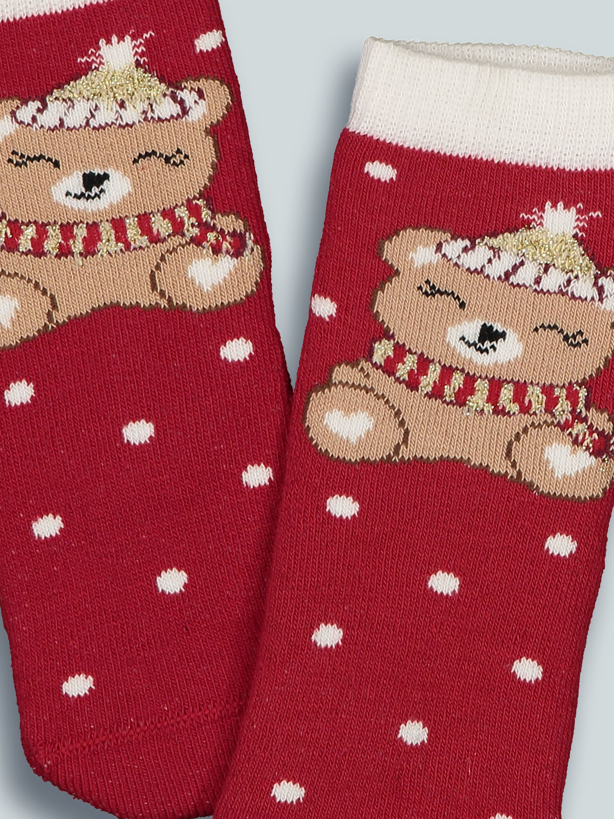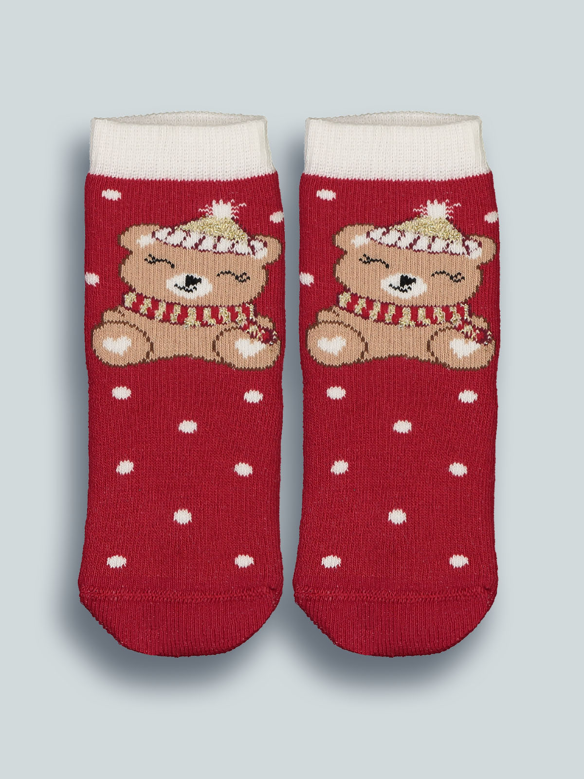 Calzini antiscivolo in morbido misto cotone. Simpatico orsetto natalizio con dettagli in lurex. Pratici gommini antiscivolo sulla pianta del piede. Splendida idea regalo per il periodo delle feste.