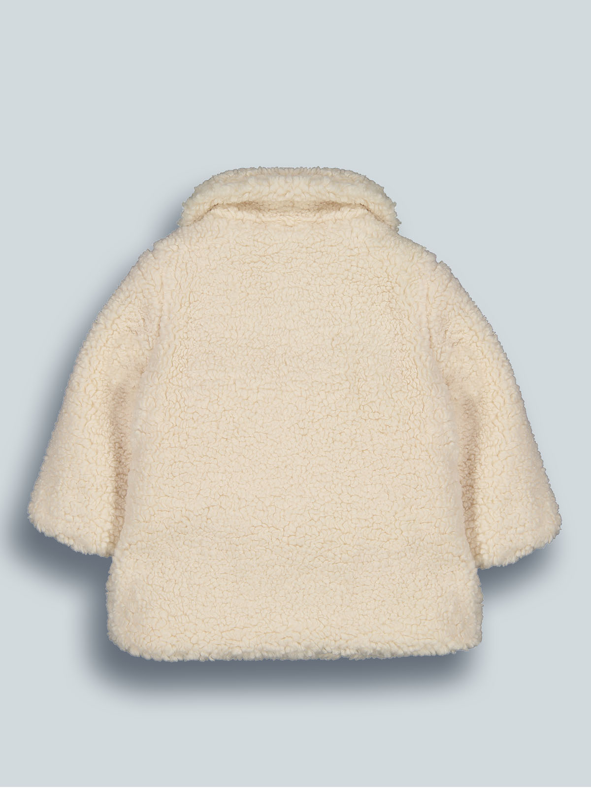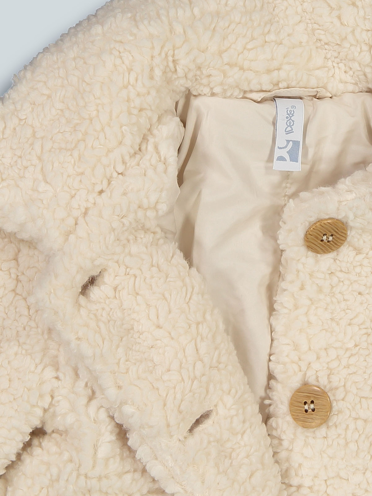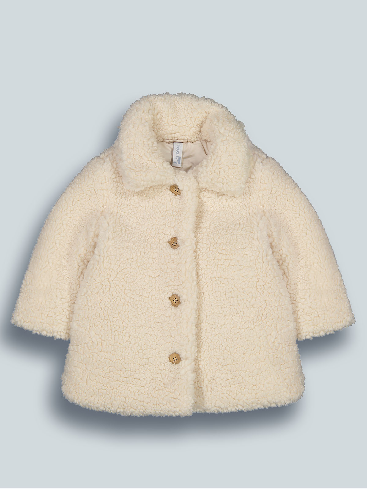 Cappotto in bouclette manica lunga con colletto. Pratico da indossare grazie all’apertura frontale con bottoni. Imbotitura leggera. Foderato internamente in nylon. Il capo ideale che proteggerà la tua bambina dal freddo senza rinunciare ad un look di tendenza.