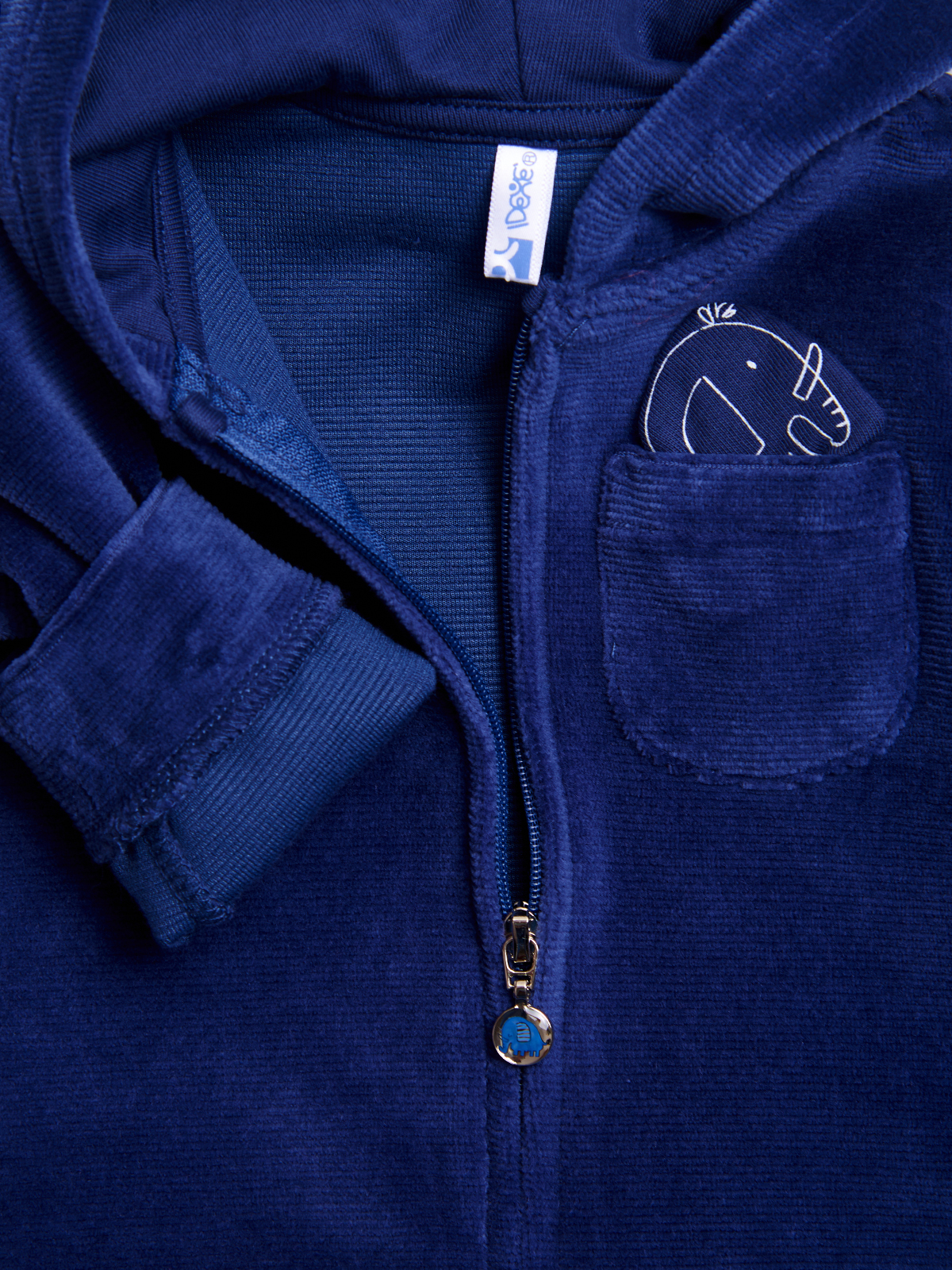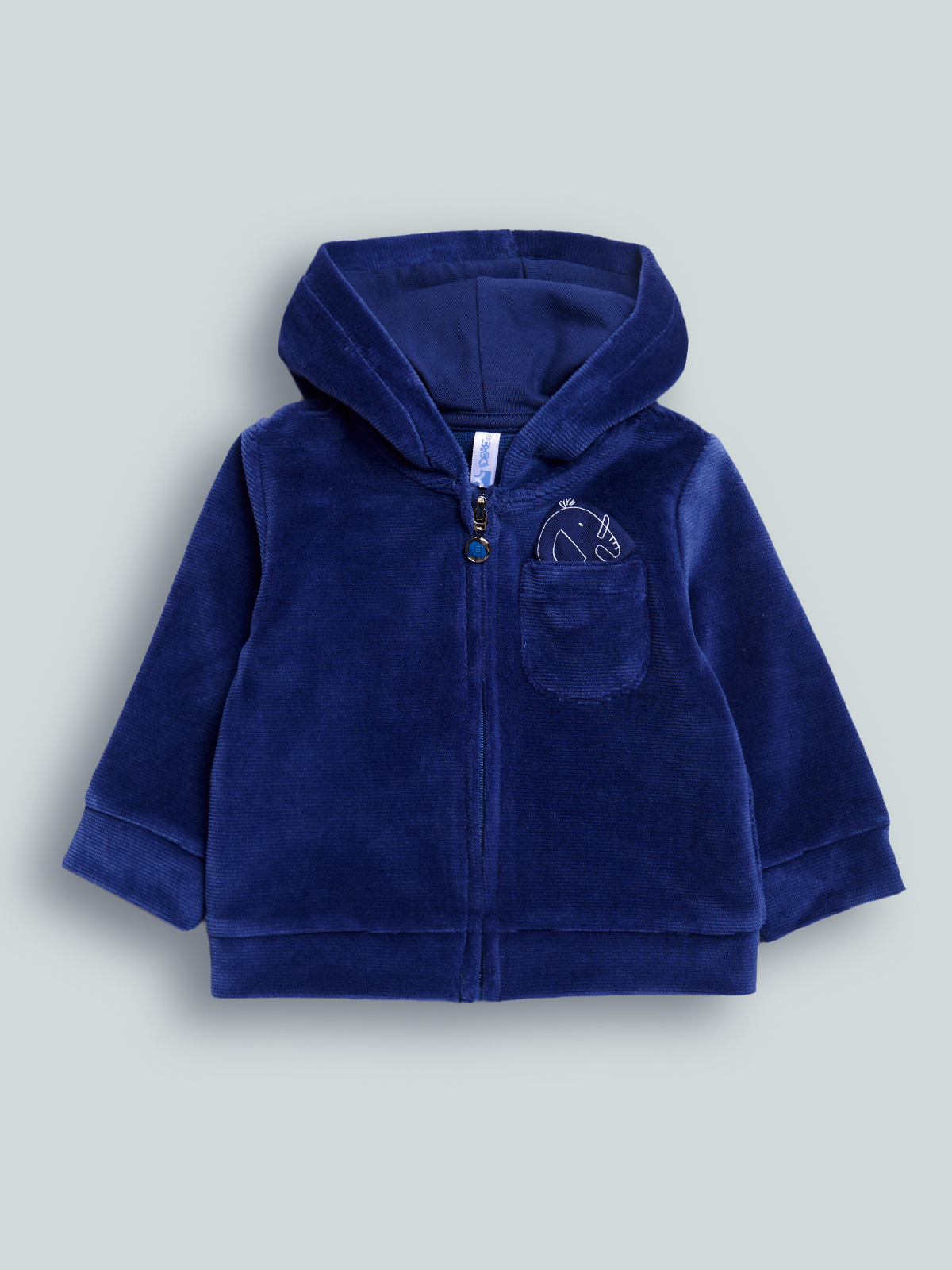 Cardigan in ciniglia a coste, apertura frontale con zip. Taschino su petto da cui fuoriesce un simpatico elefantino su toppa imbottita. Un neonato “cool”, allo stesso tempo comodità e confort in un solo capo.