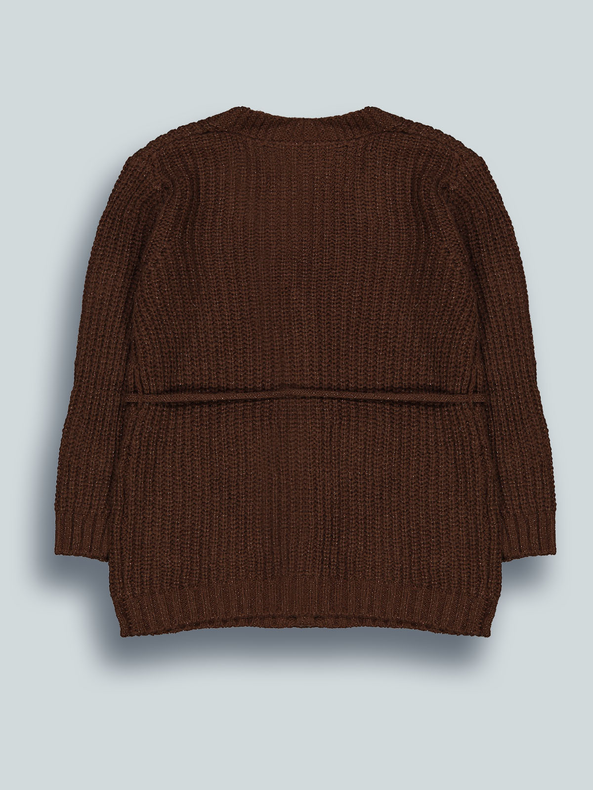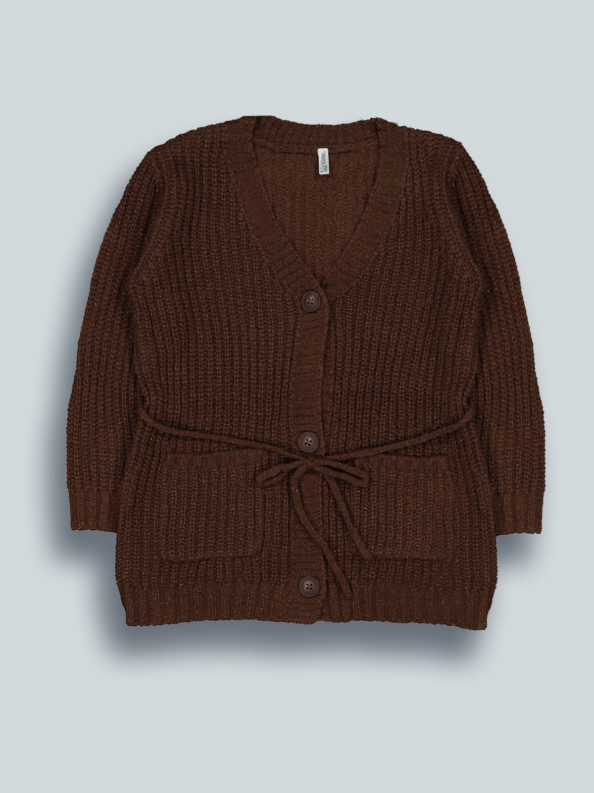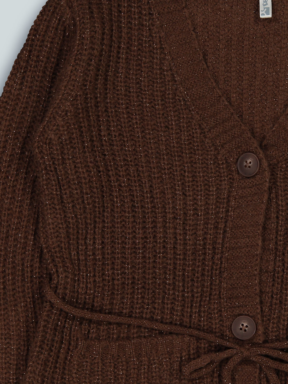 Cardigan manica lunga in morbida maglia con lurex, cintura a vita. Apertura anteriore con bottoni tono. Funzionalità e moda unite in un unico capo.