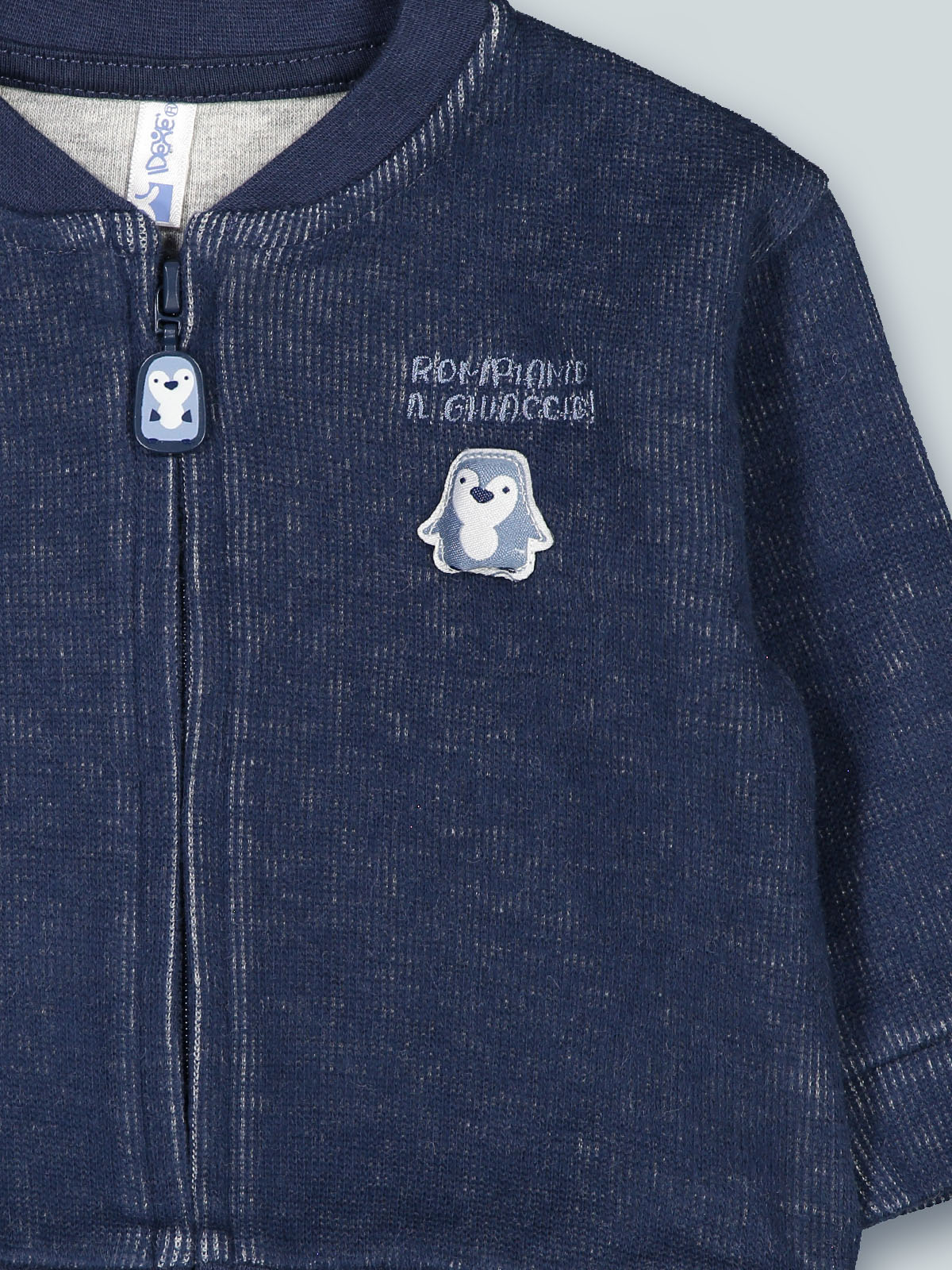 Cardigan in morbida maglia bicolore righe a rilievo, collo e cintura in costina. Apertura frontale con zip e cursore personalizzato. Simpatica scritta ricamata ed etichetta pinguino imbottita. Capo che non può mancare nell’armadio del vostro neonato per un look stiloso e alla moda adatto a tutte le occasioni.
