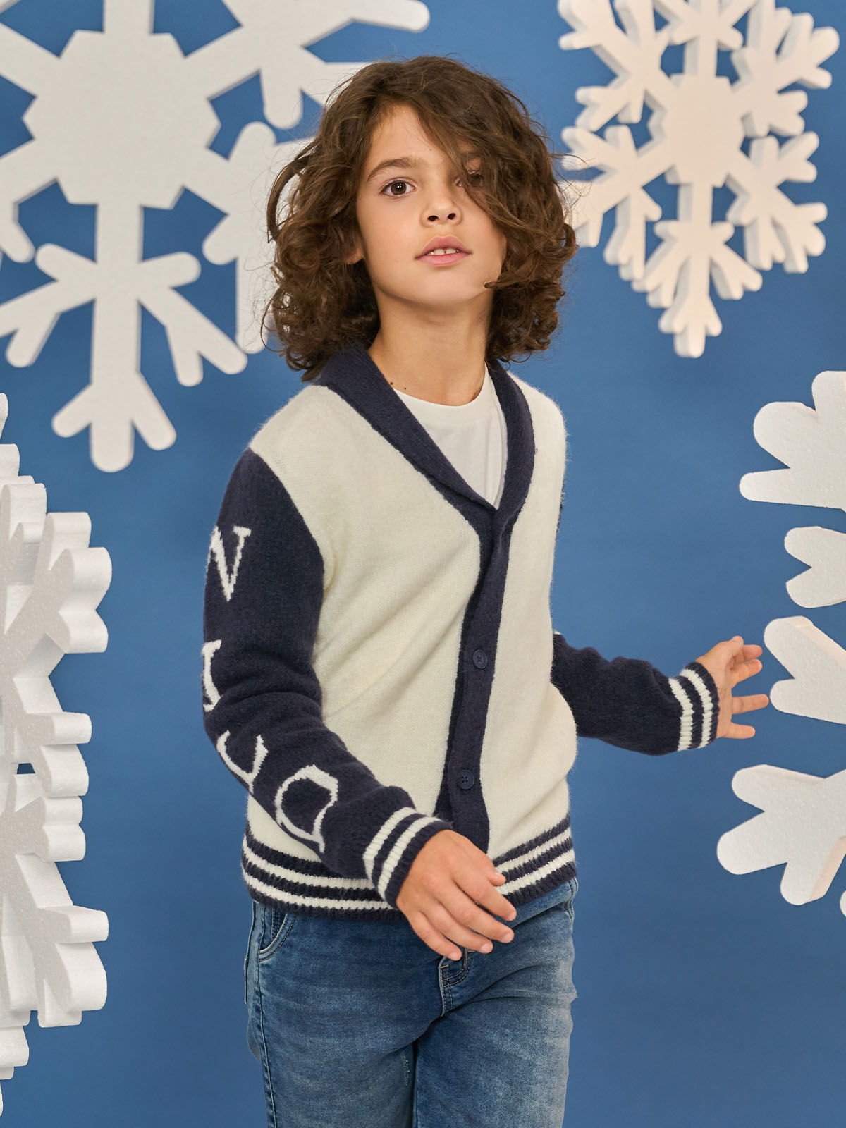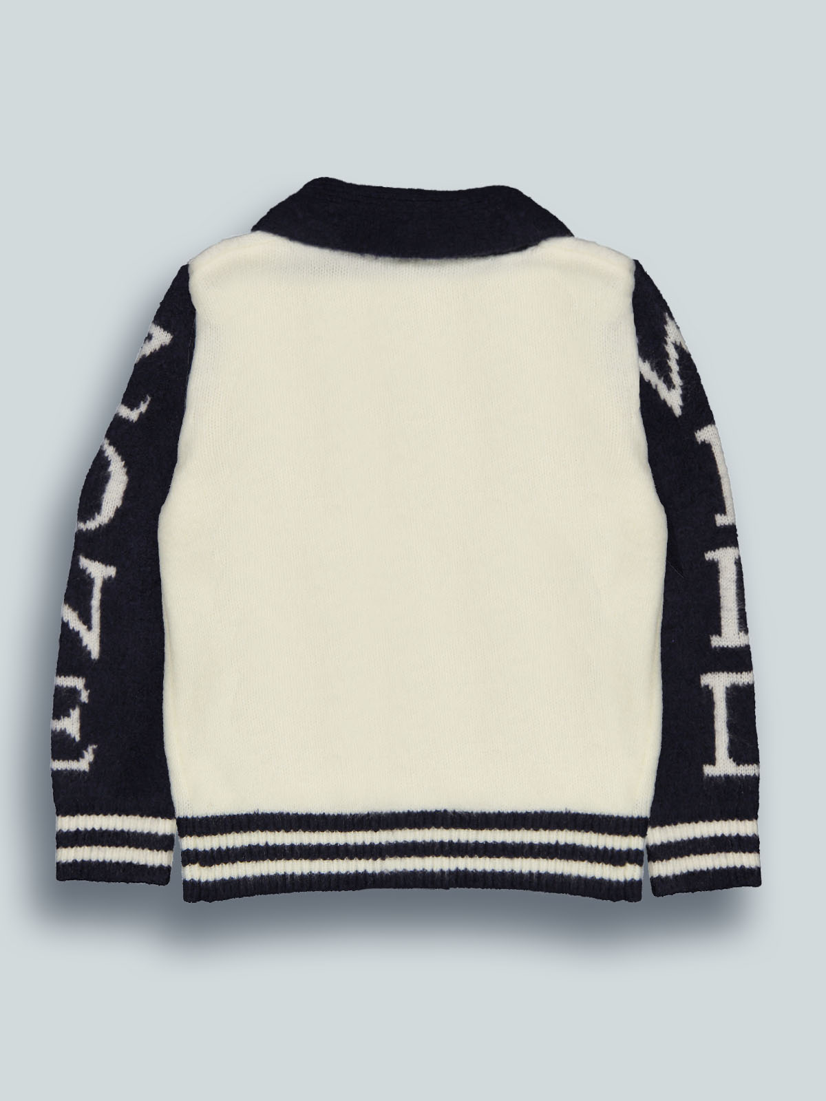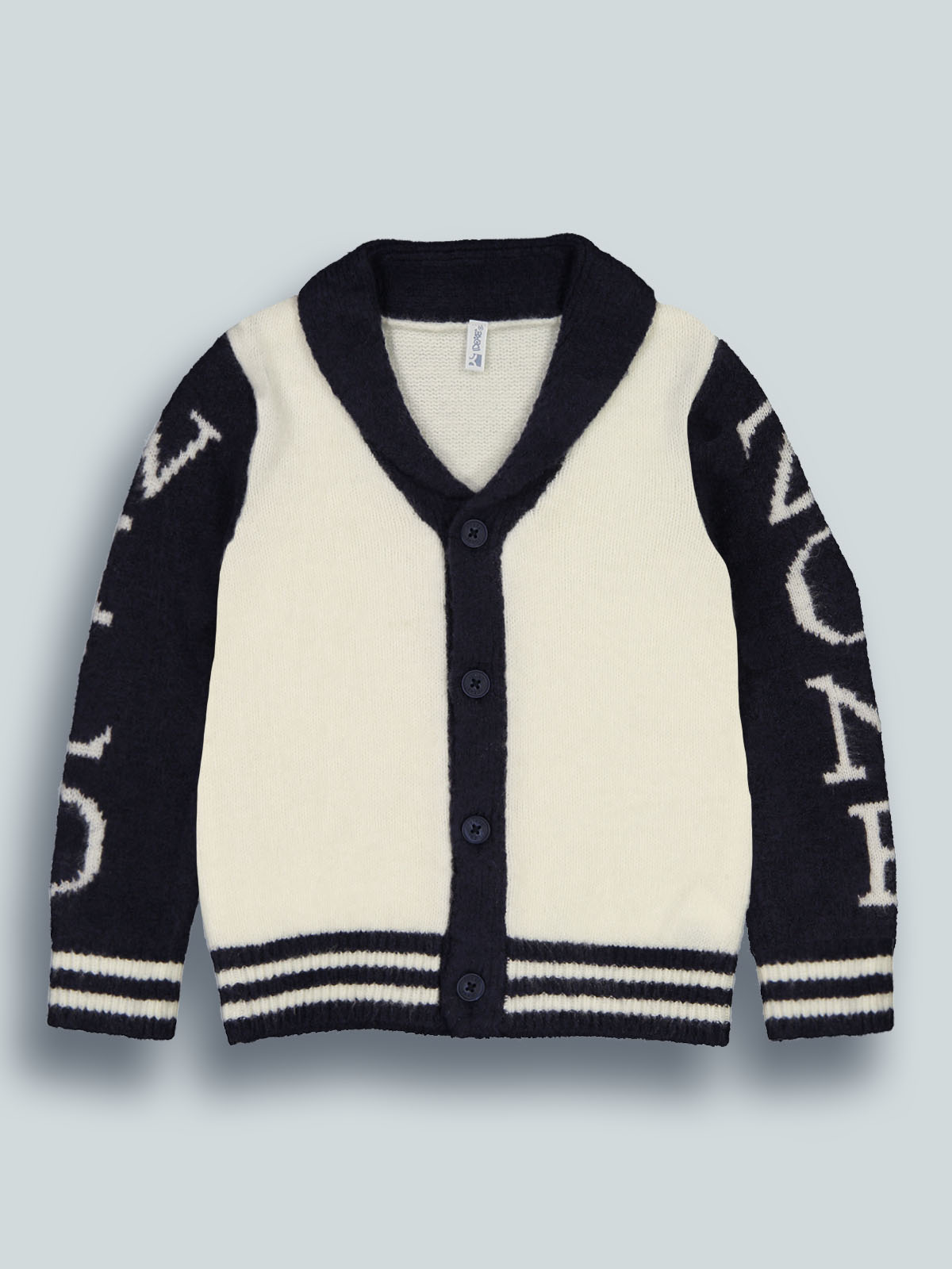 Cardigan in caldo e morbido tricot bicolore, modello con collo sciallato e abbottonatura davanti. Scritte jacquard su maniche. Un capo molto caldo ideale da indossare nella stagione invernale.