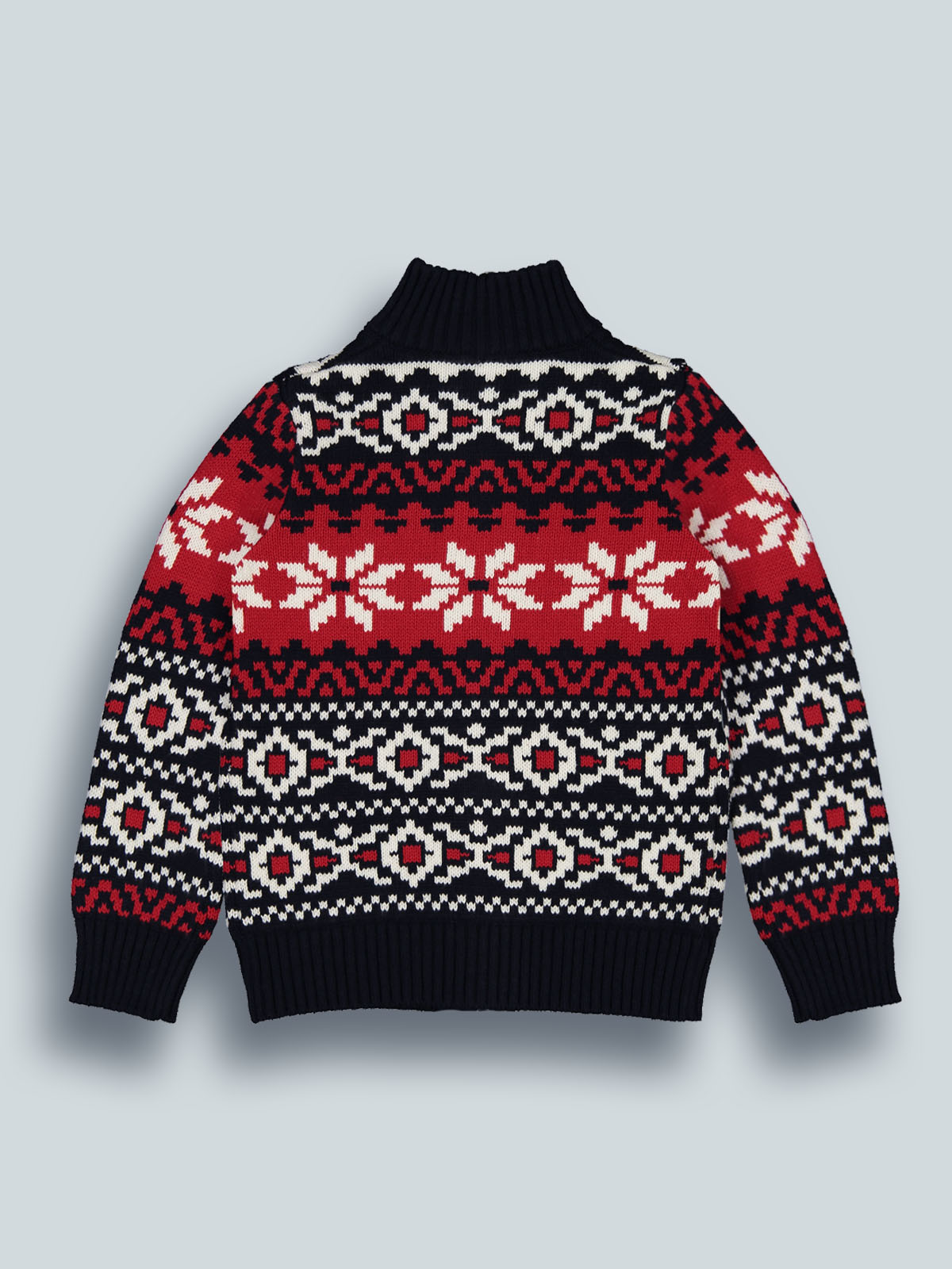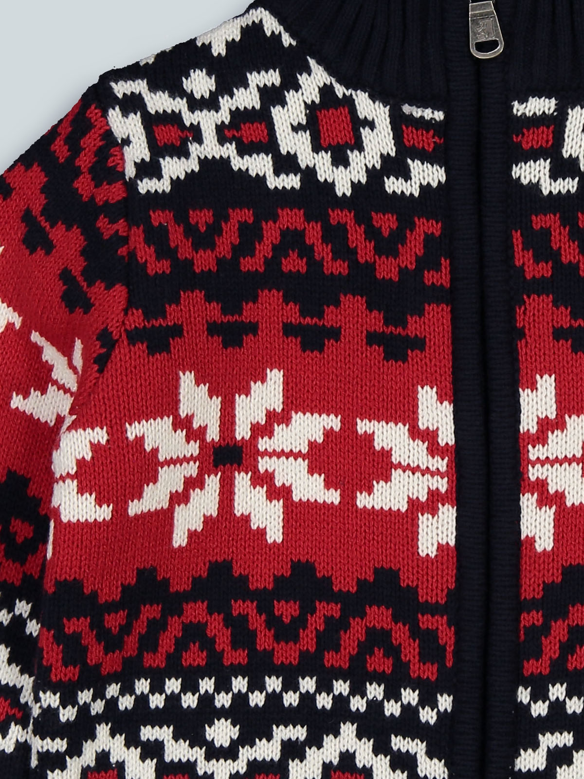Cardigan in morbido e caldo tricot con fantasia jacquard che richiama l’atmosfera natalizia. Collo alto, apertura davanti con pratica lampo. Un capo “must have” per le feste natalizie.