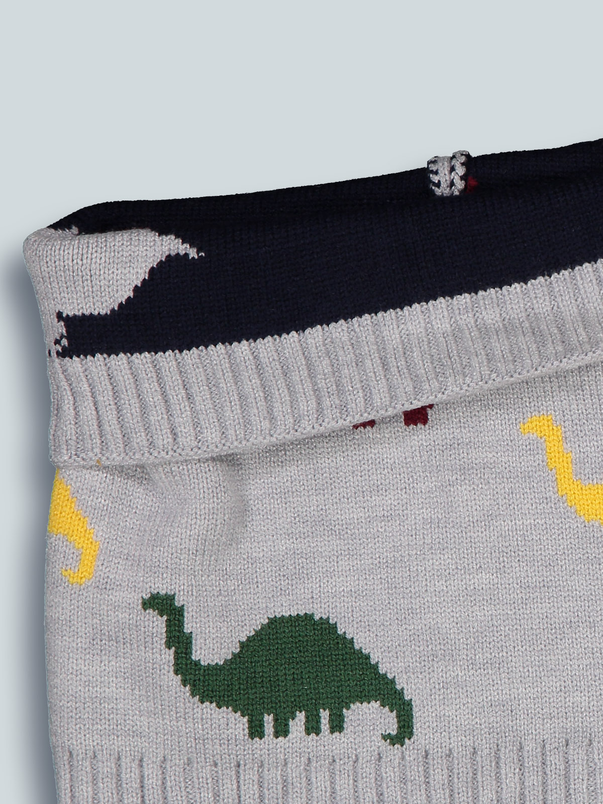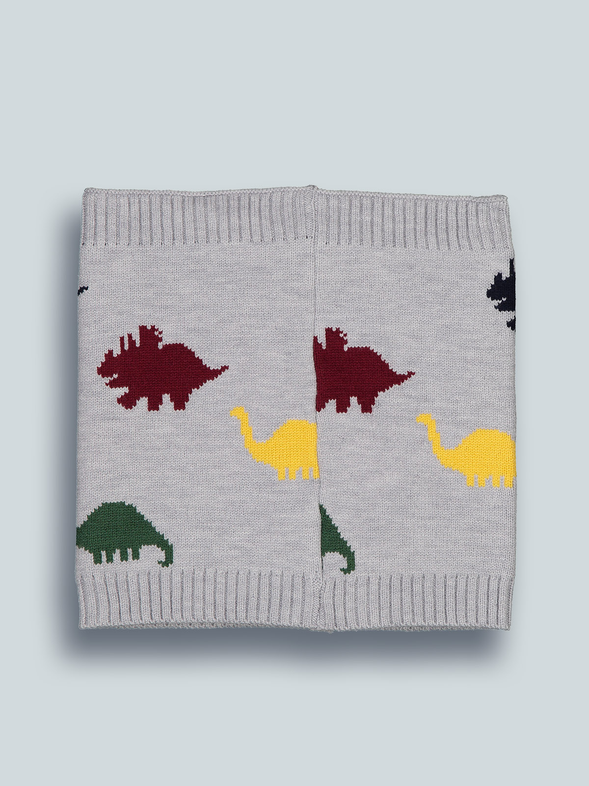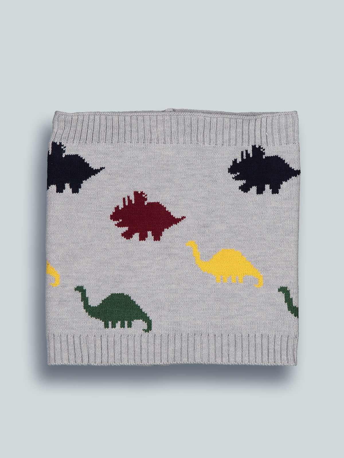 Collo in caldo e morbido tricot melange in fantasia dinosauri colorati. Foderato in jersey per rimanere ancora più al caldo. Perfetto da abbinare alla cuffia e moffole coordinati, immancabili nelle fredde giornate d’inverno.