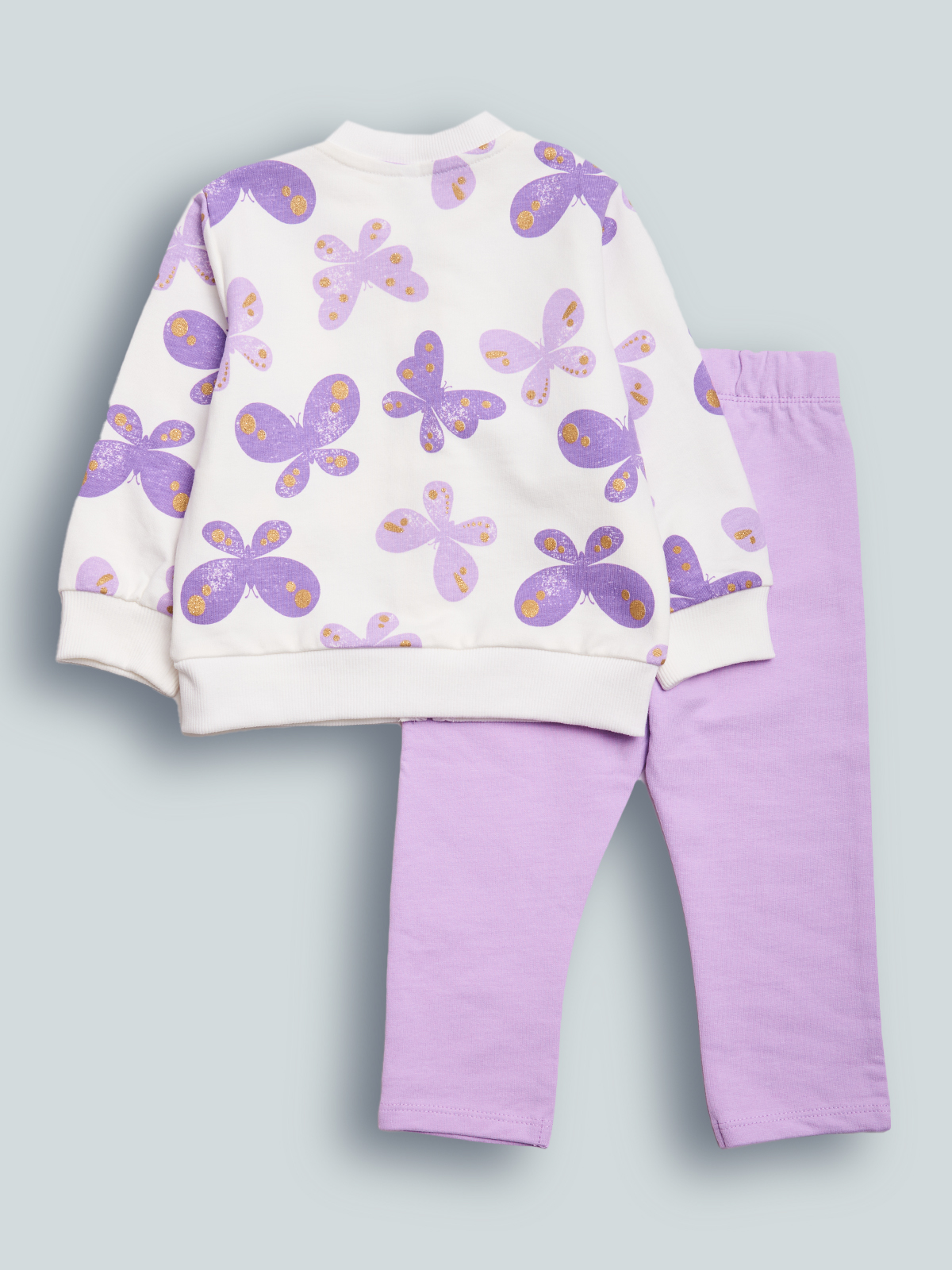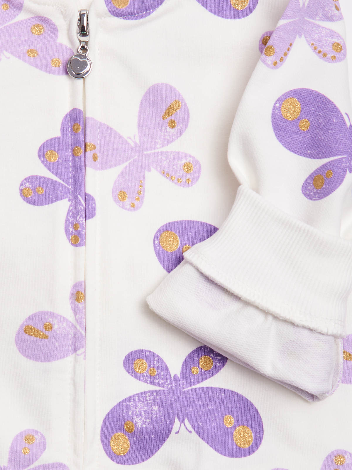 Completo due pezzi in morbida felpa leggera. Cardigan manica lunga, fantasia farfalle. Pratica apertura sul davanti con zip. Collo, polsi e fondo in costina. Pantaloni con vita elasticata per maggiore comodità. Un completo ideale da indossare all’asilo.