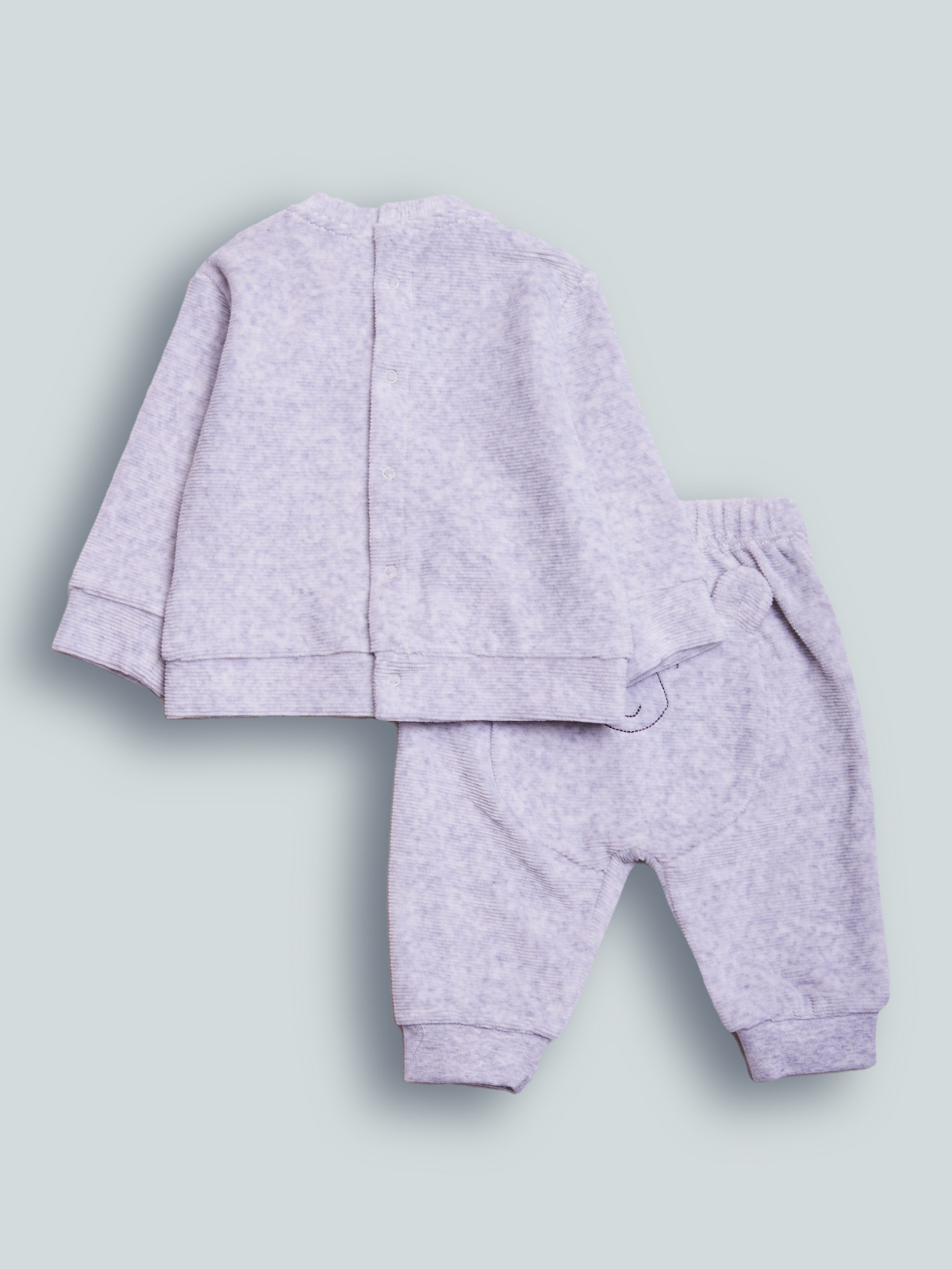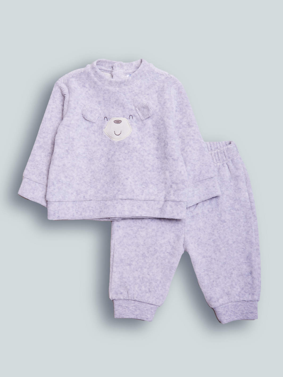 Set composto da: coprifasce in ciniglia a coste grigio melange, manica lunga. Apertura totale sul dietro. Elemento decorativo: ricamo musetto con orecchie 3D. Pantalone vita elasticato per agevolare la vestibilità. Questo completo fa parte del corredino composto da tutti gli articoli indispensabili per il tuo neonato.