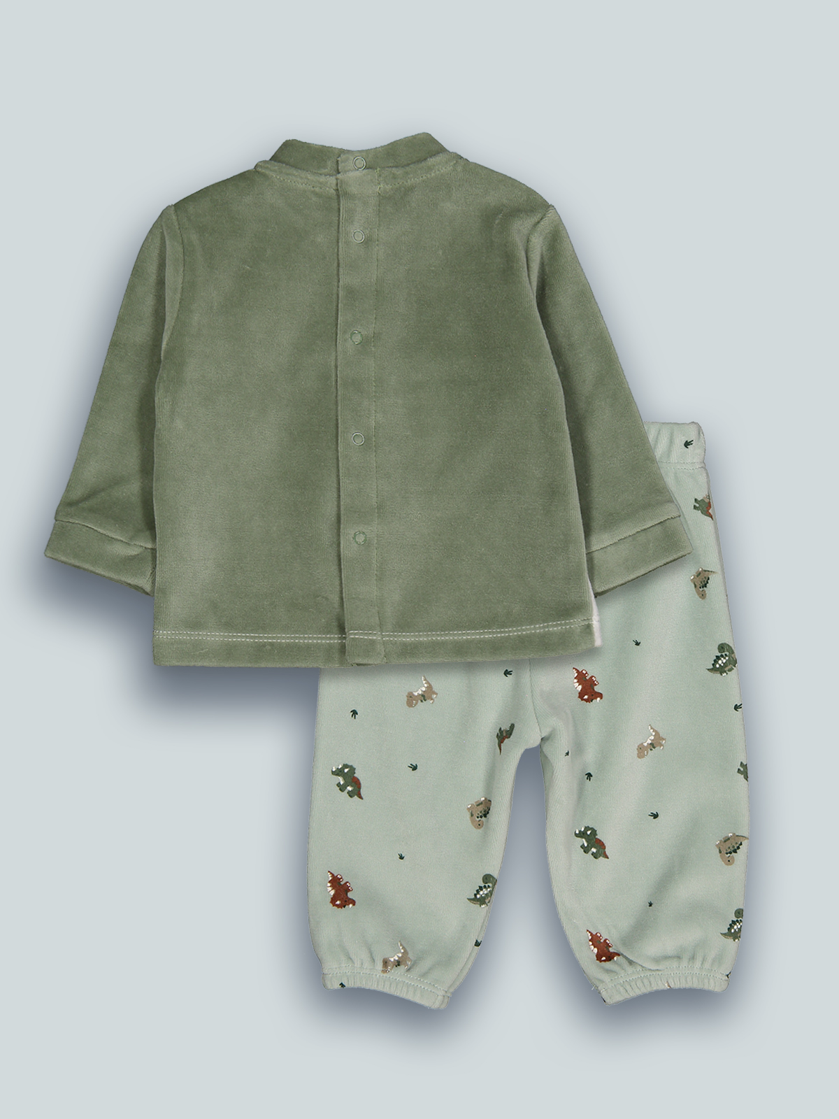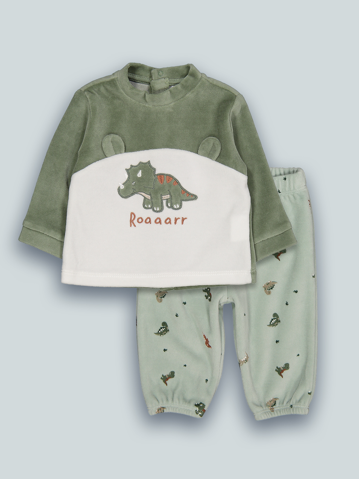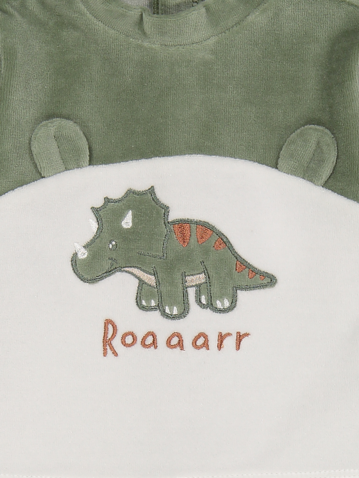 Set composto da: coprifasce in ciniglia manica lunga. Apertura totale sul dietro. Il davanti presenta un taglio con orecchie 3D inserite e un simpatico ricamo dinosauro. Pantalone ciniglia stampata, vita e fondo elasticato per agevolare la vestibilità. Questo completo fa parte del corredino composto da tutti gli articoli indispensabili per il tuo neonato.