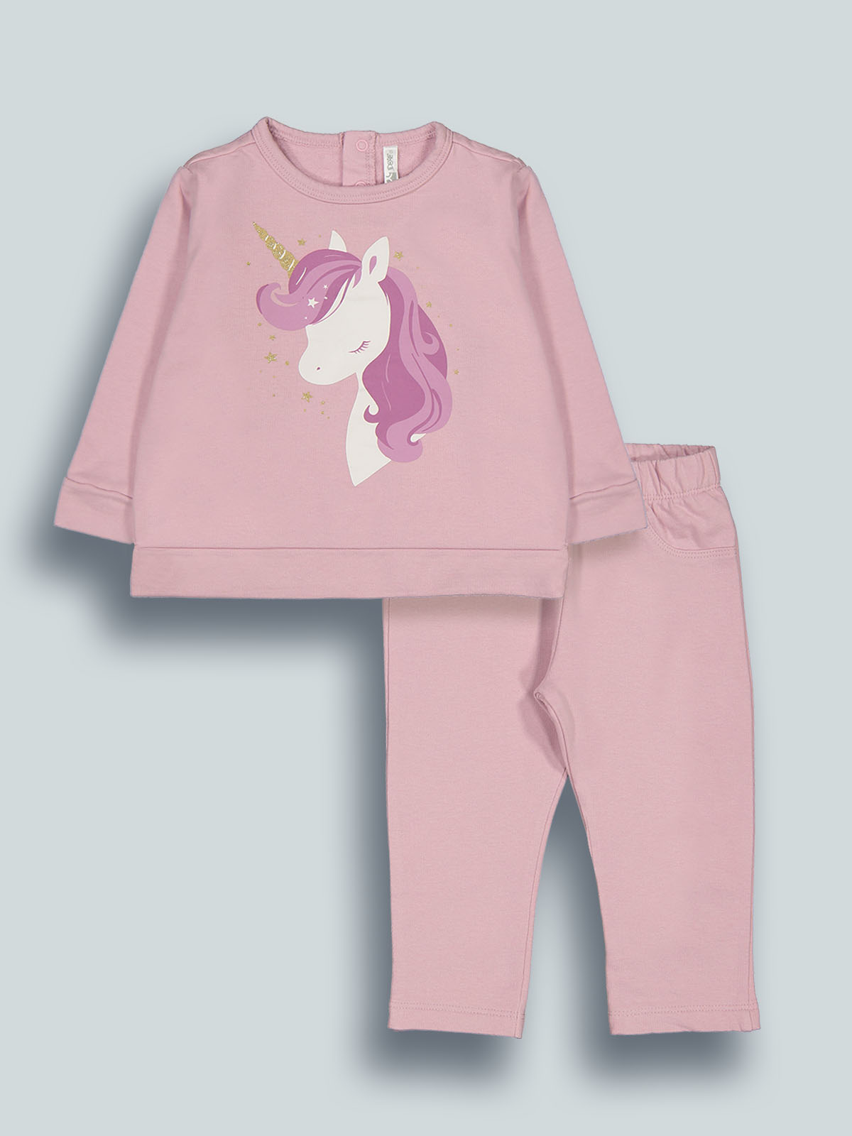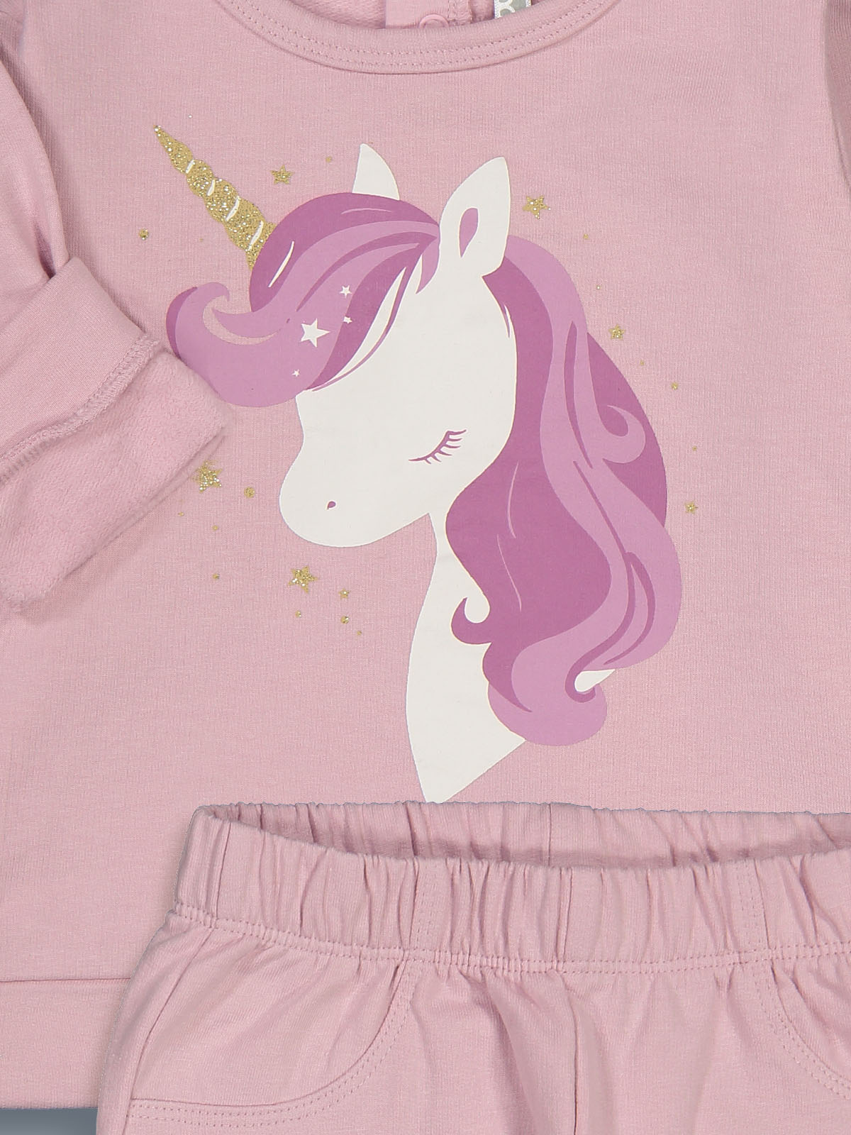 Completo due pezzi in caldo cotone. Maglia girocollo con pratica apertura sul dietro grazie ai bottoncini a pressione. Simpatica stampa unicorno con glitter. Pantaloni basic con vita elasticata per maggiore comodità. L’interno della felpa di questo capo è lavorato in maniera tale che le fibre del tessuto si sollevino, rendendolo più morbido, soffice e caldo sulla pelle. Un completo essenziale per l’asilo e non solo.