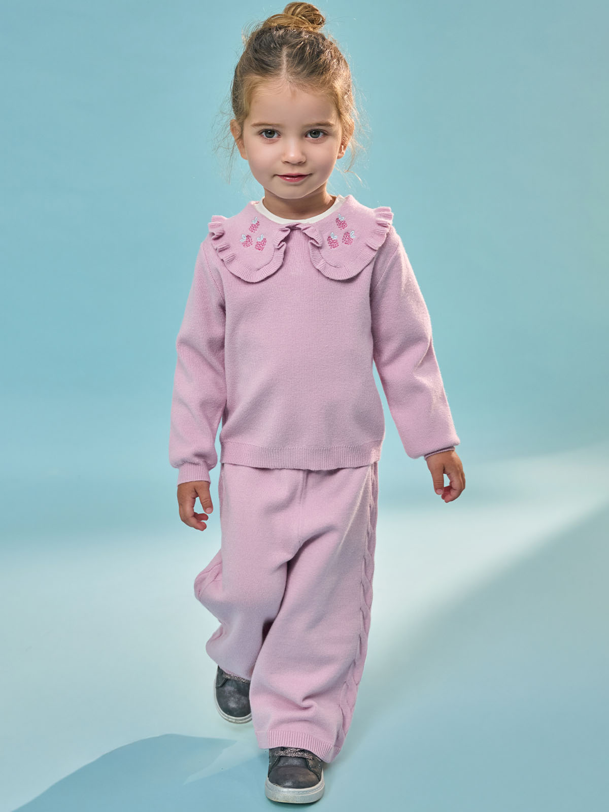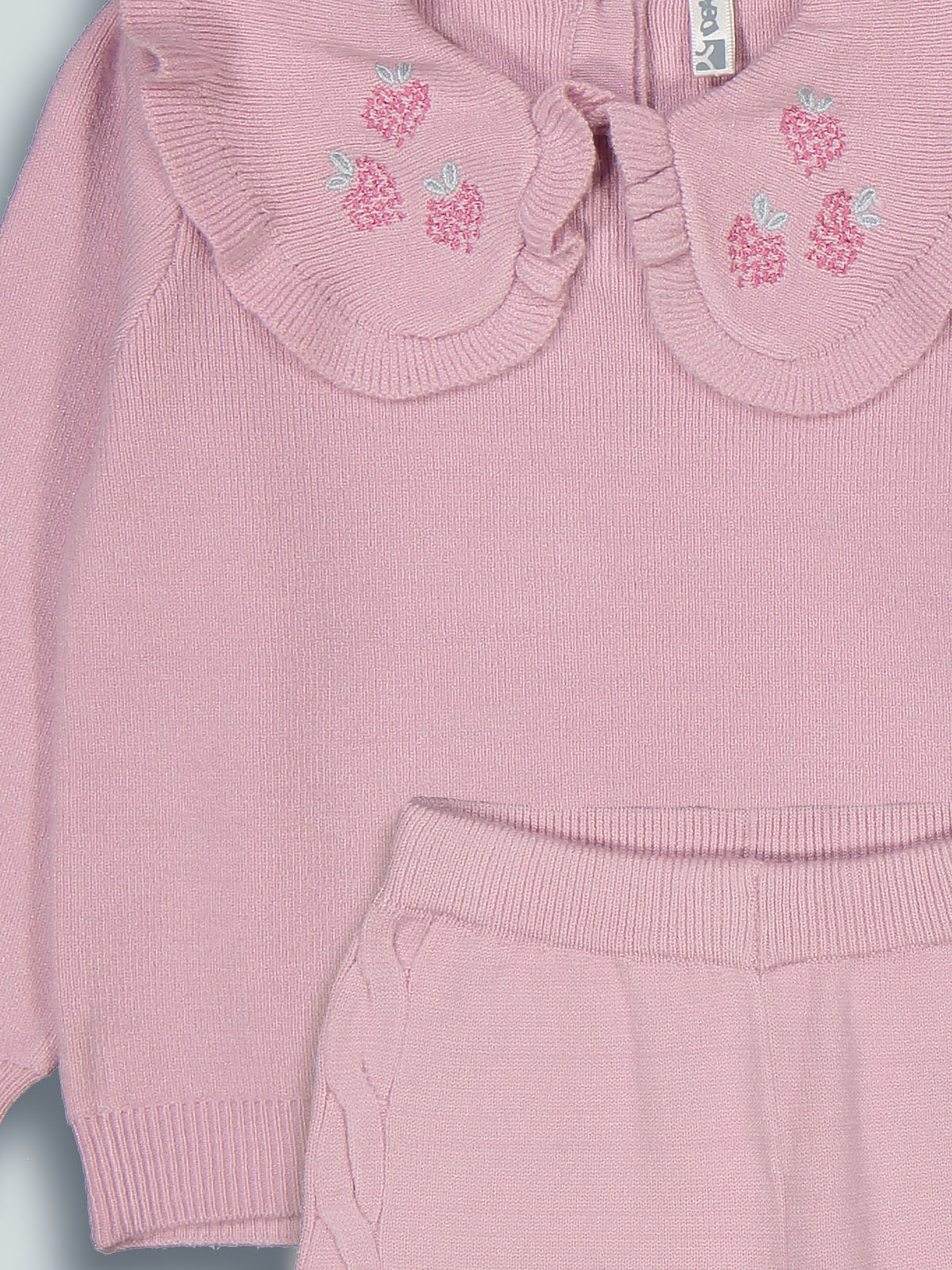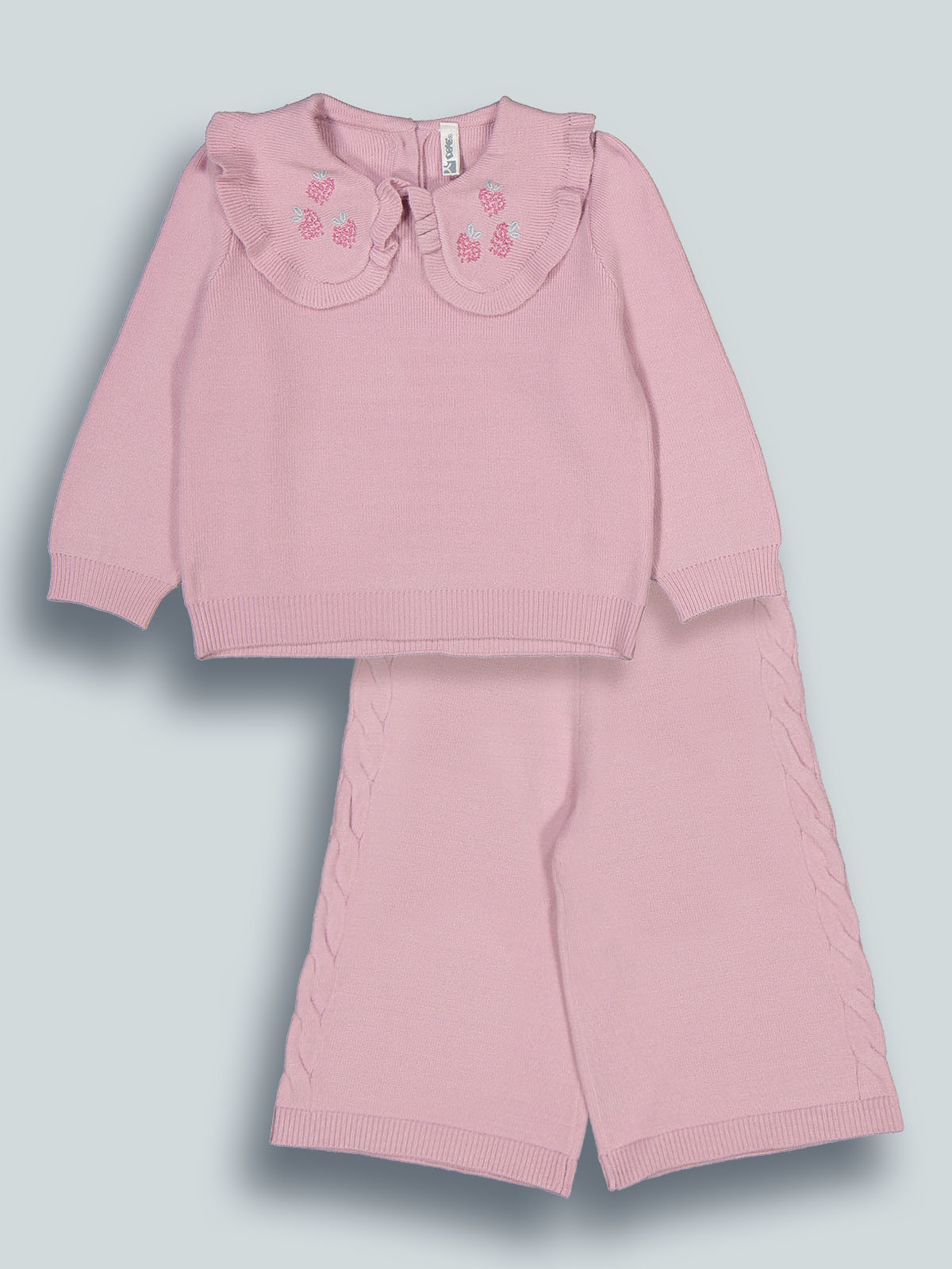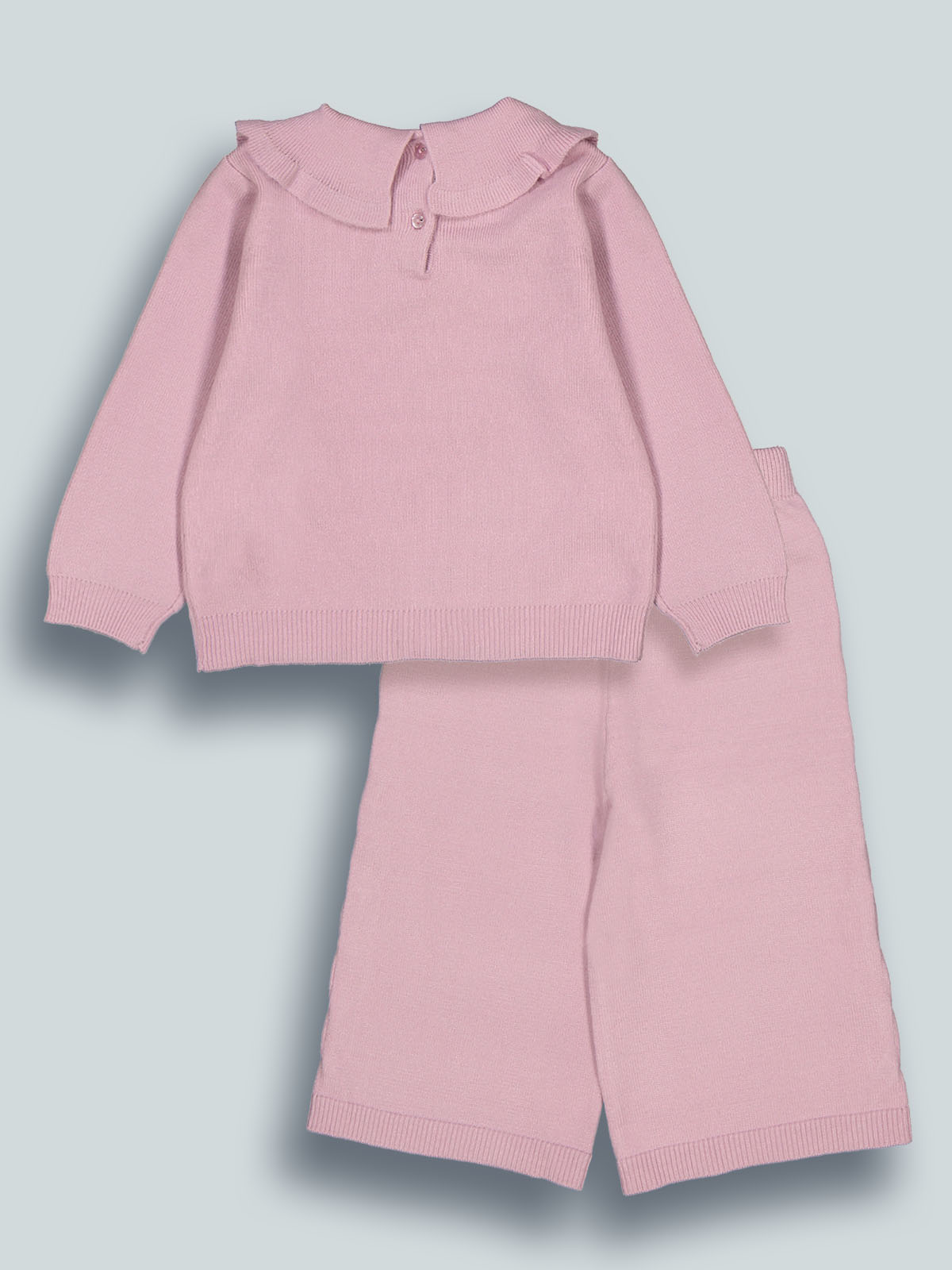 Completo due pezzi in maglia di cotone. Maglia girocollo manica lunga con pratica apertura sul dietro grazie ai bottoncini a pressione. Simpatici ricami more su colletto. Pantaloni modello a palazzo con vita elasticata per maggiore comodità. Un capo caldo ideale per affrontale con stile la stagione invernale.
