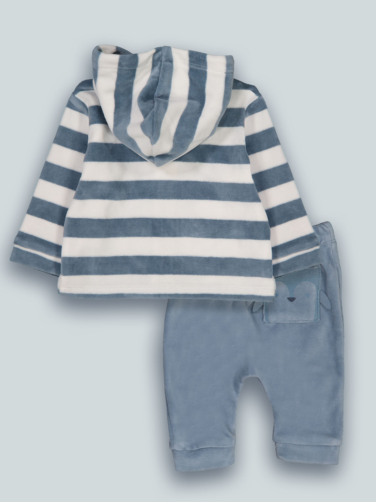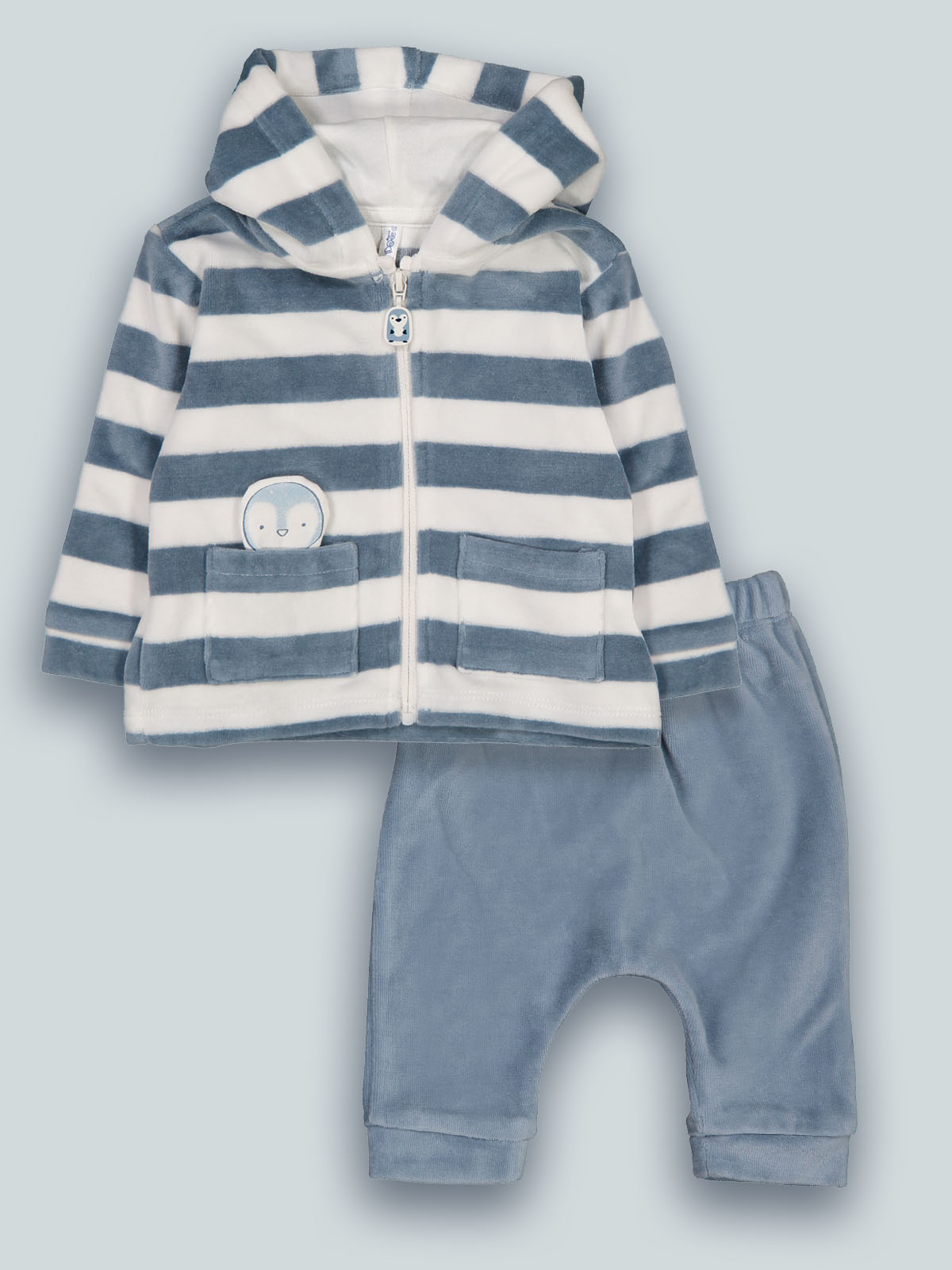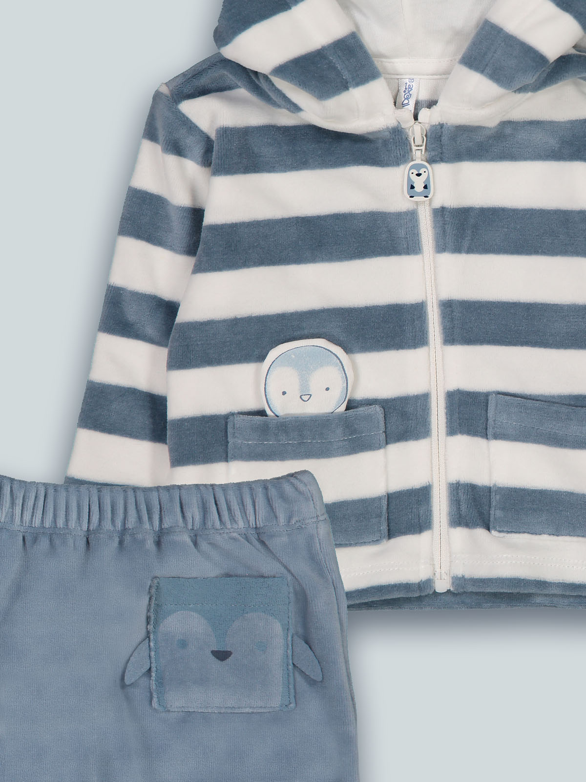 Completo due pezzi formato da cardigan in ciniglia rigato, cappuccio foderato, apertura frontale con zip e cursore personalizzato. Tasche funzionali davanti da cui esce un simpatico pinguino su toppa imbottita. Pantalone cavallo basso in ciniglia unita, vita elasticata per una maggiore vestibiliità. Capo che non può mancare nell’armadio dei vostri neonati.