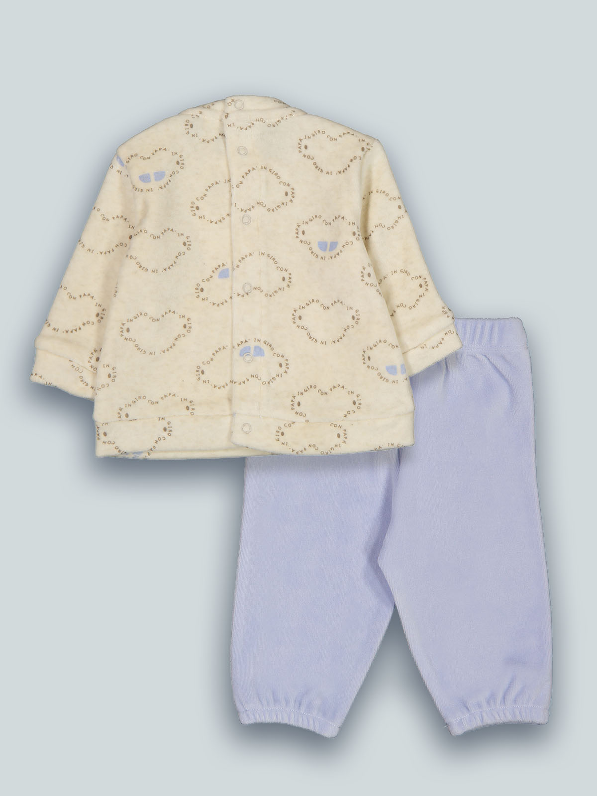 Completo in morbida ciniglia composto da coprifasce stampato fantasia, apertura sul dietro con bottoni a pressione, tasca davanti unita con grafica stampata e ricamata. Pantalone in tinta unita, vita elasticata per una maggiore vestibiliità. Un capo pratico e comodo per tutte le occasioni.