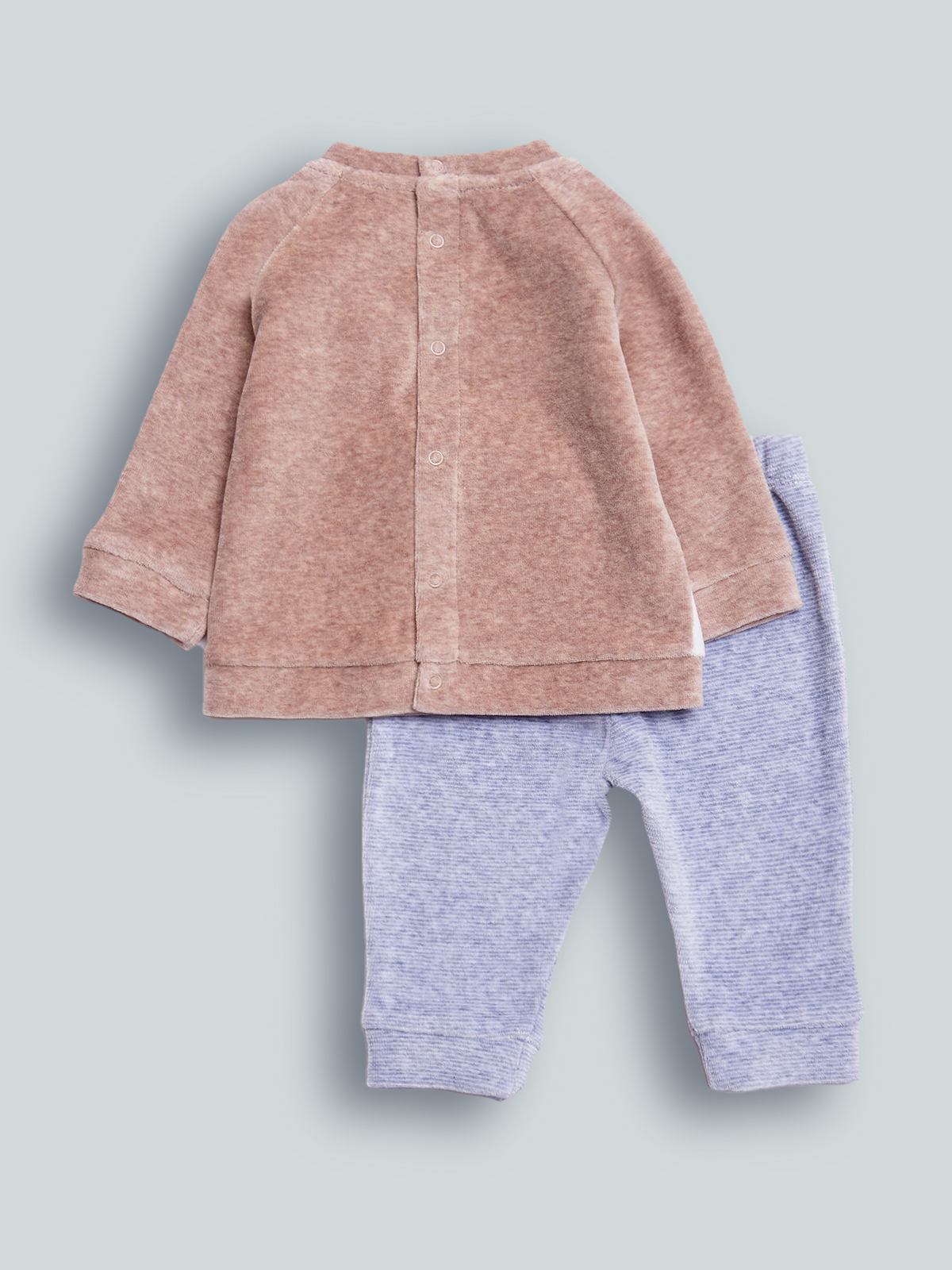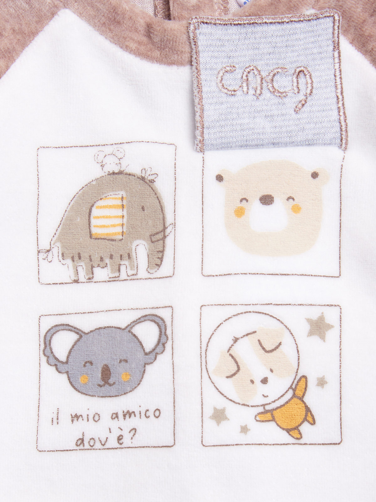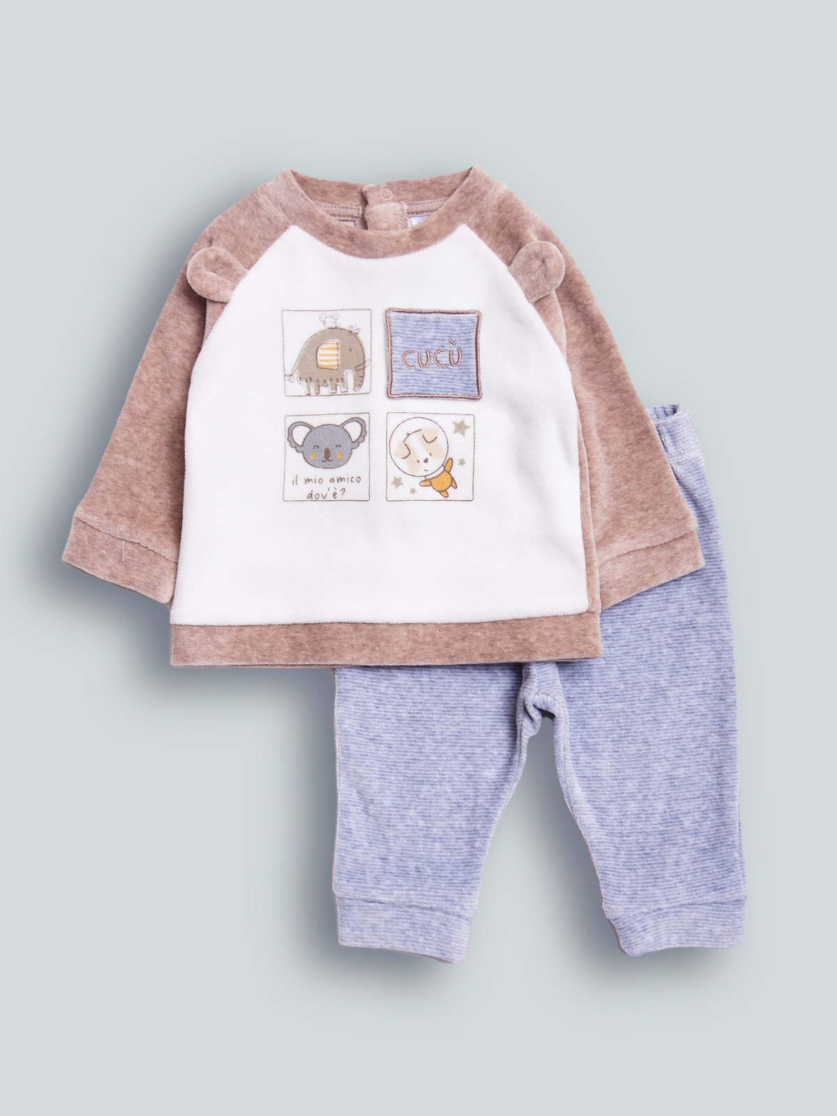 Completo due pezzi in Morbida ciniglia, Maglia con inserti a contrasto. Orecchie 3D inserite nel giromanica. Simpatica stampa davanti con etichetta ricamata. Apertura totale sul dietro con bottoncini a pressione per agevolare l’indosso. Pantalone vita elasticata in ciniglia rigato. Questo completo fa parte del corredino composto da tutti gli articoli indispensabili per il tuo neonato.