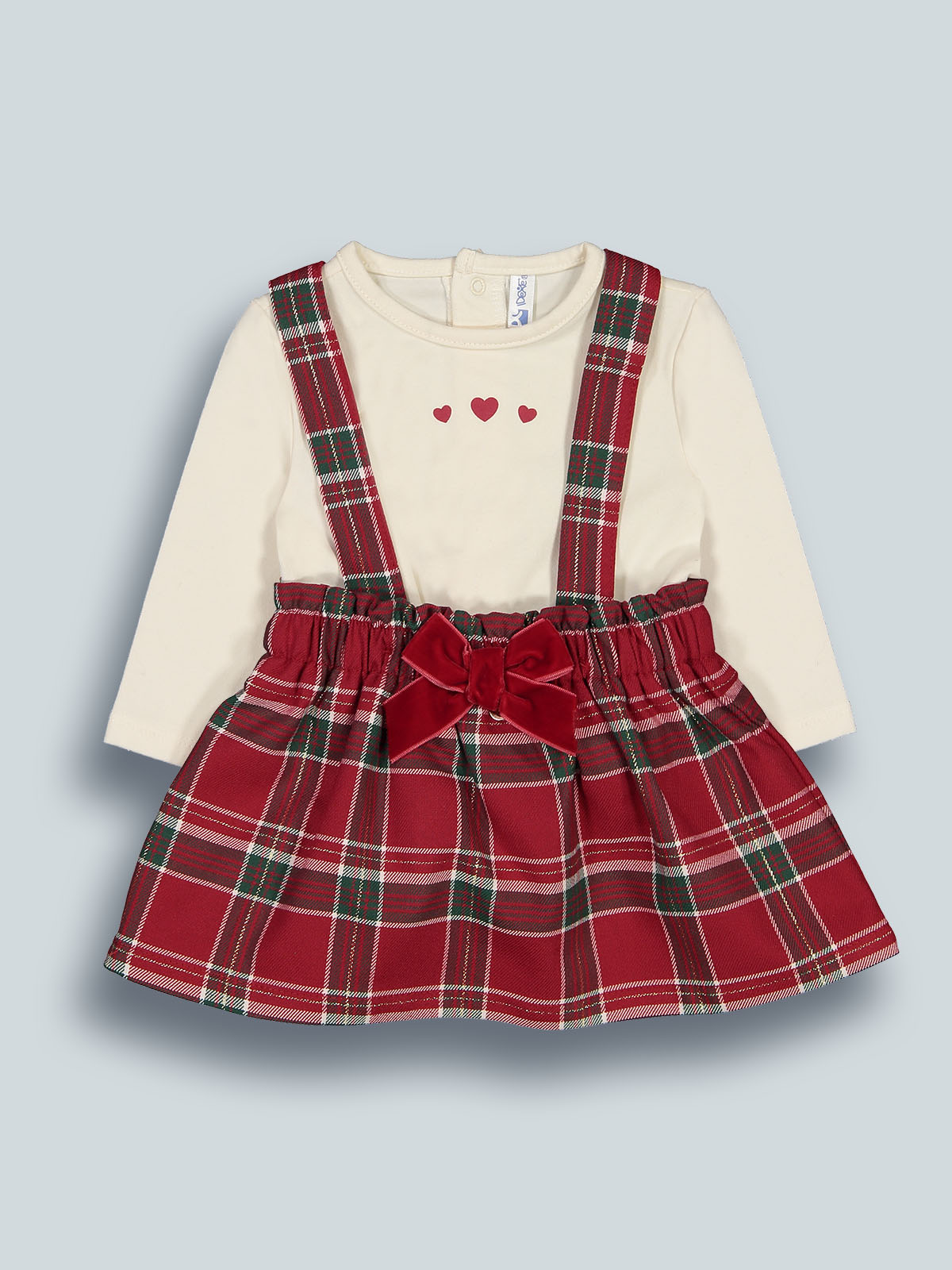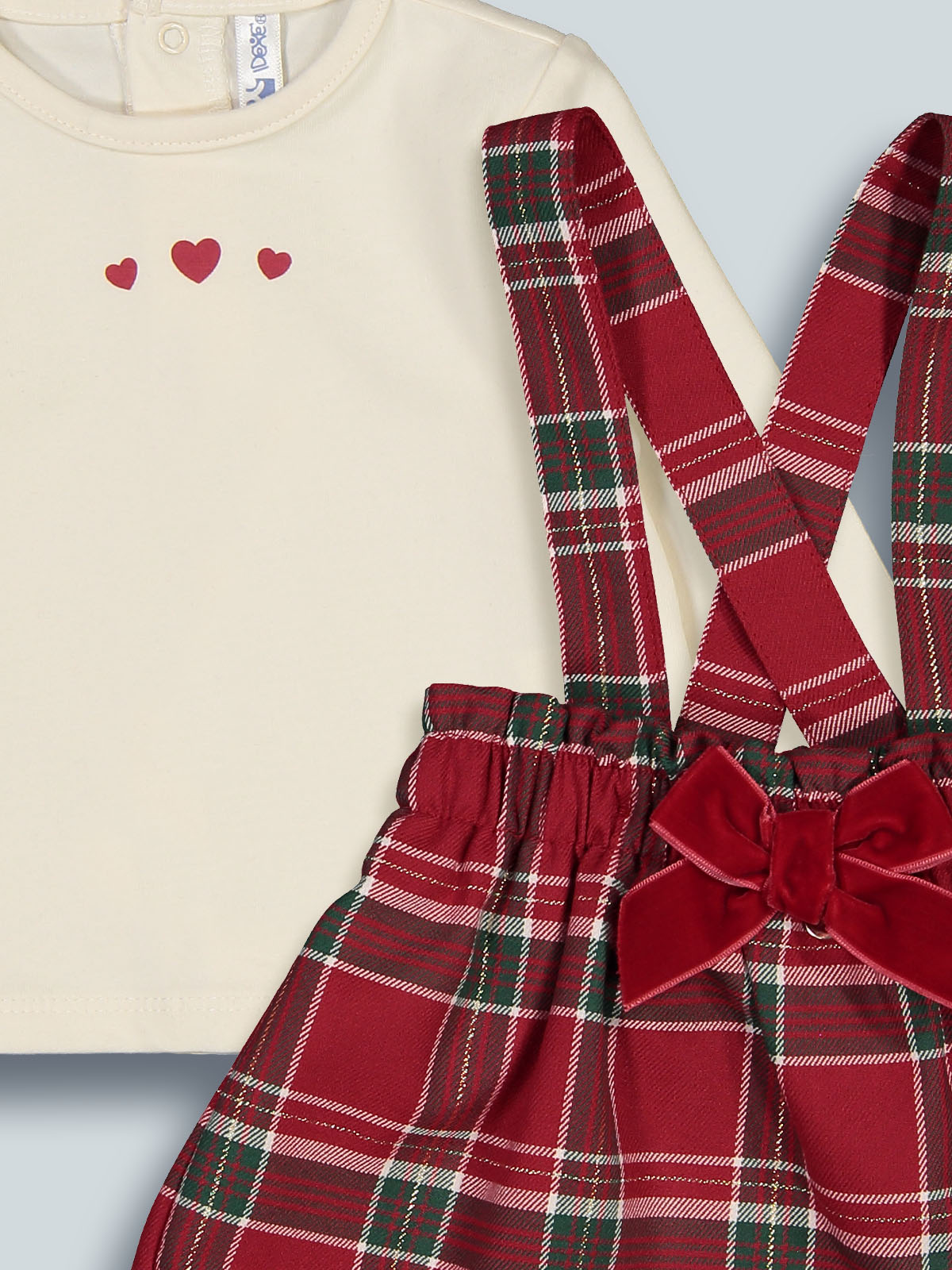 Completo composto da gonna in morbido tessuto flanella fantasia scozzese con lurex. Comode e pratiche bretelle staccabili. Vita elasticata per maggiore comodità. Fiocco e placchetta davanti per impreziosire ulteriormente il capo. Tshirt caldo cotone elasticizzato con stampa cuori. Il completo ideale per le feste natalizie.