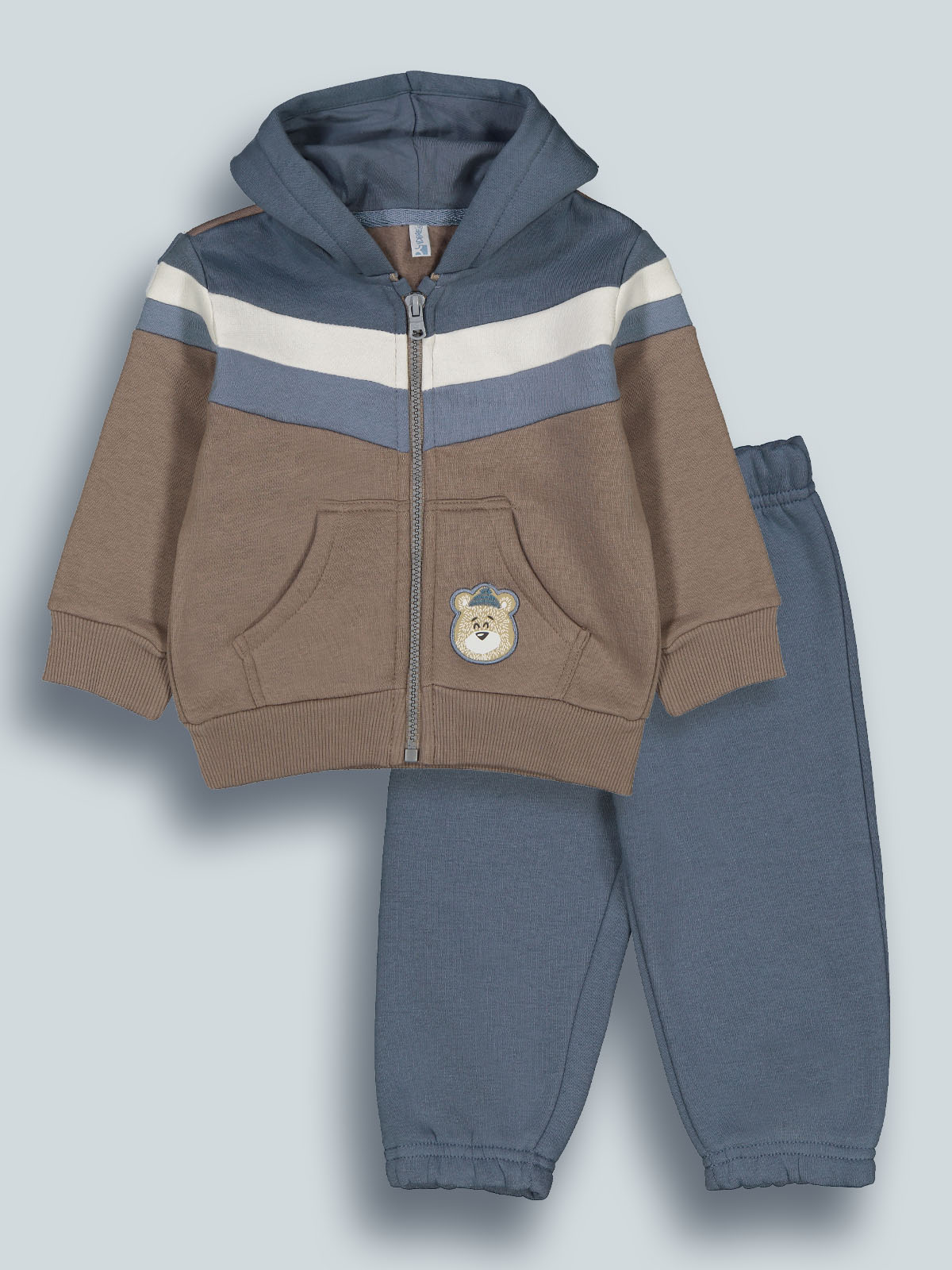 Completo due pezzi in mista calda felpa ideale per le giornate più fredde. Cardigan con cappuccio, colori a contrasto effetto color block. Aperto davanti con zip, morbida costina per polsi e fondo, tasche ed etichetta sul davanti. Pantaloni con vita e fondo gambe elasticati. L’interno di questo capo è lavorato in modo tale che le fibre del tessuto si sollevino, rendendolo più morbido, soffice e caldo sulla pelle. Ideale per i momenti di sport e per il tempo libero.