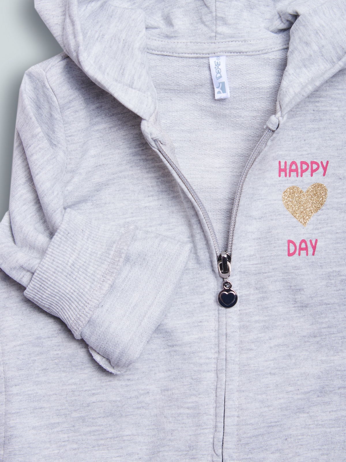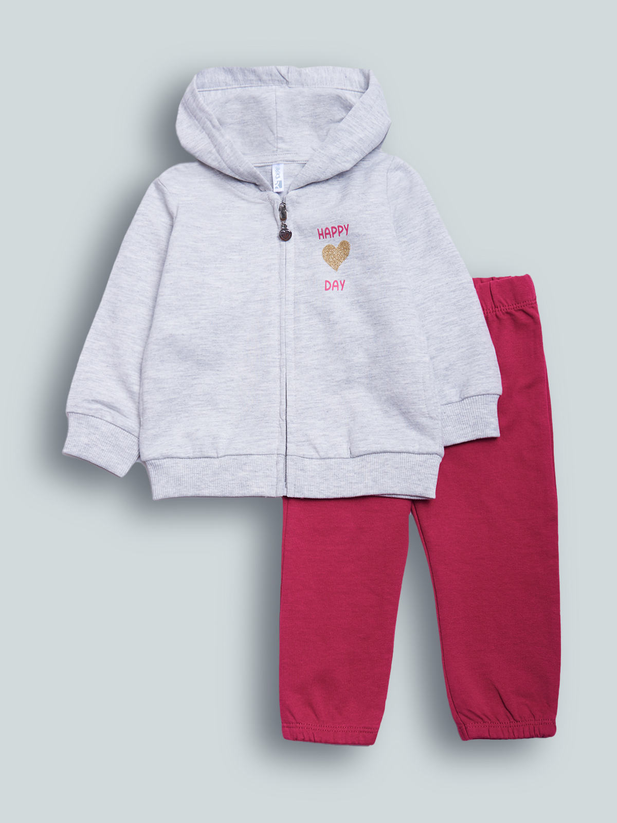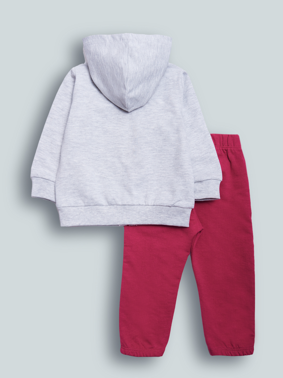 Completo due pezzi in Morbida felpa leggera. Cardigan Melange Manica lunga con cappuccio. Polsi e fondo in costina. Simpatica stampa scritta con glitter. Pantaloni con vita e fondo elasticati per Maggiore comodità. Un completo Molto pratico con dettagli fashion.