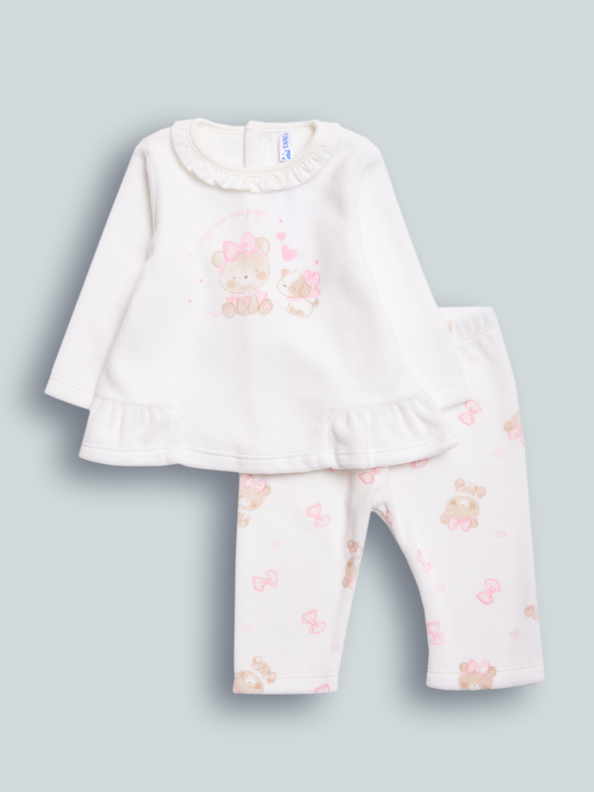 Completo due pezzi composto da Maglia in ciniglia tinta unita. Pratica apertura totale sul dietro con bottoncini a pressione. L’arricciatura sui fianchi e il girocollo bordato con rouches aggiunge un tocco femminile. Tenera stampa davanti. Pantalone in ciniglia stampata, vita elasticata. Un capo Molto pratico e ideale per essere sempre al passo con la Moda.