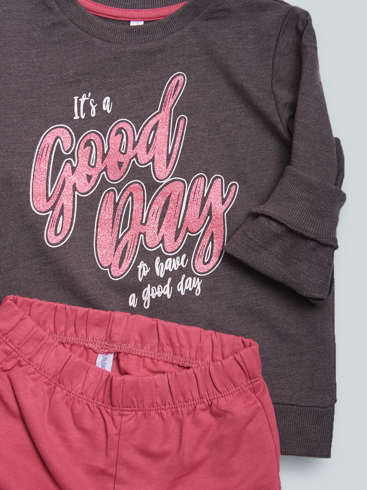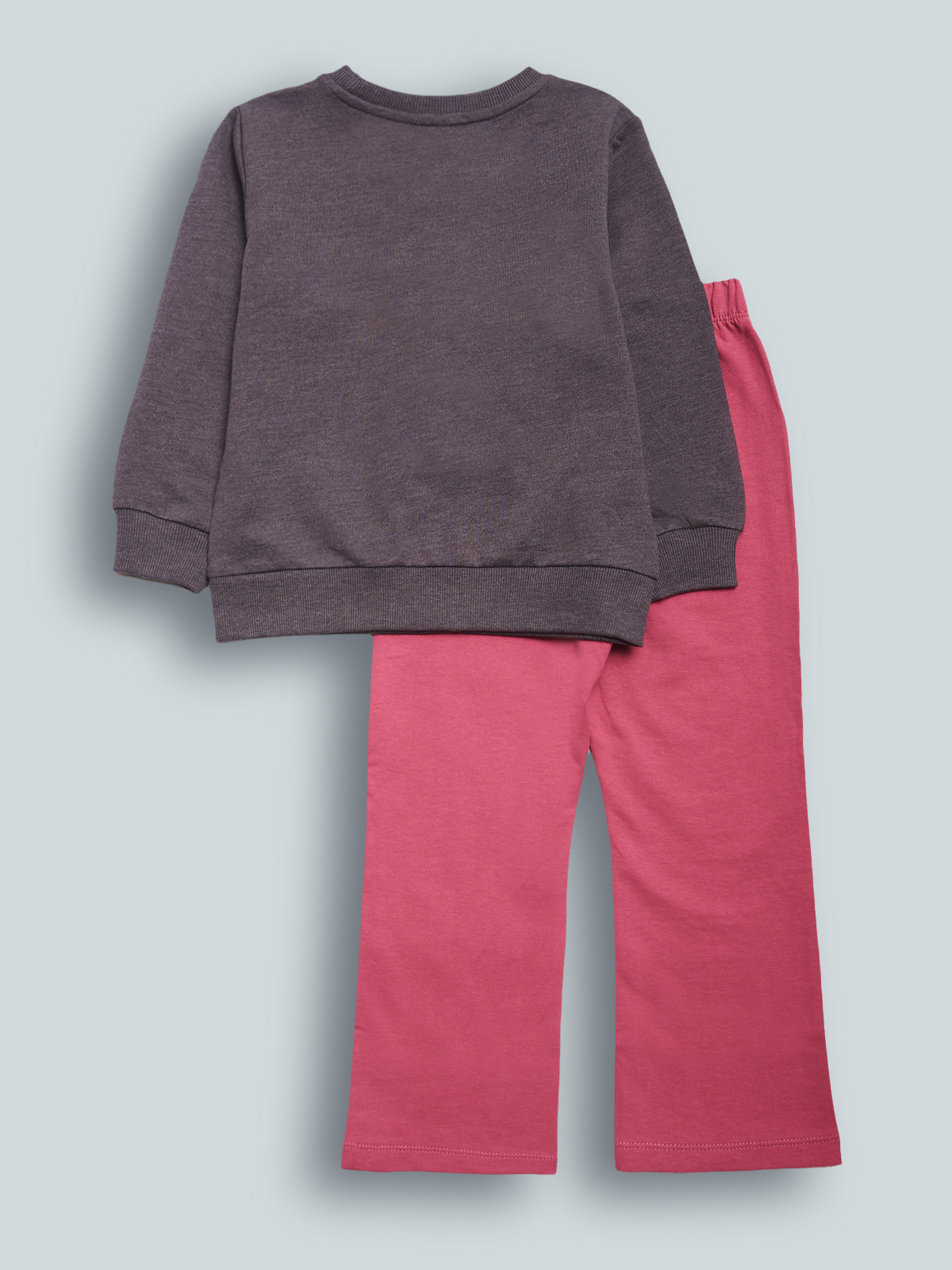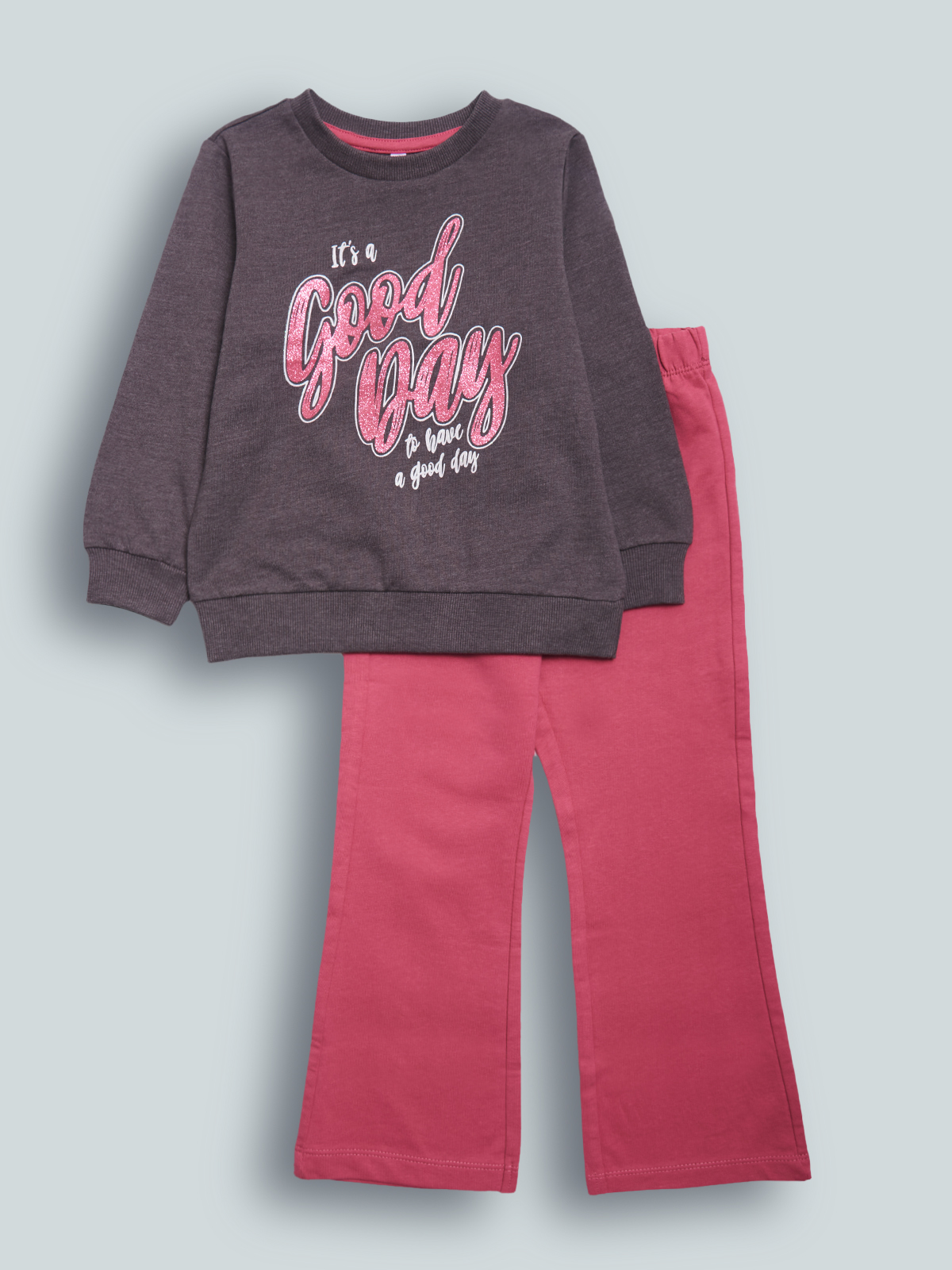 Completo due pezzi. Maglia in Morbida e Mista felpa Melange girocollo e Manica lunga. Scritta con glitter sul davanti. Pantaloni in Morbida felpa Modello bootcut e vita elasticata per Maggiore comodità. Un capo comodo e glam perfetto per la scuola e non solo.