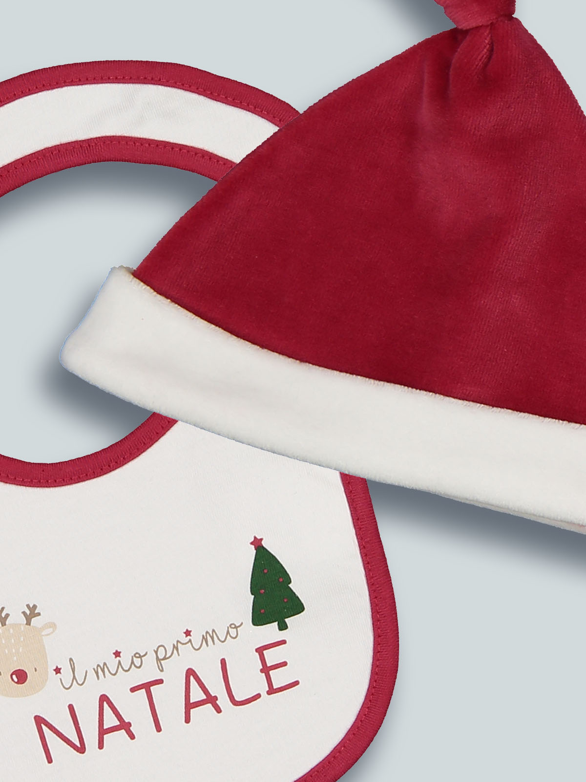 Completo composto da cappellino in soffice ciniglia e bavetta in morbido cotone da indossare la notte di Natale, da abbinare alla tutina natalizia.
