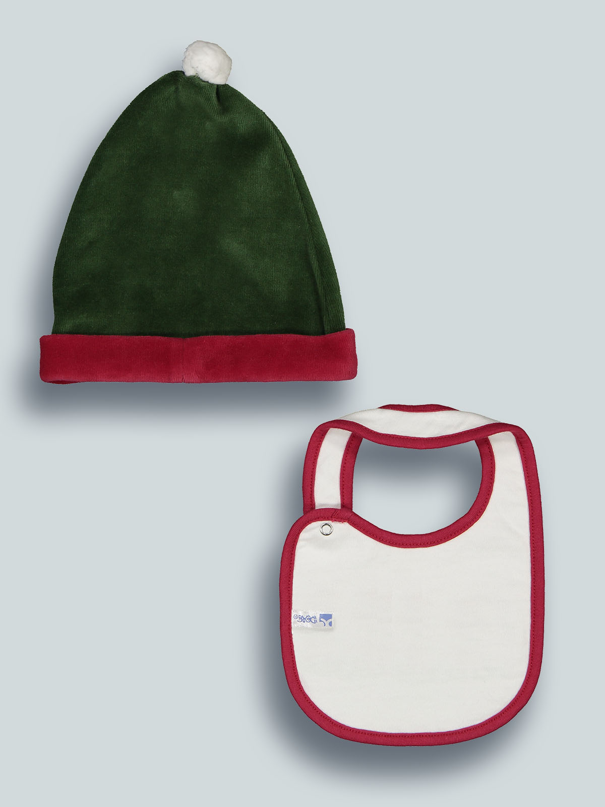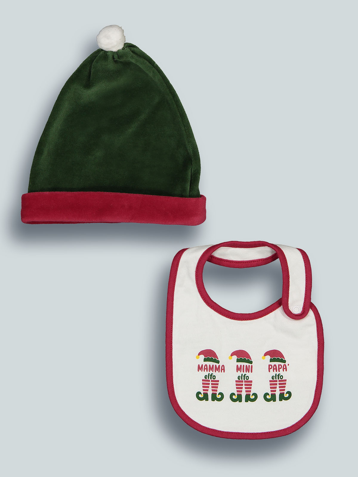 Completo composto da cappellino in soffice ciniglia e bavetta in morbido cotone da indossare la notte di Natale, da abbinare alla tutina natalizia.