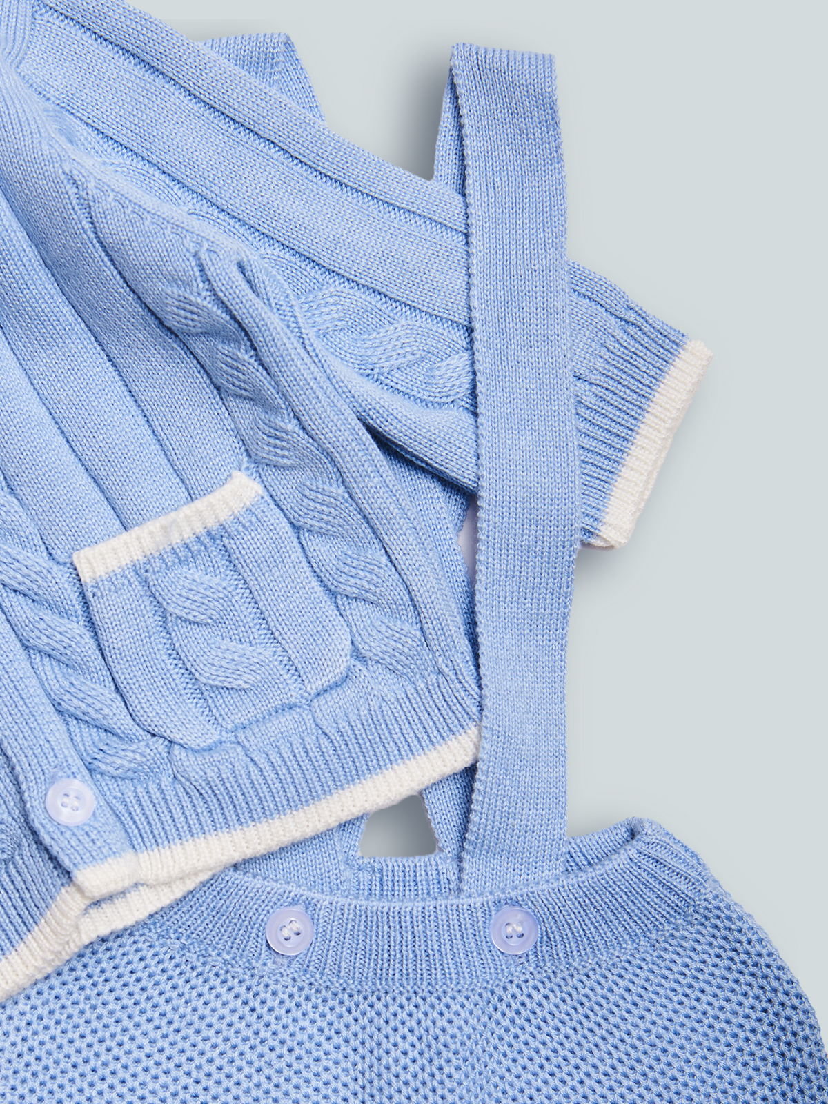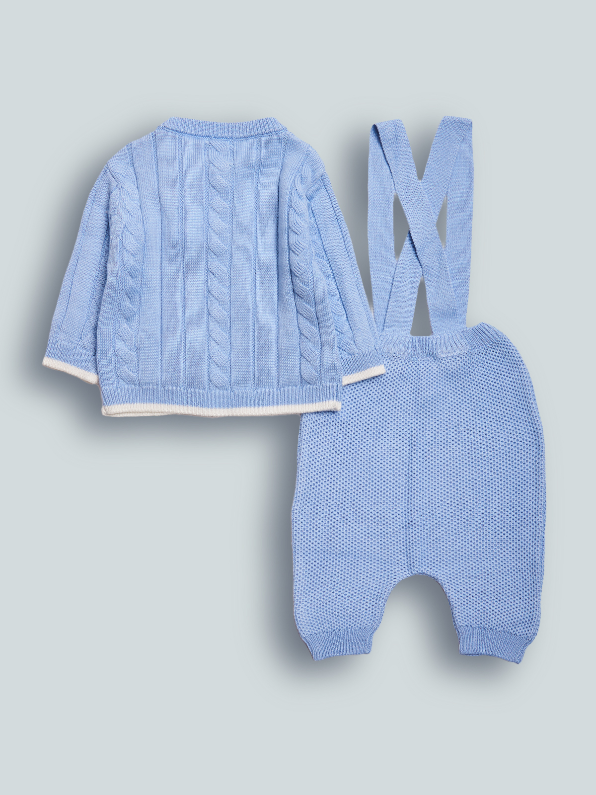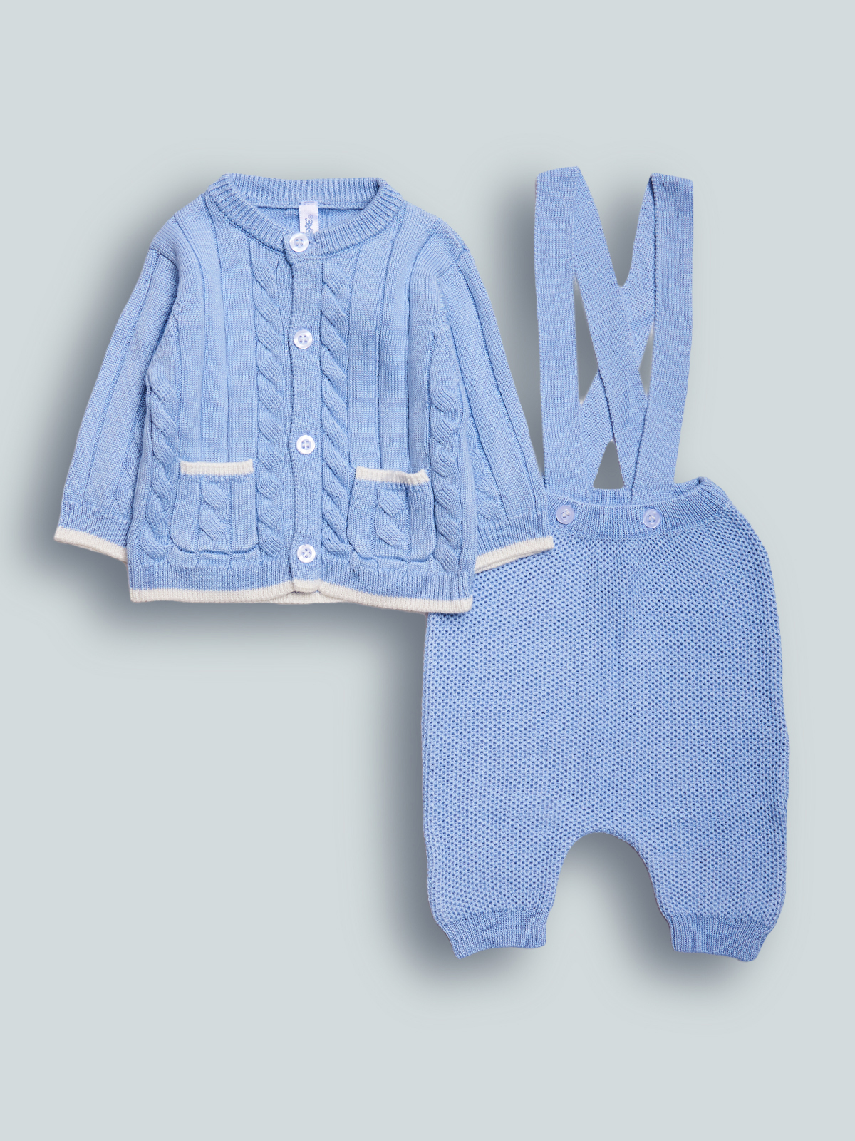 Completo due pezzi in morbida maglia tricot. Il cardigan è dotato di un’apertura integrale sul davanti con bottoni per una comoda e veloce vestizione, il pantalone con morbido elastico in vita dotato di bretelle. Non farti sfuggire comodità ed eleganza in un solo capo.
