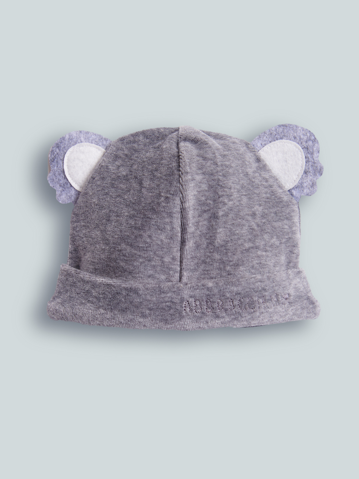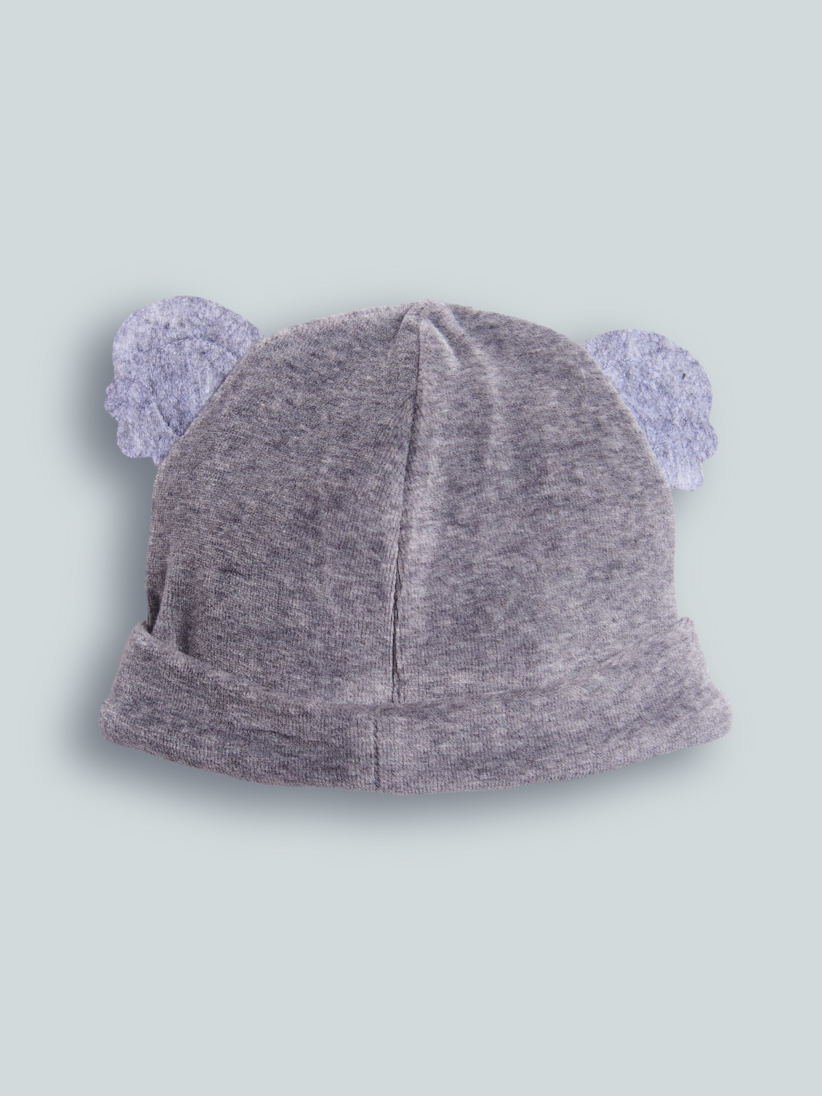 Cuffia in Morbida ciniglia grigio Melange, orecchie 3D. Risvolto con spiritoso ricamo. Questo accessorio fa parte del corredino composto da tutti gli articoli indispensabili per il tuo neonato.