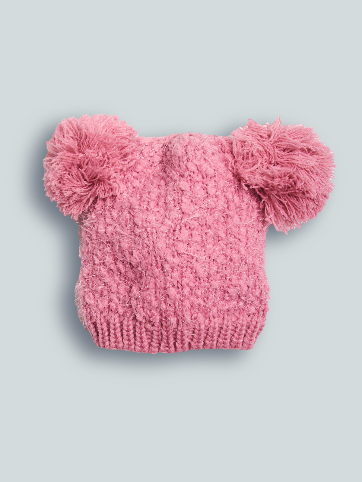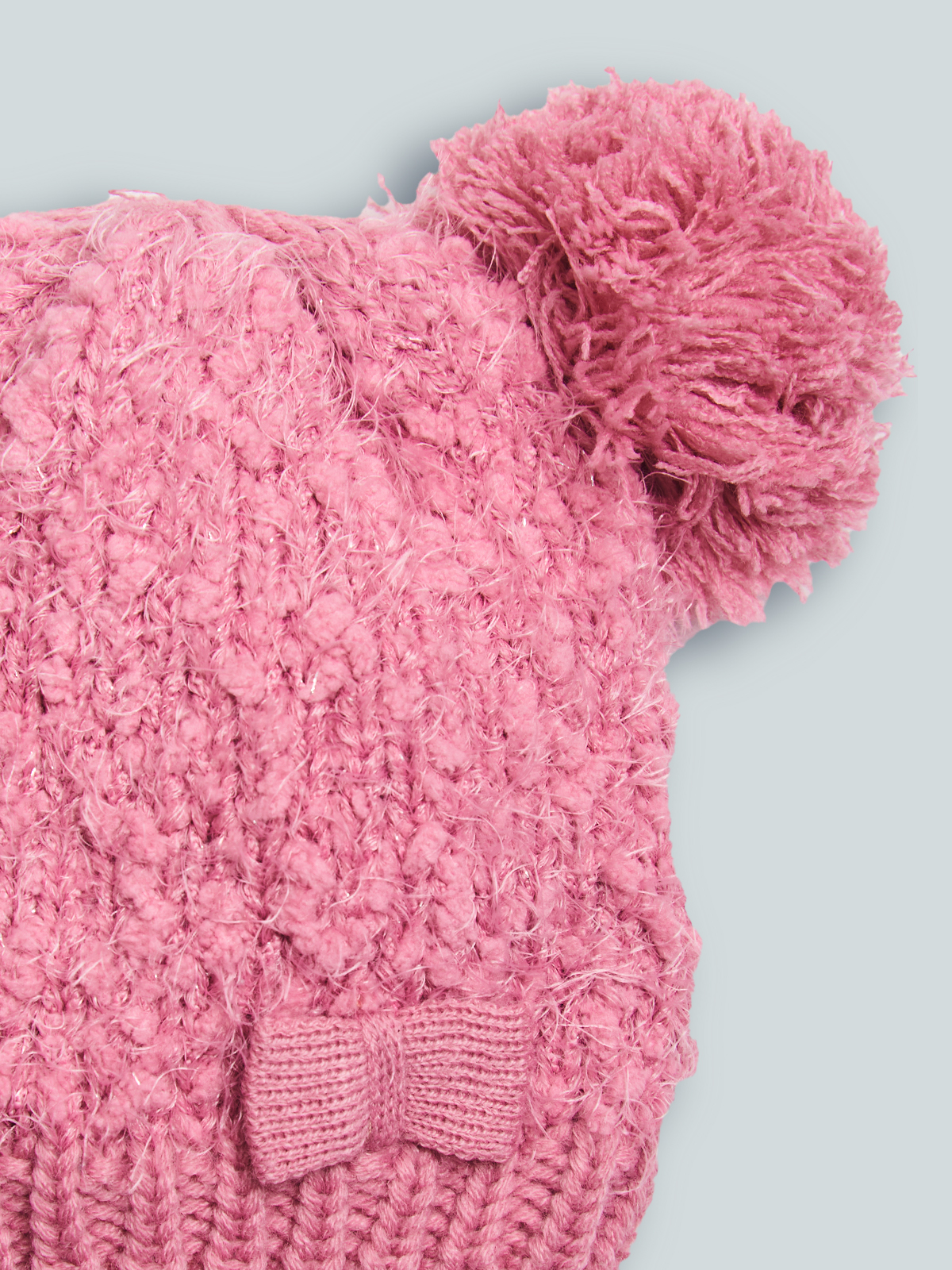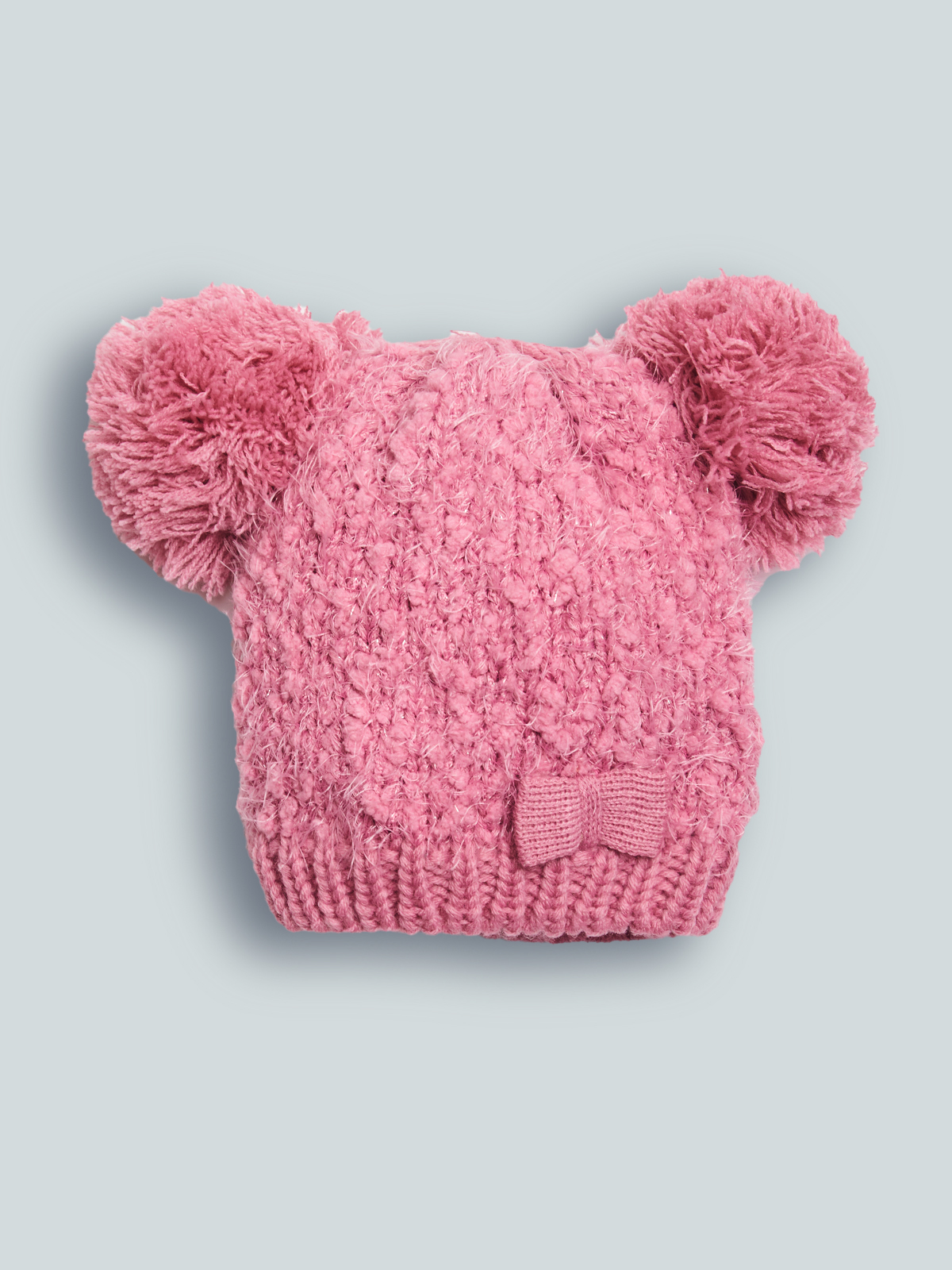Cuffia in morbida ciniglia effetto bouclè con pom pon, impreziosita da fiocco. Ideale per le giornate più fredde.