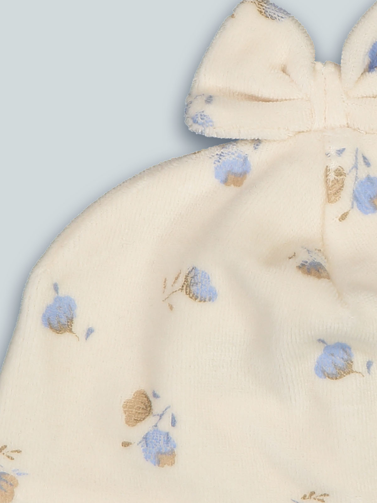 Cuffia in ciniglia stampato fantasia. Questo accessorio fa parte del corredino composto da tutti gli articoli indispensabili per la tua neonata.