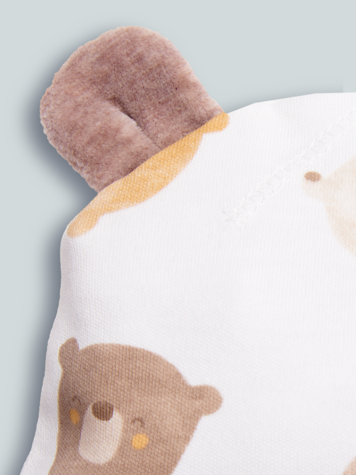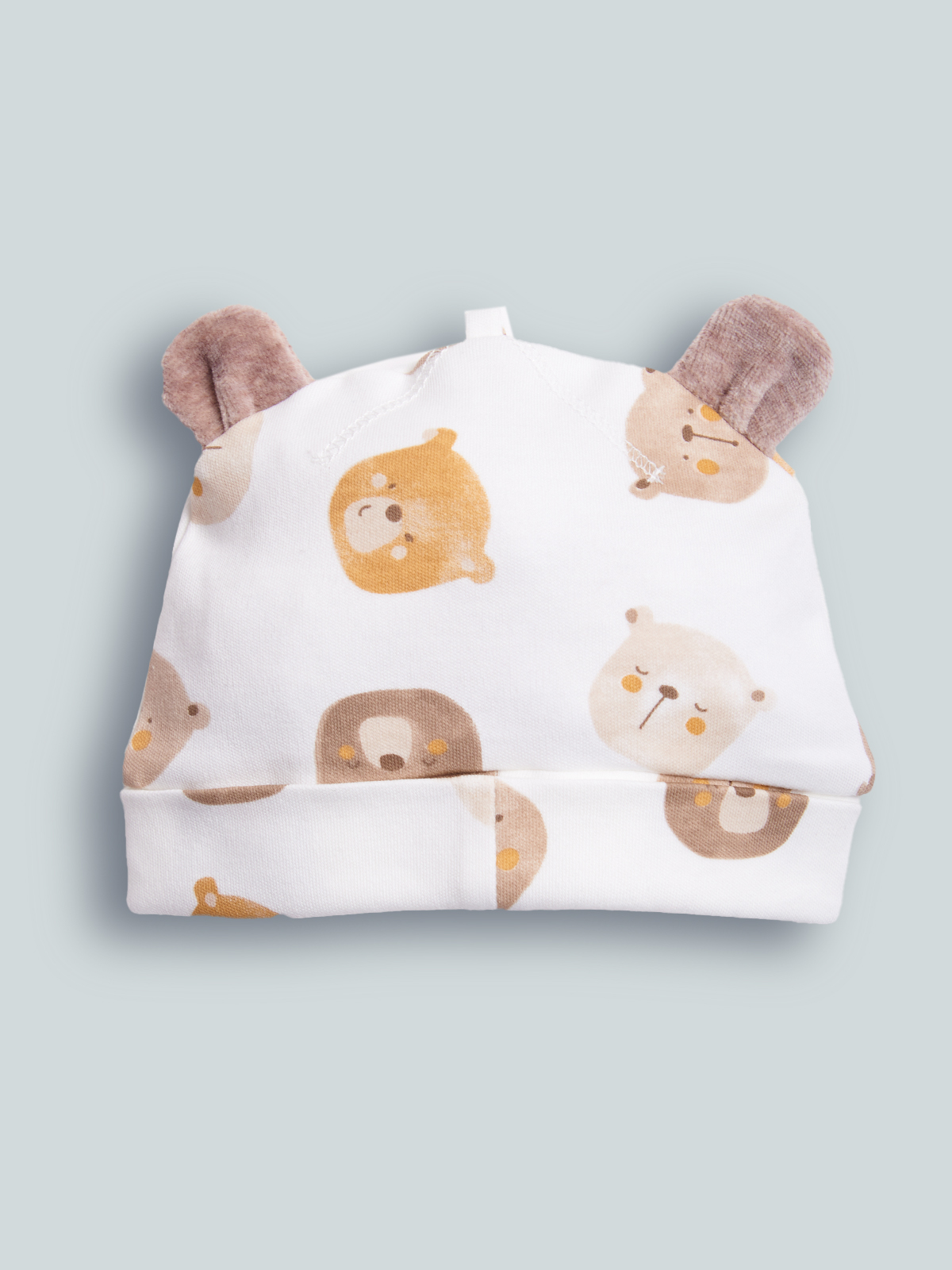 Cuffia in caldo cotone stampato, orecchie 3D. Questo accessorio fa parte del corredino composto da tutti gli articoli indispensabili per il tuo neonato.
