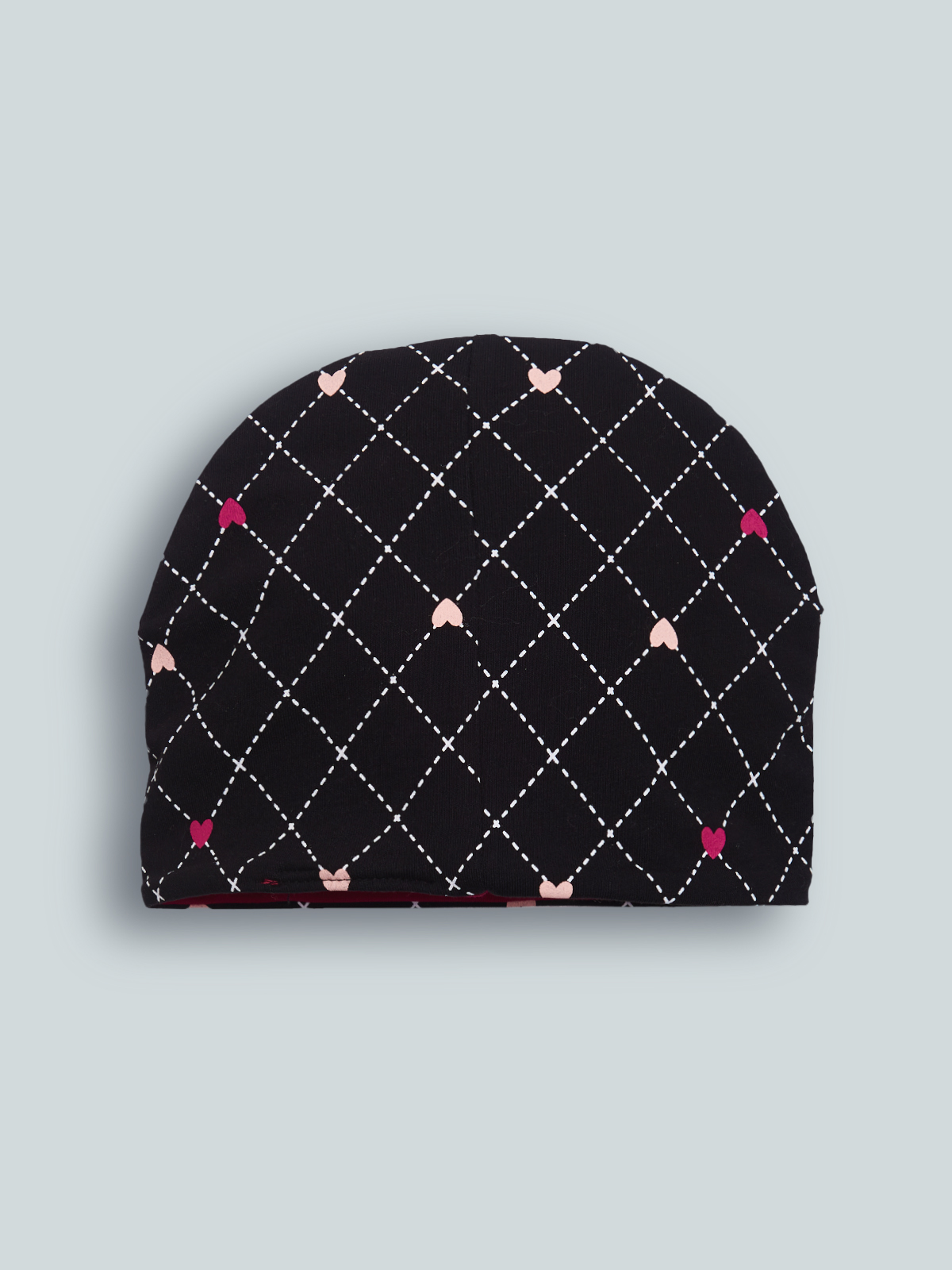 Cuffia in Morbida felpa leggera fantasia cuoricini reversibile tinta unita. Ideale per i primi freddi di stagione e Molto versatile.