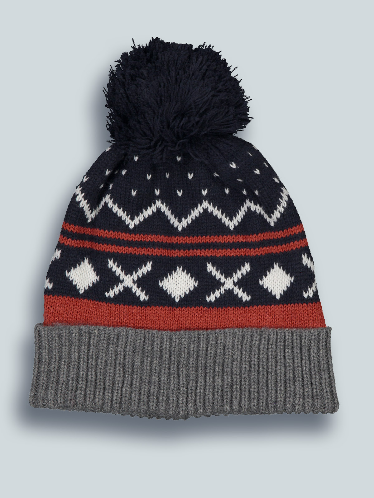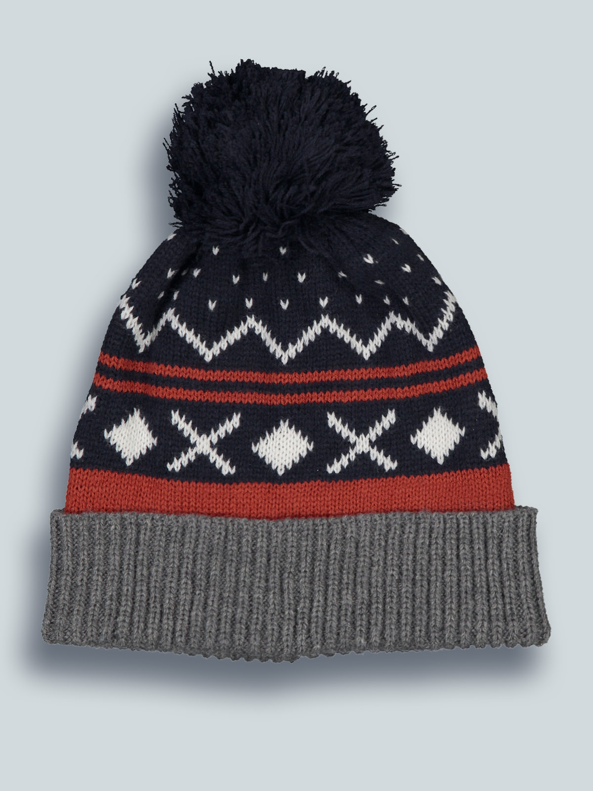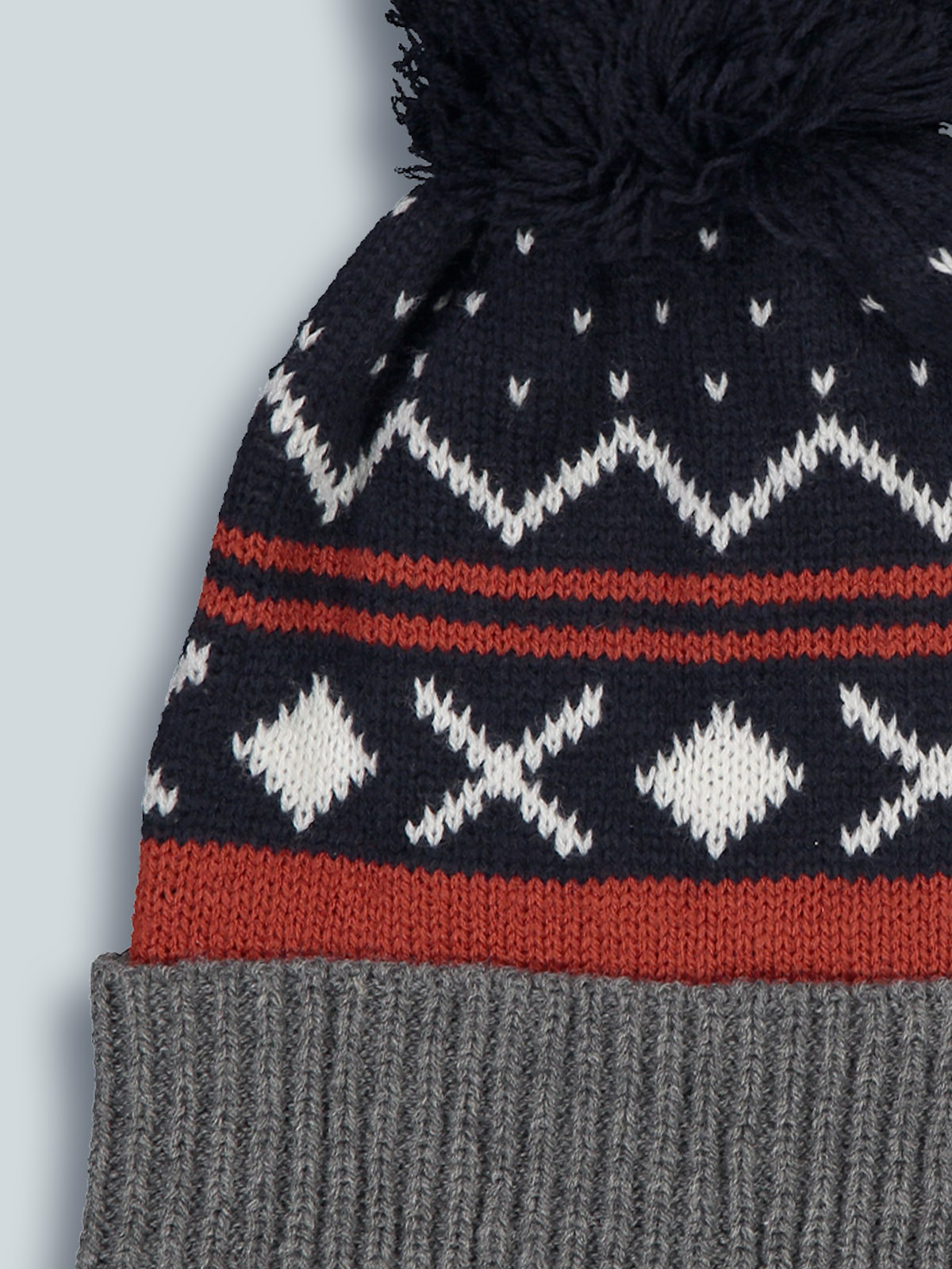 Cuffia in caldo e morbido tricot con lavorazione greche jacquard, pom pon e risvolto melange. Pensata in abbinamento alla sua sciarpa. Il capo ideale per la stagione più fredda.