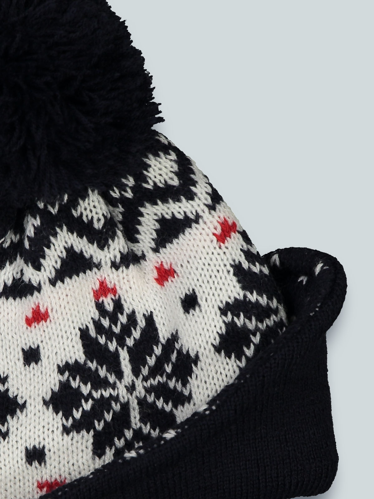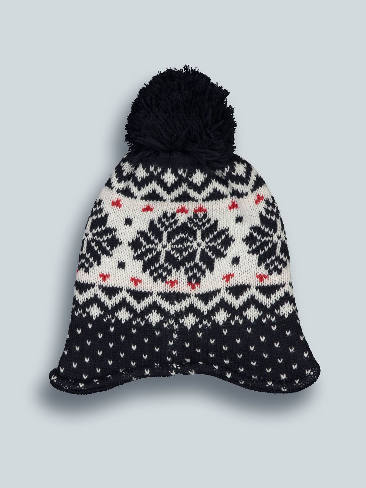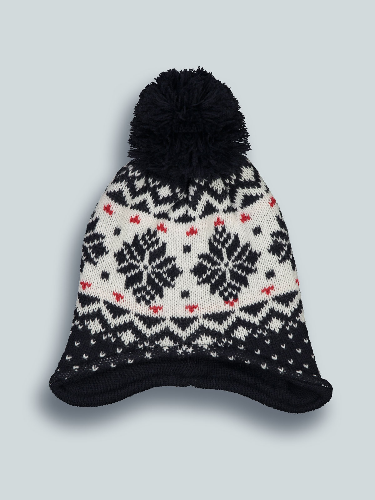 Cuffia in caldo e morbido tricot in una fantasia jacquard che richiama lo stile norvegese. Modello con paraorecchie per rimanere bene al caldo. Il capo ideale per l’inverno più pungente.