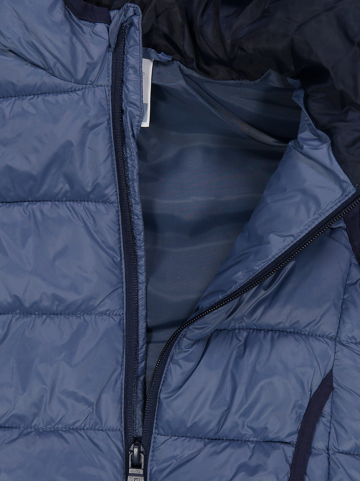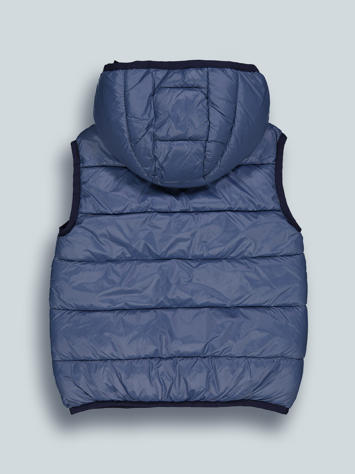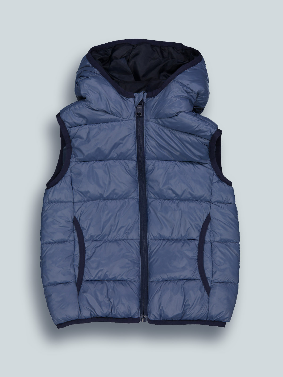 Gilet con cappuccio, in nylon trapuntato leggero con morbida ovatta. Aperto davanti con zip, bordi in fettuccia elasticata, tasche davanti, fodera in nylon. Un capo adatto ai primi freddi, perfetto per la scuola e il tempo libero.