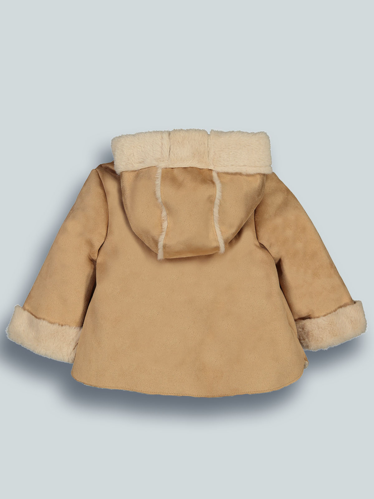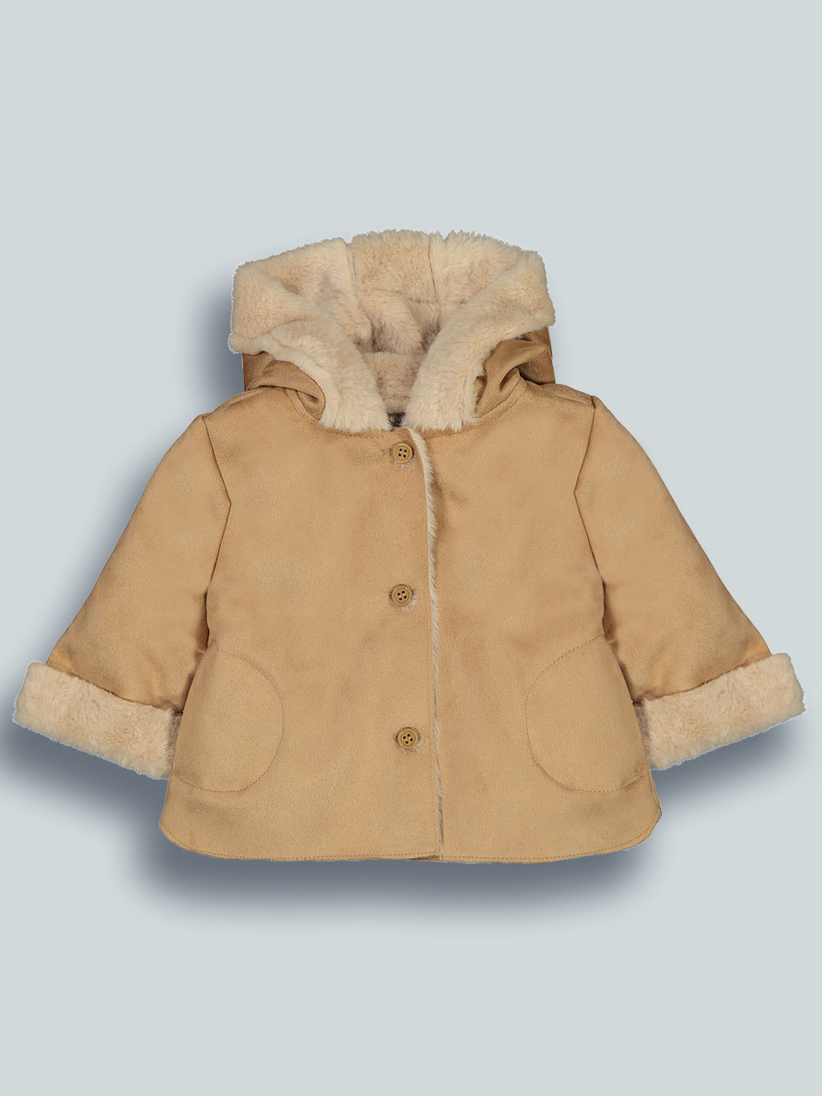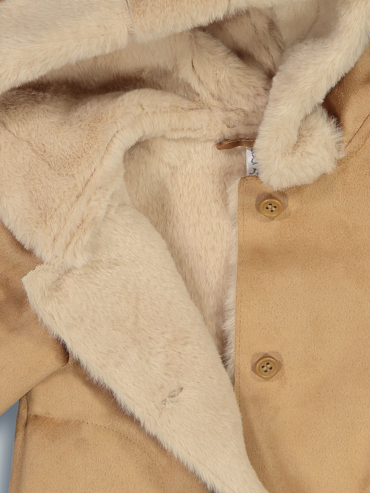 Giubbotto in tessuto effetto scamosciato con morbido peluches all’interno. Cappuccio e maniche lunghe rifinite con risvolto. Pratico da indossare grazie all’apertura frontale con bottoni. Un capo caldo e alla moda, ideale per la stagione invernale.