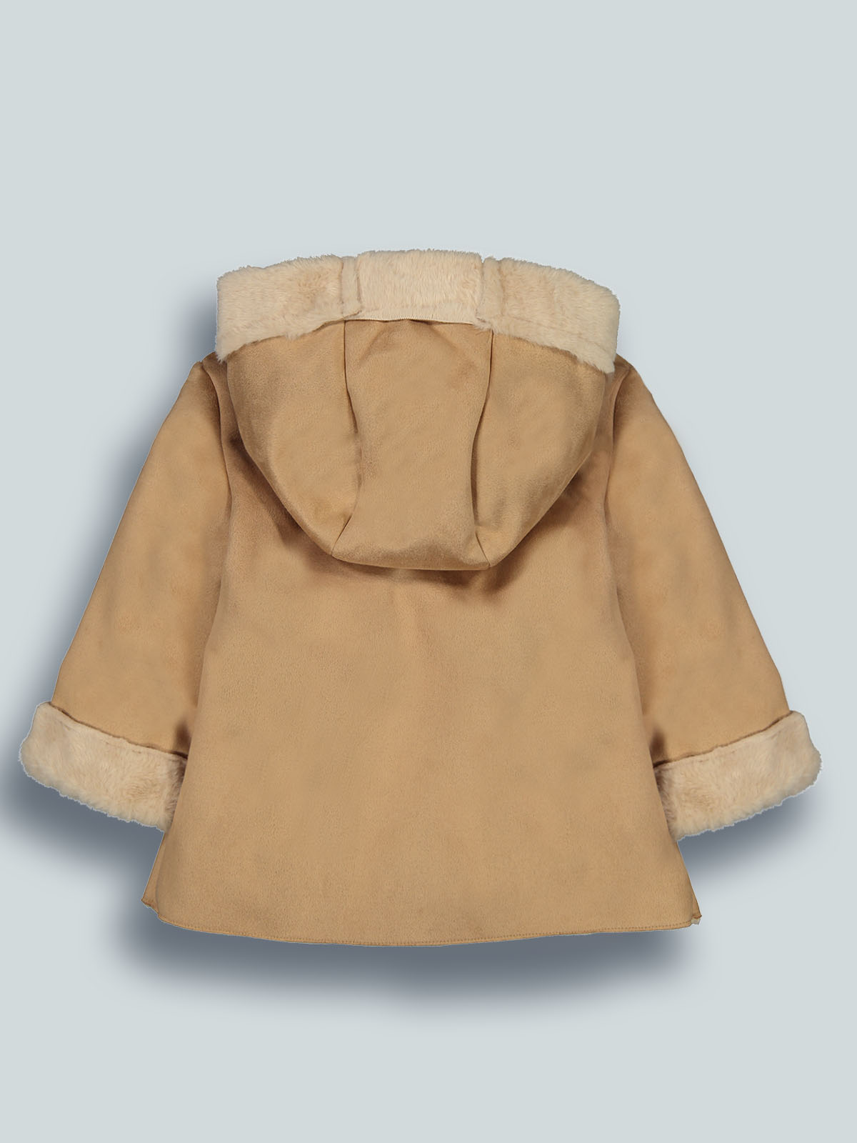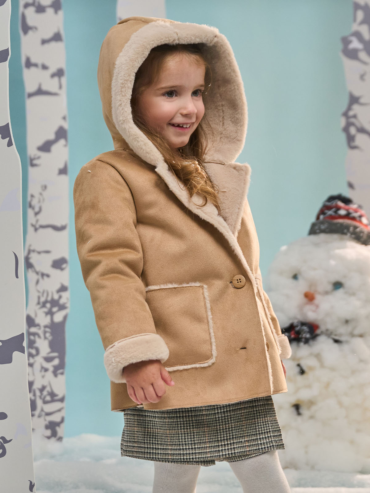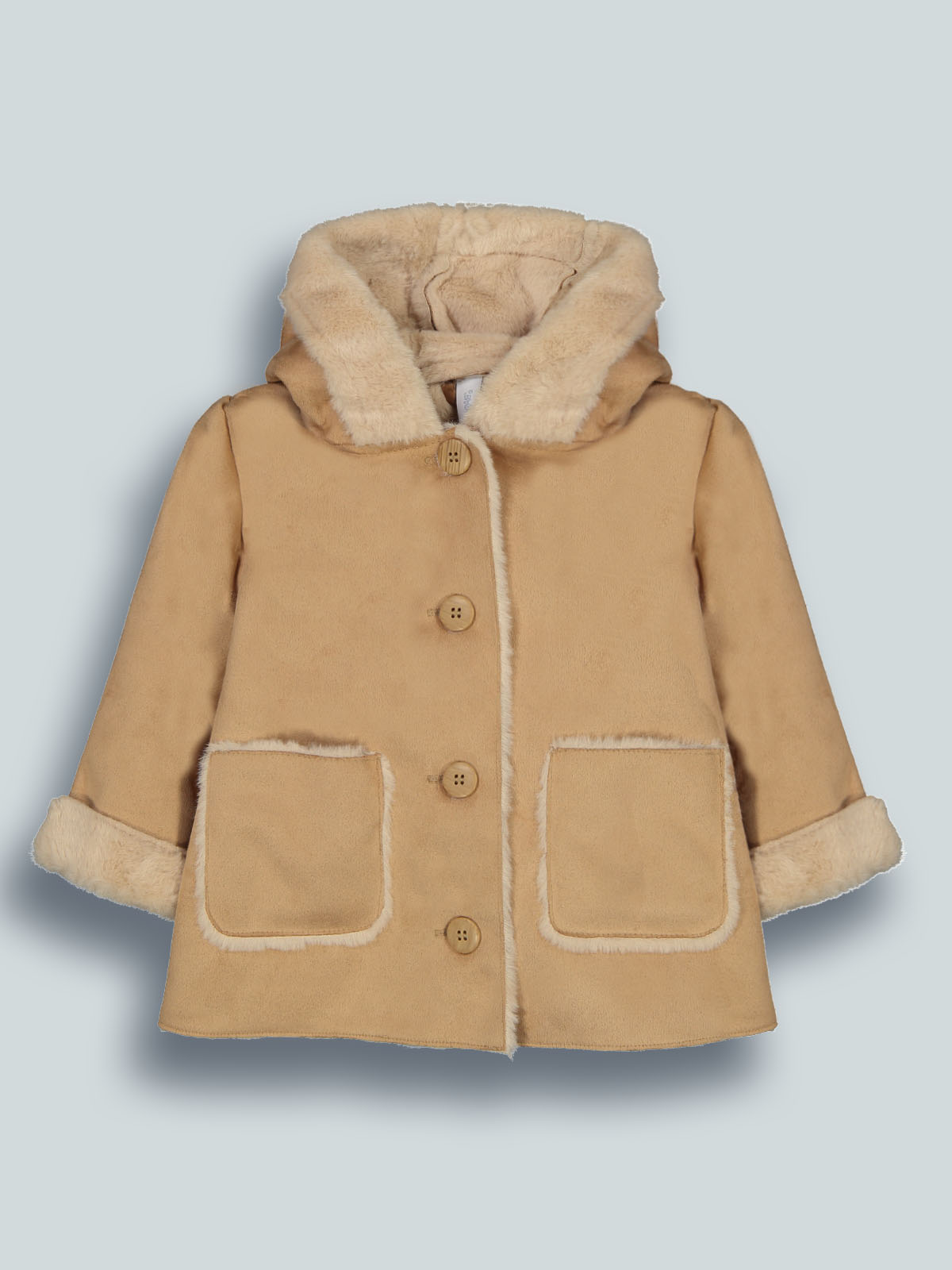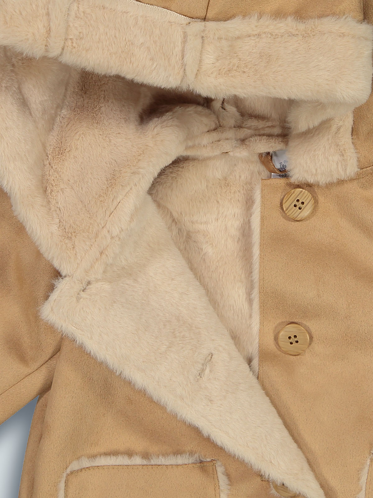 Giubbotto in tessuto effetto scamosciato con morbido peluches all’interno. Cappuccio e maniche lunghe rifinite con risvolto. Pratico da indossare grazie all’apertura frontale con bottoni. Tasche applicate sul davanti per maggiore femminilità. Un capo caldo e alla moda, ideale per la stagione invernale.
