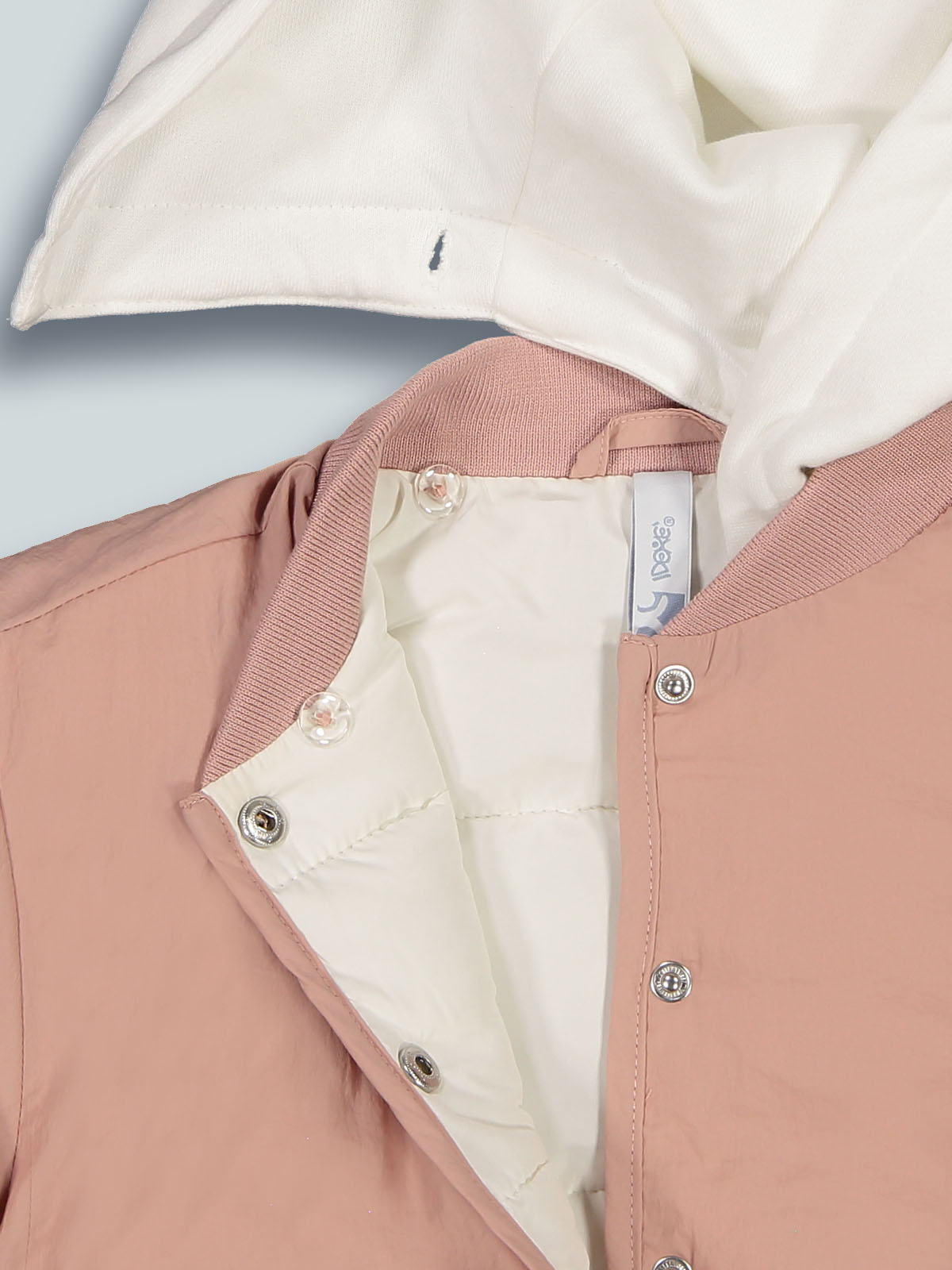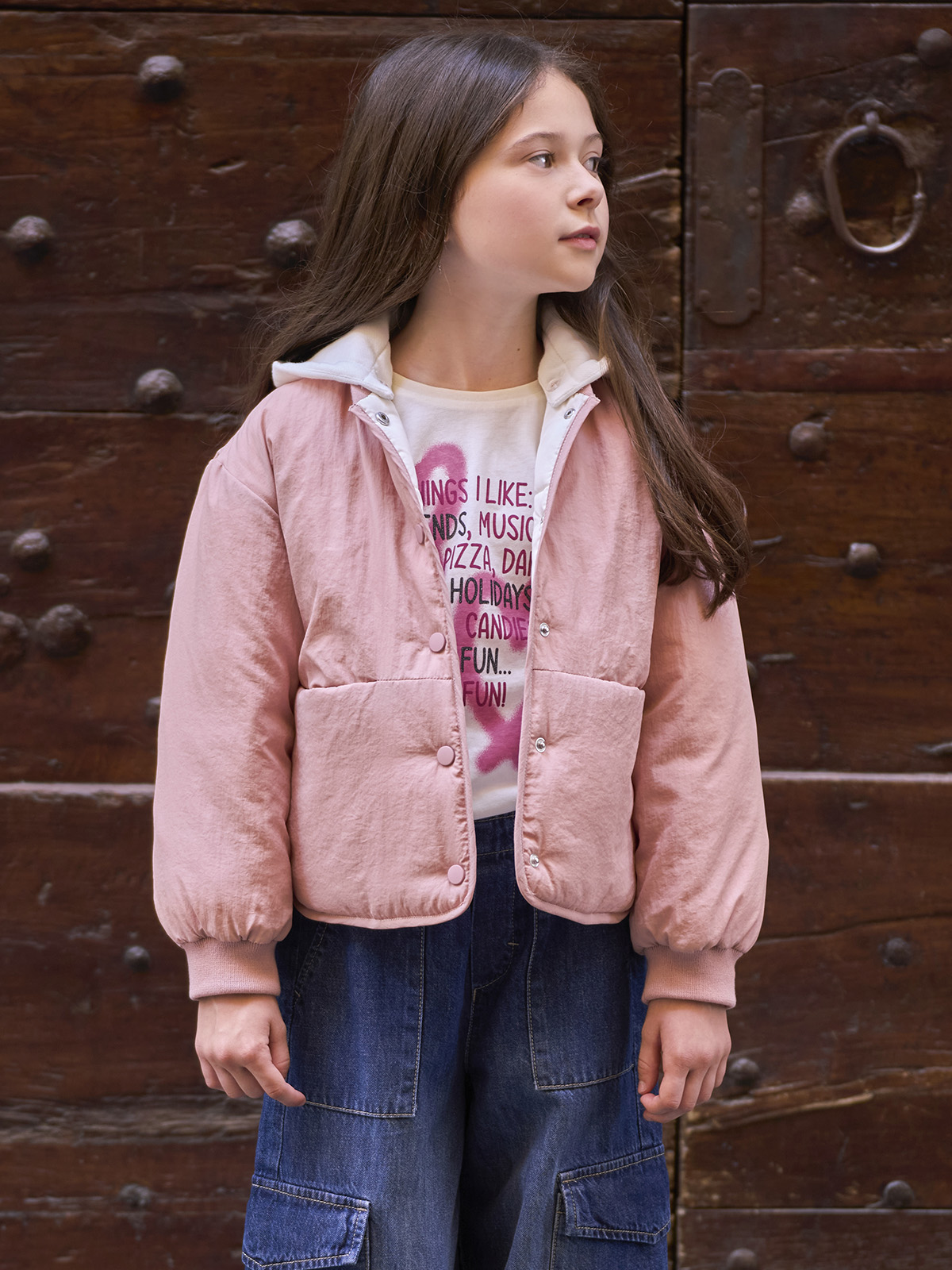 Giubbotto imbottito leggero con morbida ovatta e cappuccio in felpa staccabile. Apertura anteriore con snap in tono. Un capo ideale per i primi freddi da sovrapporre a una felpa. Un capo molto pratico per la scula e il tempo libero.