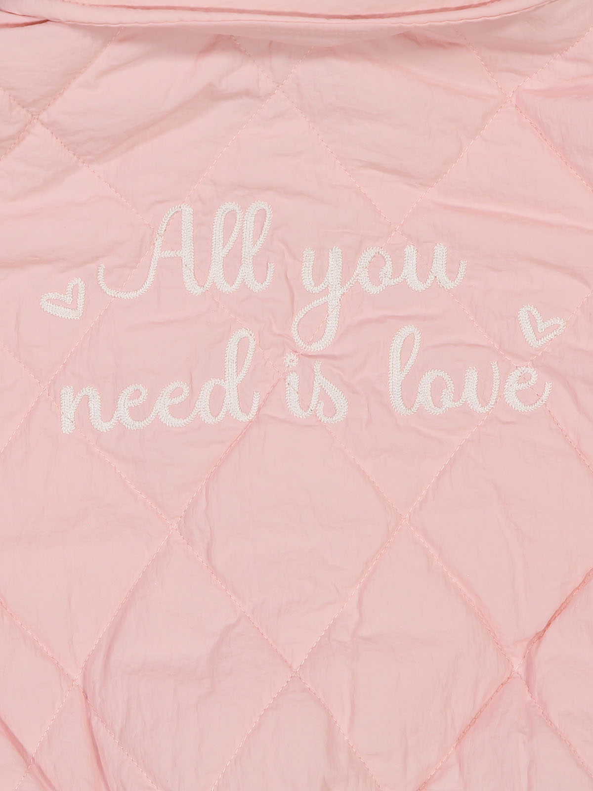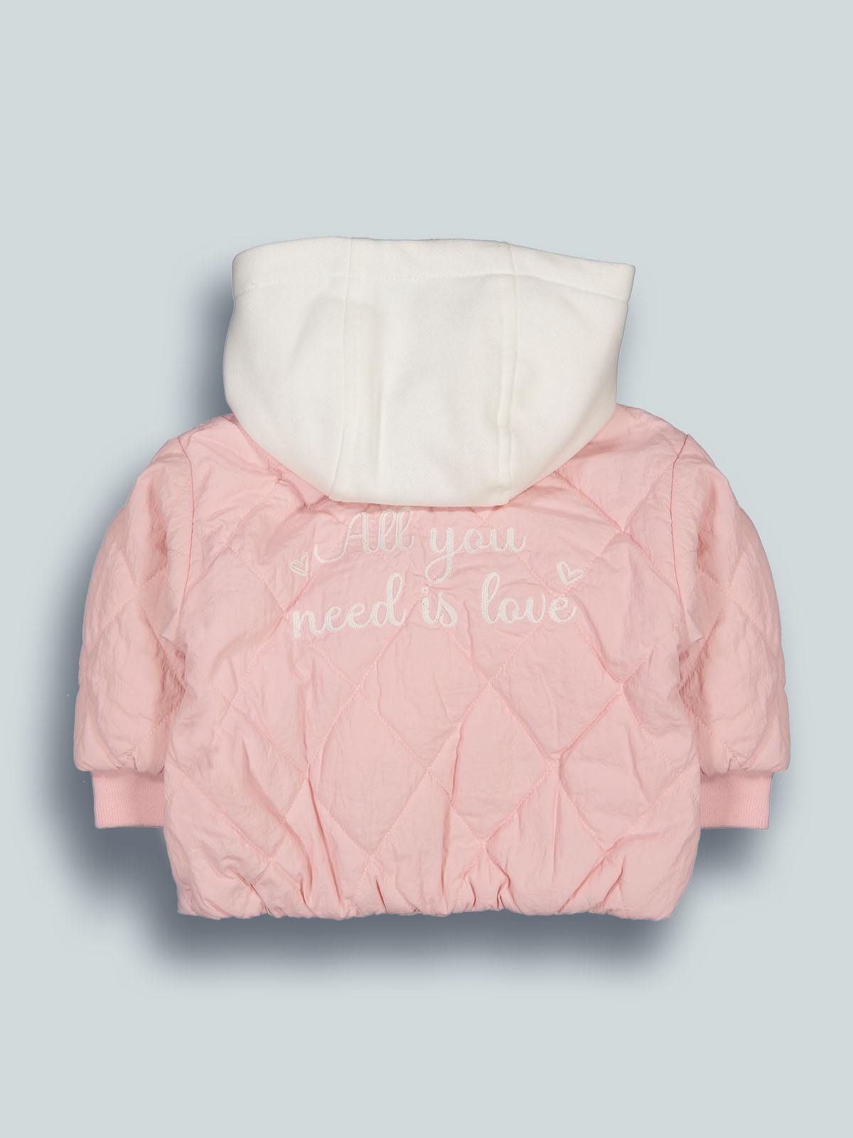 Giubbotto in nylon, imbottito leggero con morbida ovatta. Cappuccio staccabile tramite bottoncini in morbida felpa. Pratico da indossare grazie all’apertura frontale con bottoni. Romantica stampa scritta sul dietro. Ideale da portare nelle giornate autunnali e non solo.