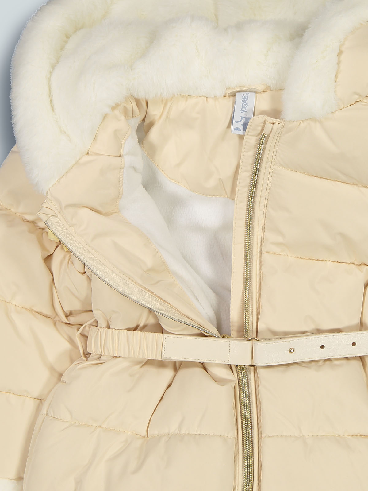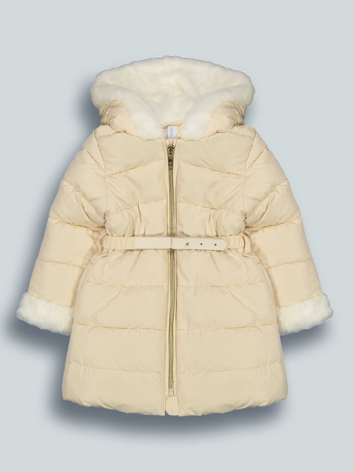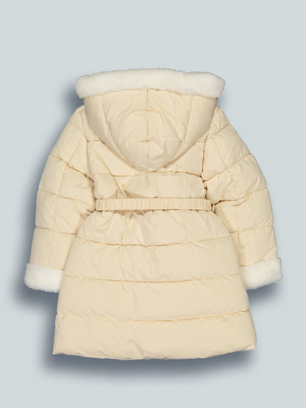 Giubbotto lungo imbottito con cappuccio in nylon. Apertura zip frontale e puller oro, cintura staccabile con inserto in tessuto spalmato. Pelouches per interno cappuccio e per inserto fondo maniche. Un capo caldo e comodo per affrontare l’inverno con un tocco glam.