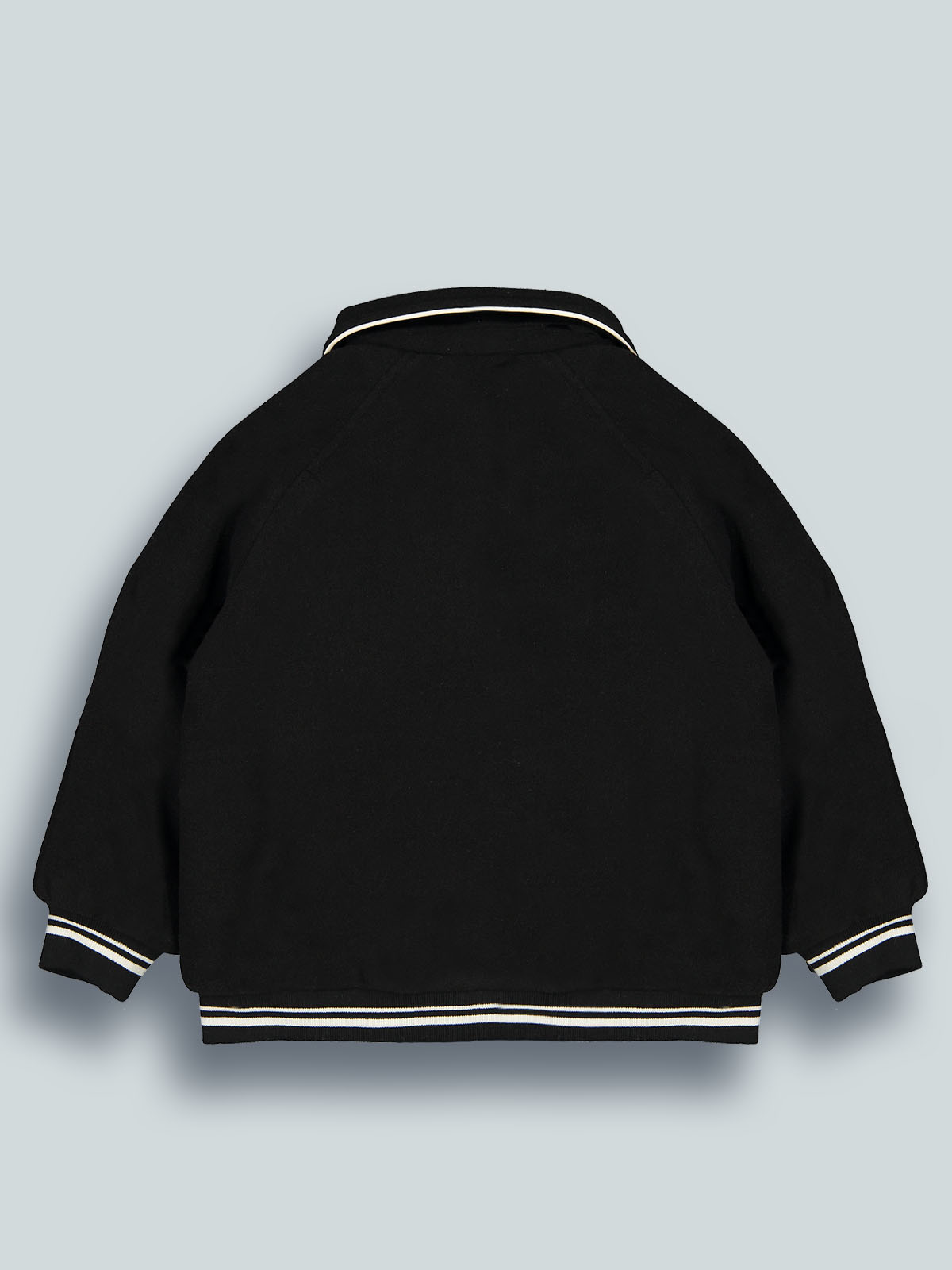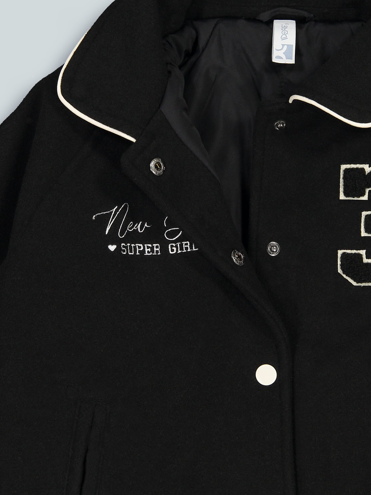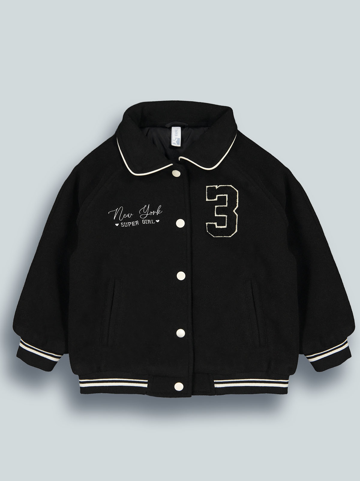 Giubbotto manica lunga in panno con colletto rotondo e leggera imbottitura. Apertura anteriore con snap in contrasto di colore. Costine rigate per polsi e fondo. Ricamo e numero con effetto punto spugna sul davanti. Un capo molto confortevole e pratico, ideale per il back to school e per i primi freddi di stagione.