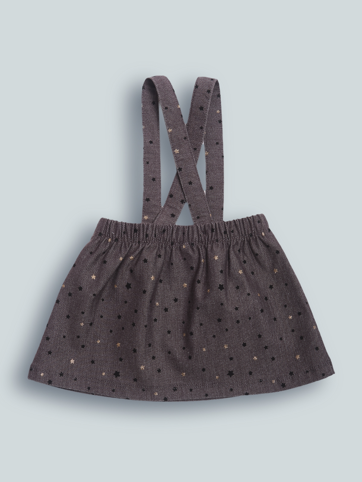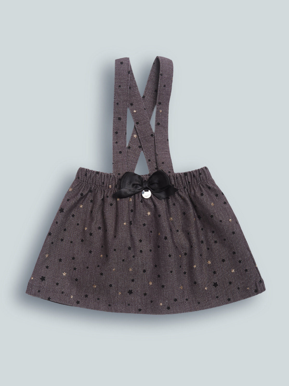 Gonna in Morbida e calda Maglia diagonale elasticizzata fantasia stelle con glitter, bretelle removibili. Vita elasticata decorata da fiocco in raso e Medaglietta. Un capo estremamente pratico da indossare tutti i giorni ed essere sempre alla Moda!