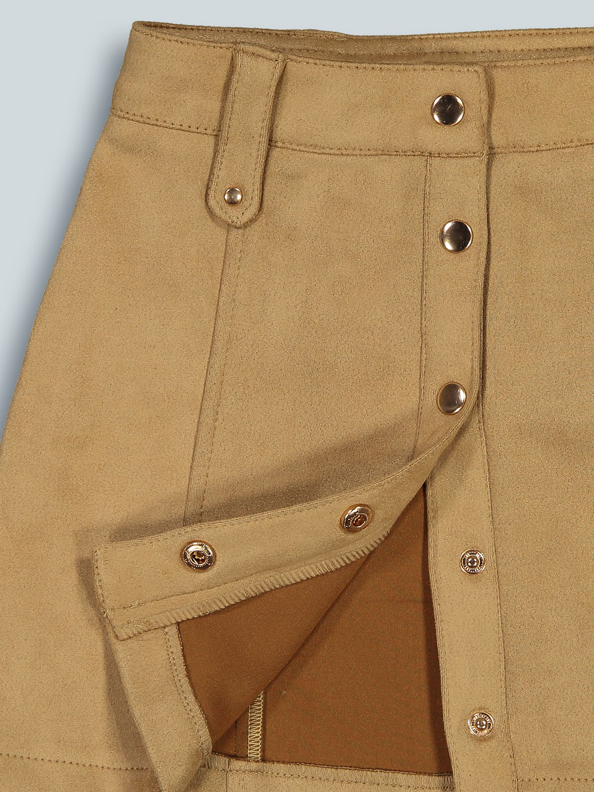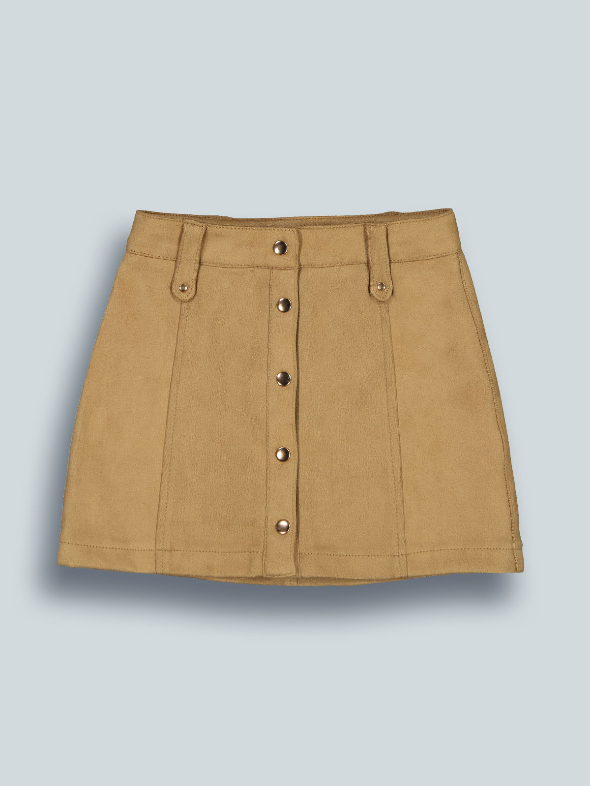Gonna in tessuto effetto scamosciato, apertura anteriore con bottoni automatici. Vita regolabile per maggiore comodità di indosso. Un capo super trendy.